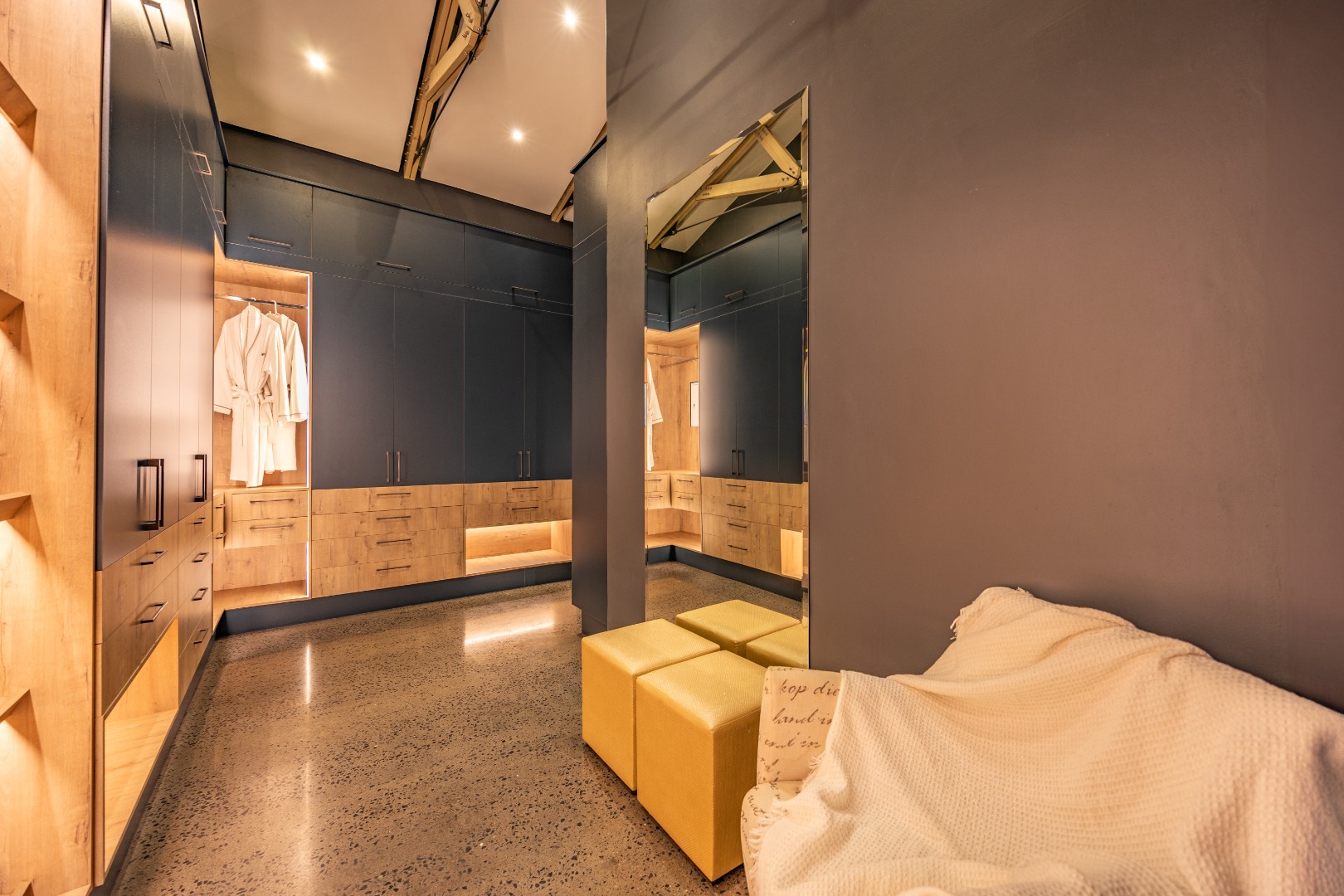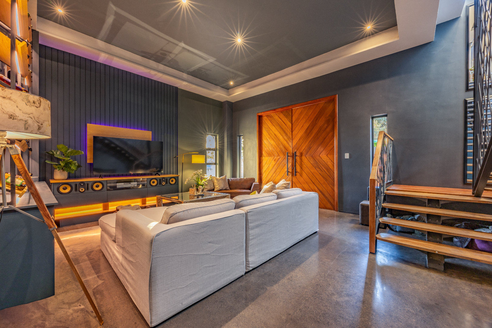 The soundproof living room, with its built-in gas fireplace, offers warmth and comfort. It also opens onto the outdoor area, creating a seamless connection with nature.