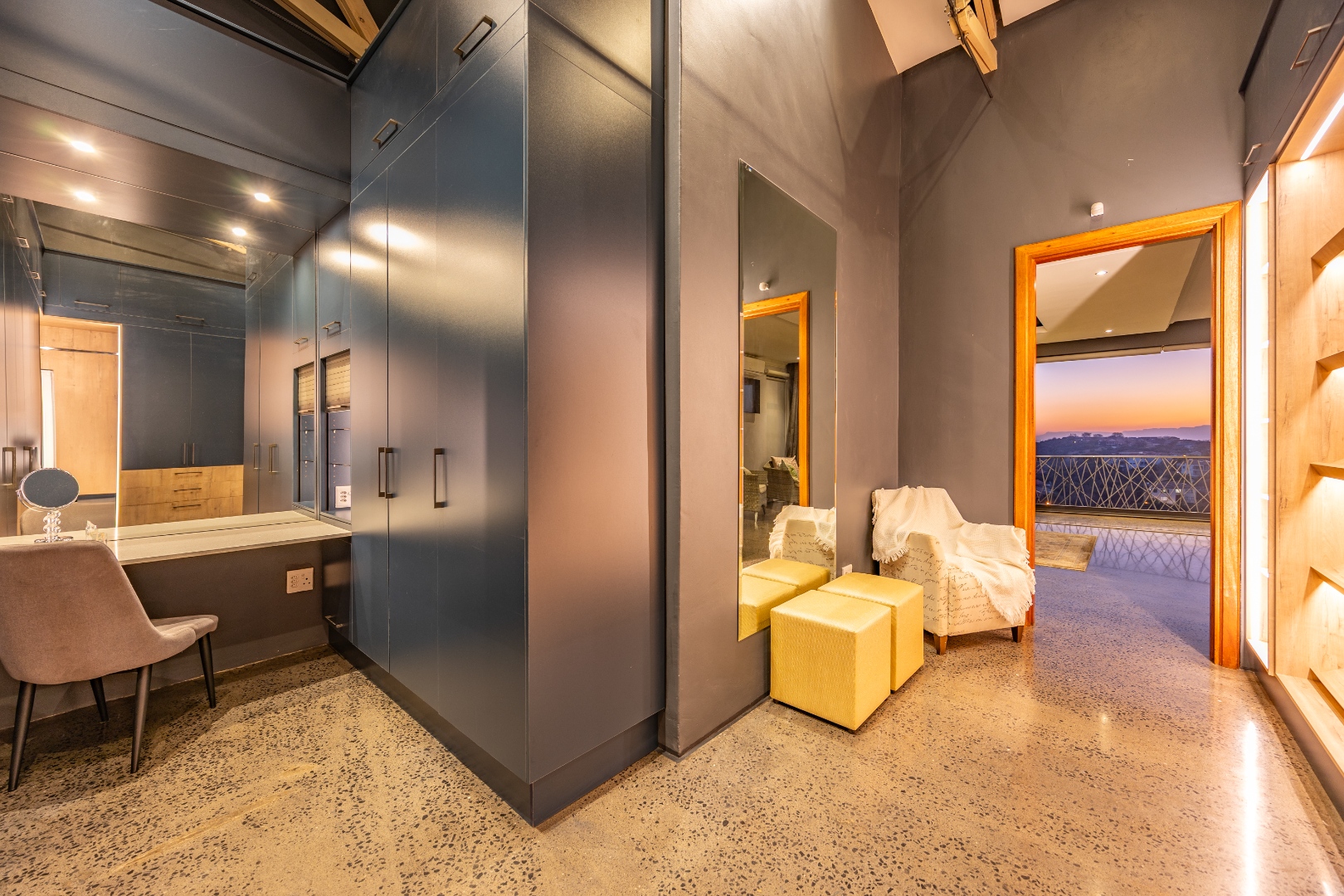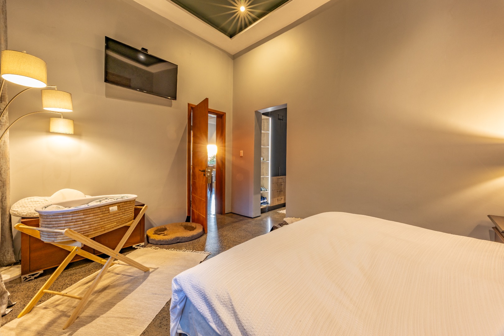The top floor hosts three spacious en-suite bedrooms, each opening onto a large balcony with a built-in fireplace — ideal for enjoying sunsets or quiet mornings. The main bedroom is a true sanctuary, featuring a walk-in closet, luxurious bathroom, and full-length glass doors that open entirely to let in the natural beauty of the estate.