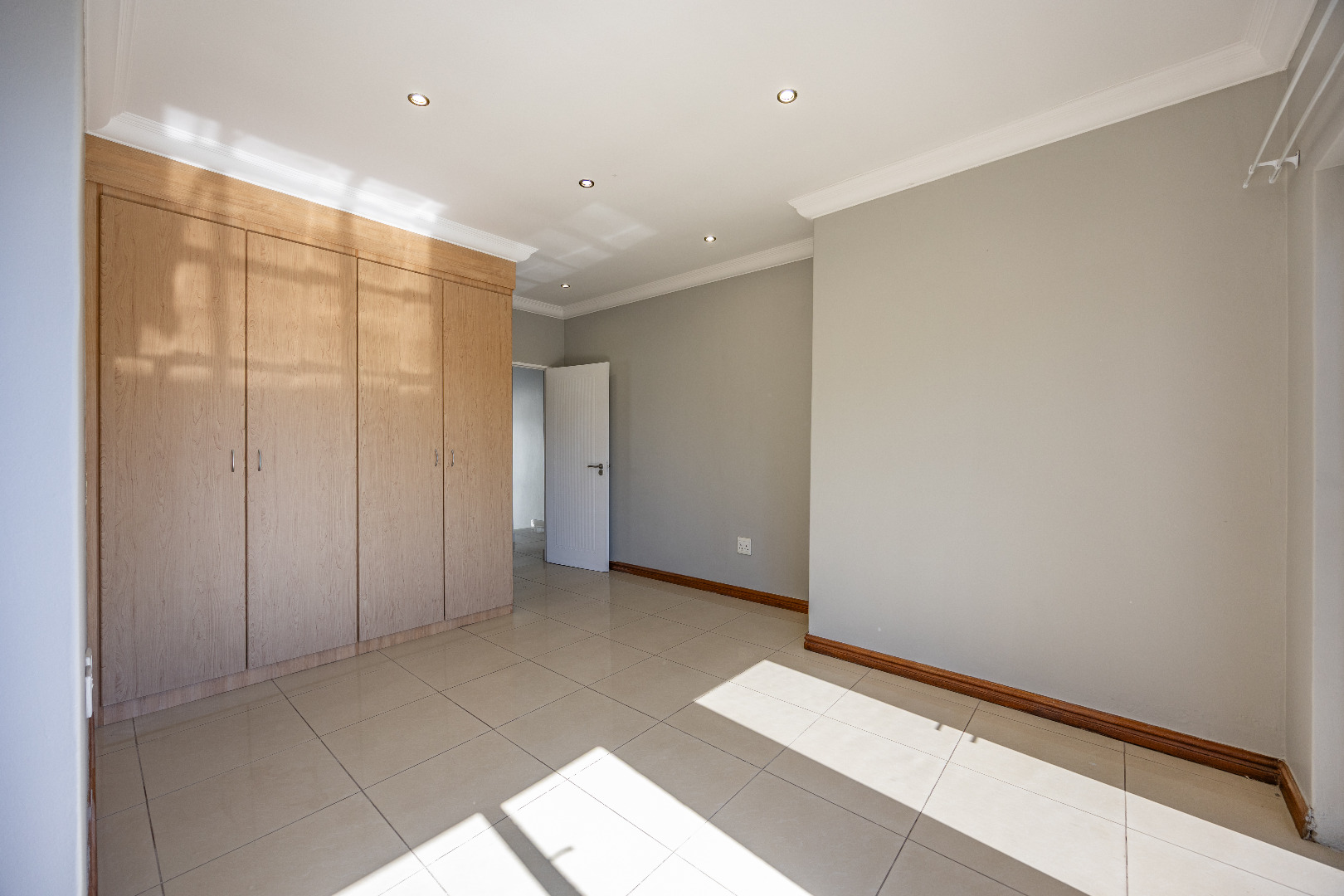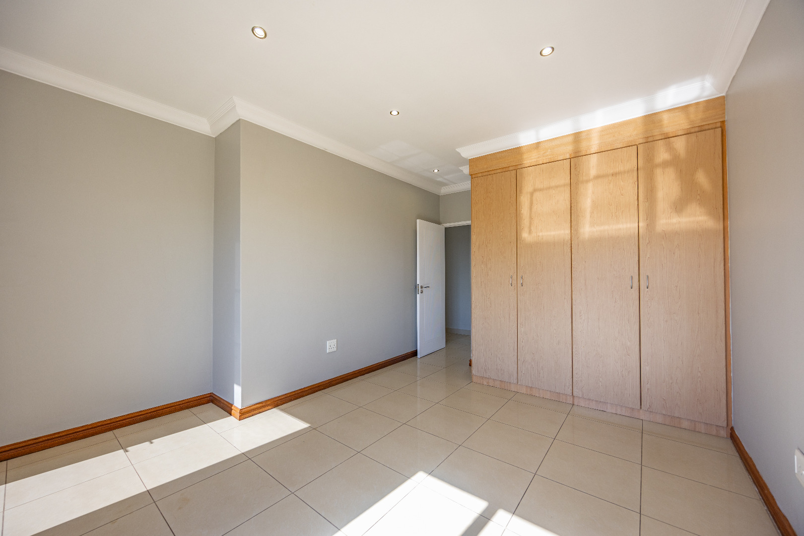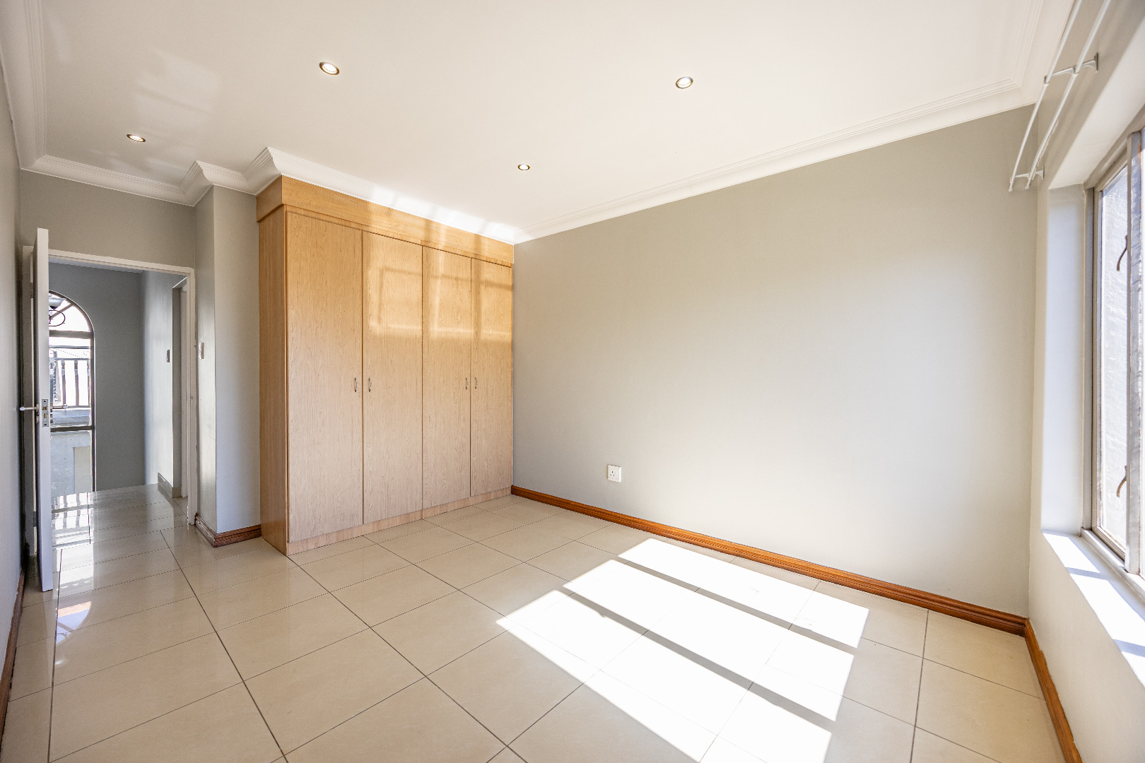 Upstairs, you’ll find three well-sized bedrooms with built-in cupboards. Bedroom 2 and Bedroom 4 share access to a balcony, while the main bedroom features built-in cupboards and a full en-suite bathroom. A shared family bathroom with a bathtub and a linen cupboard complete the upstairs layout.