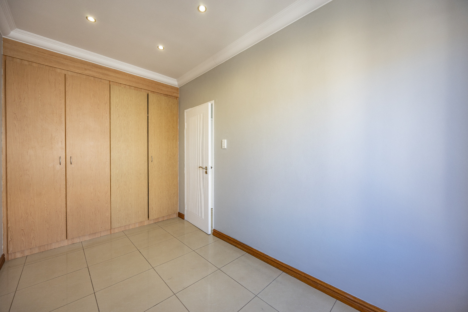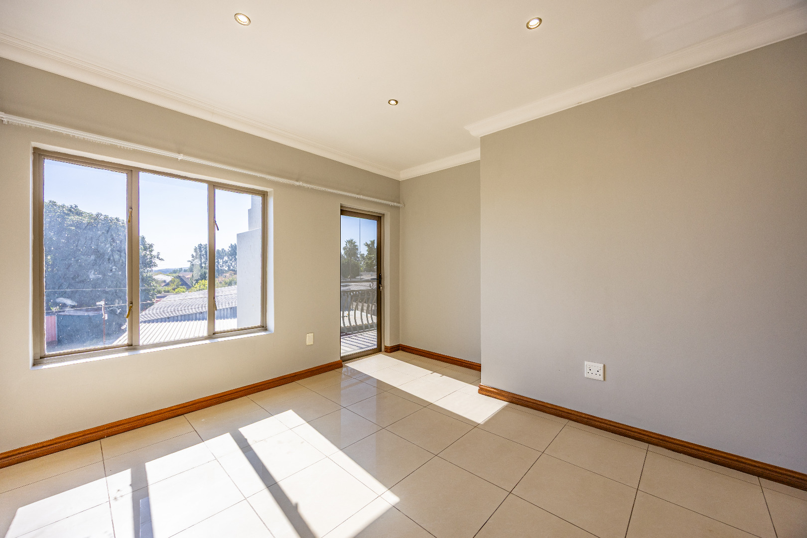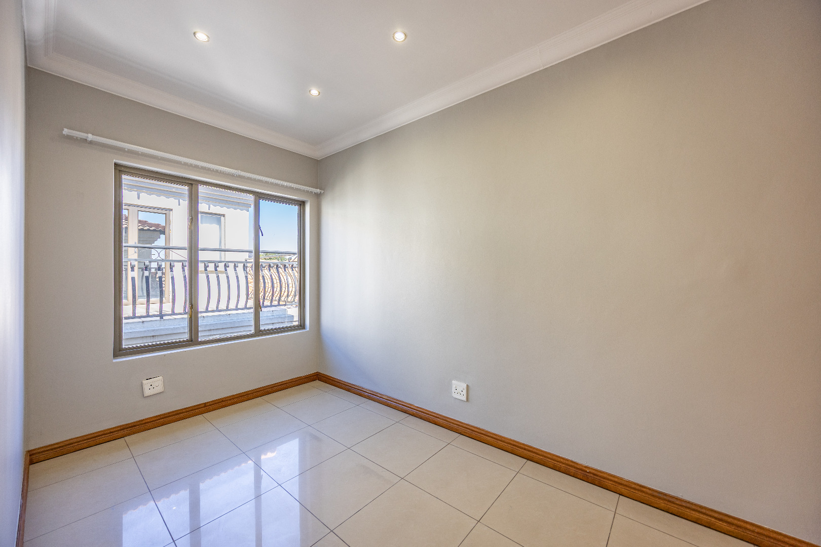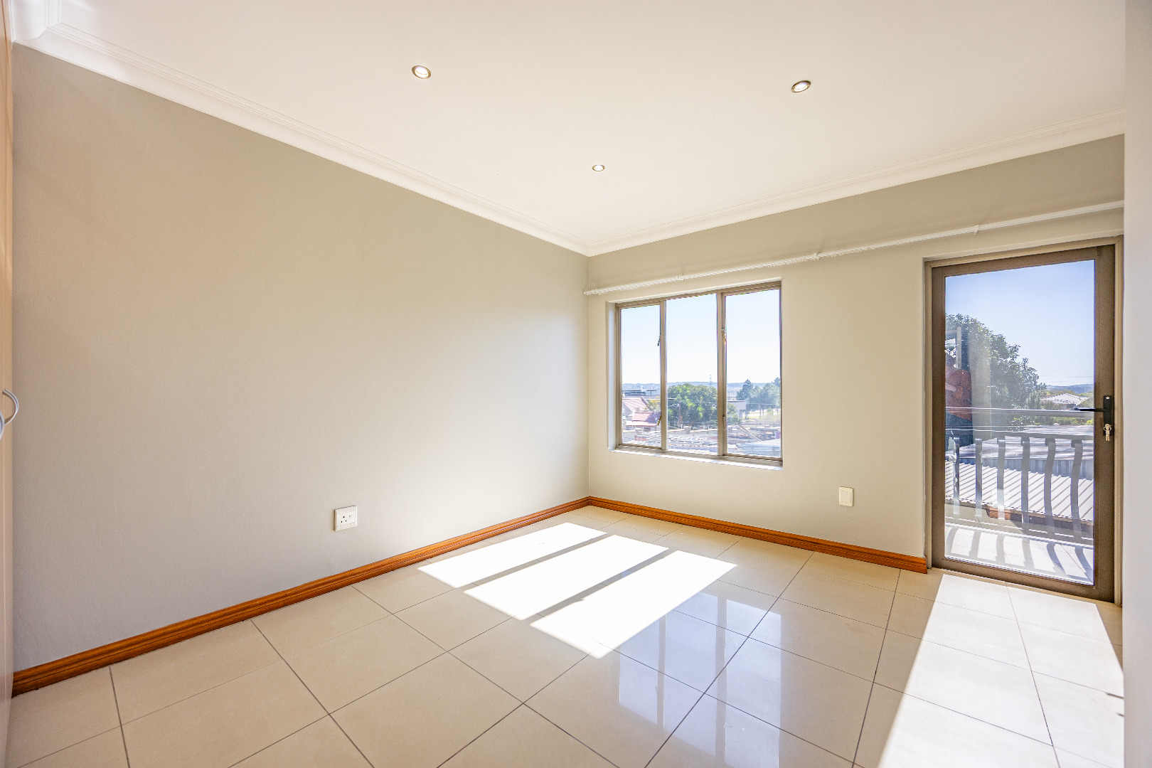 Upstairs, you’ll find three well-sized bedrooms with built-in cupboards. Bedroom 2 and Bedroom 4 share access to a balcony, while the main bedroom features built-in cupboards and a full en-suite bathroom. A shared family bathroom with a bathtub and a linen cupboard complete the upstairs layout.
