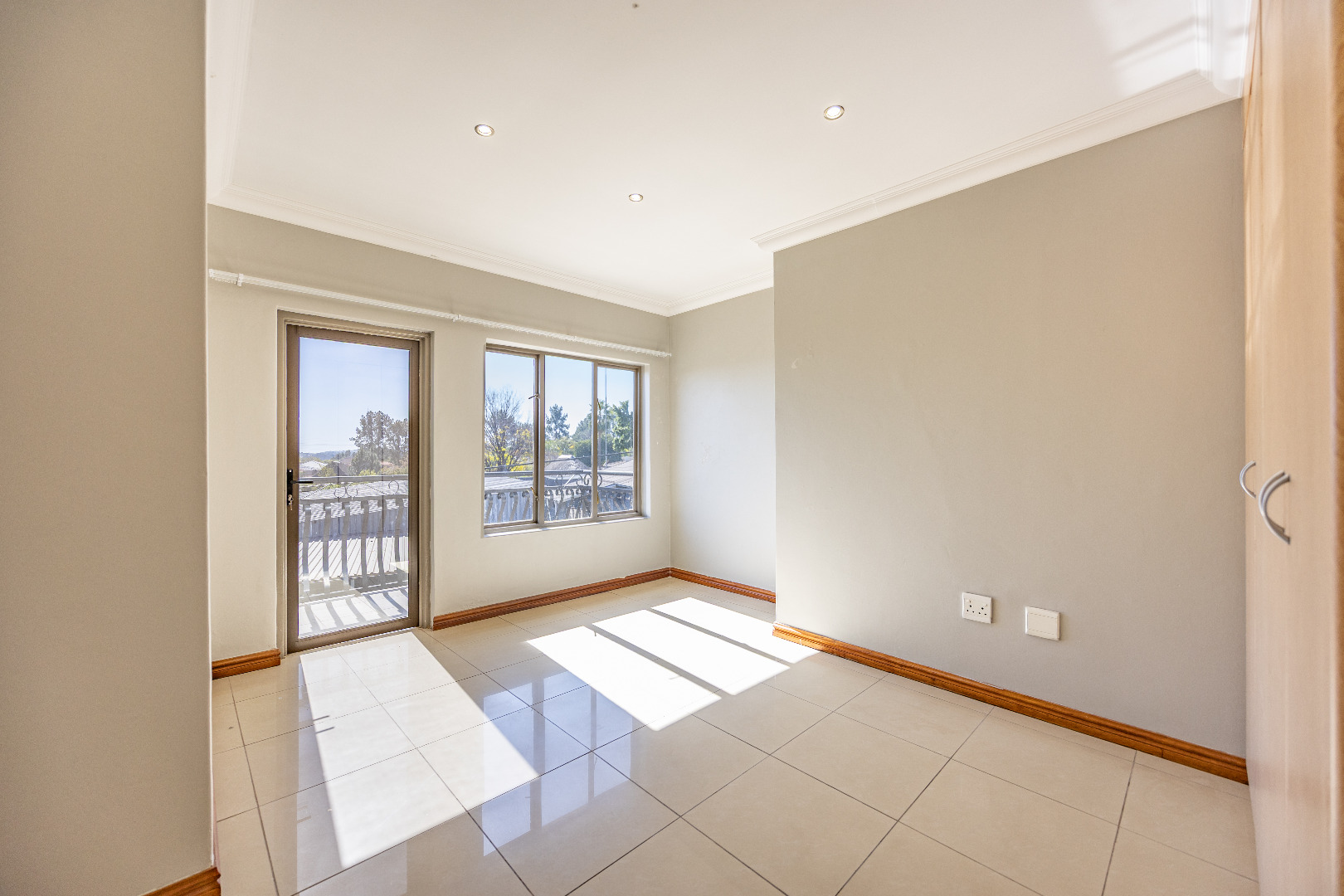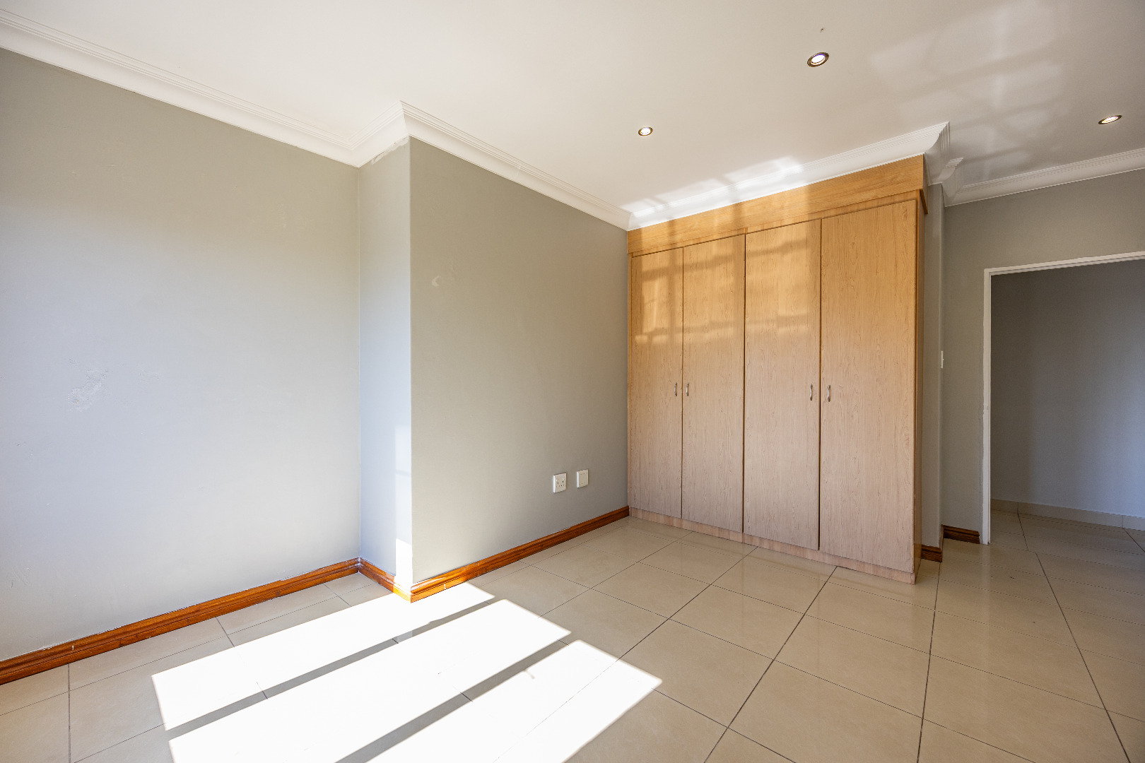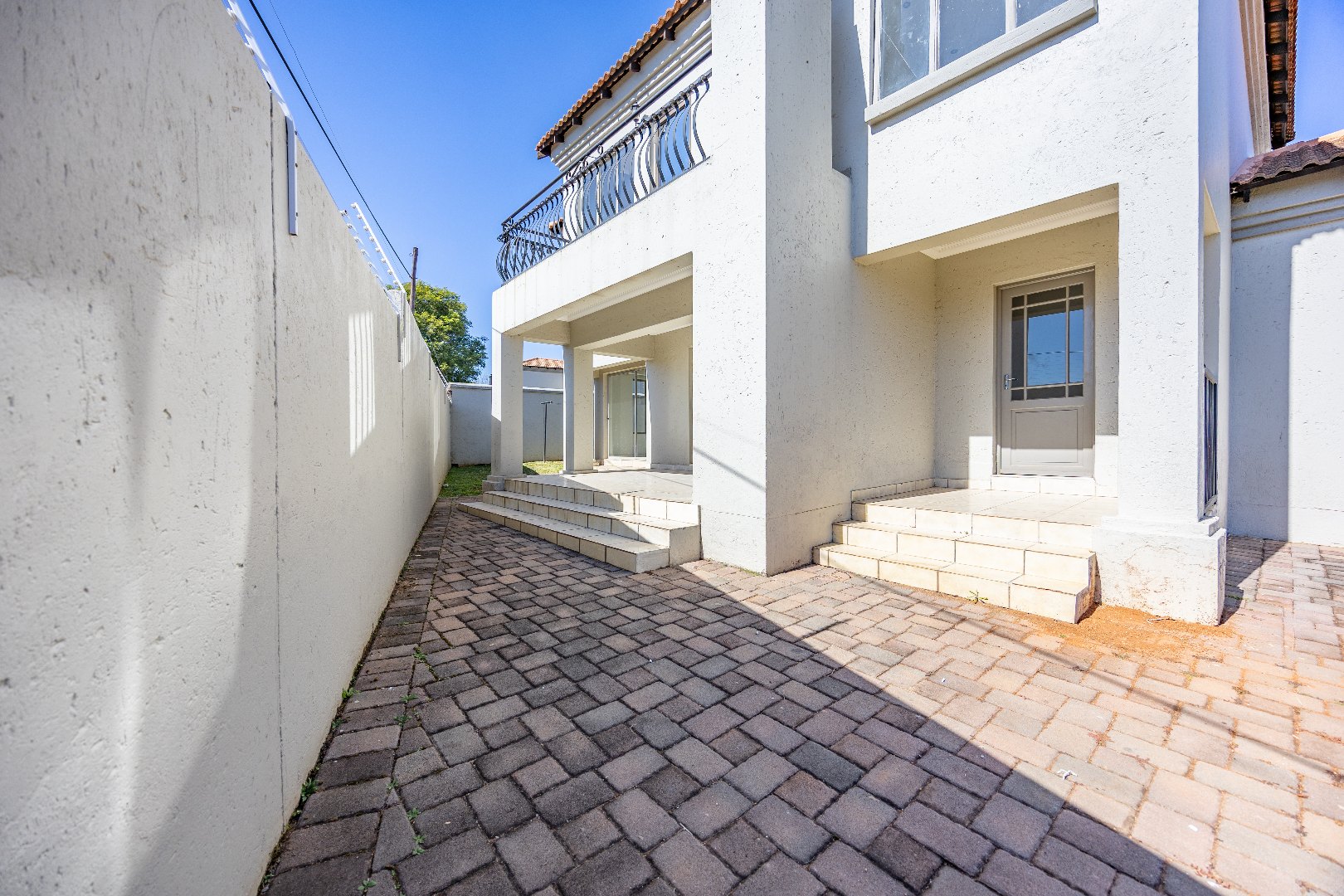 Upstairs, you’ll find three well-sized bedrooms with built-in cupboards. Bedroom 2 and Bedroom 4 share access to a balcony, while the main bedroom features built-in cupboards and a full en-suite bathroom. A shared family bathroom with a bathtub and a linen cupboard complete the upstairs layout.