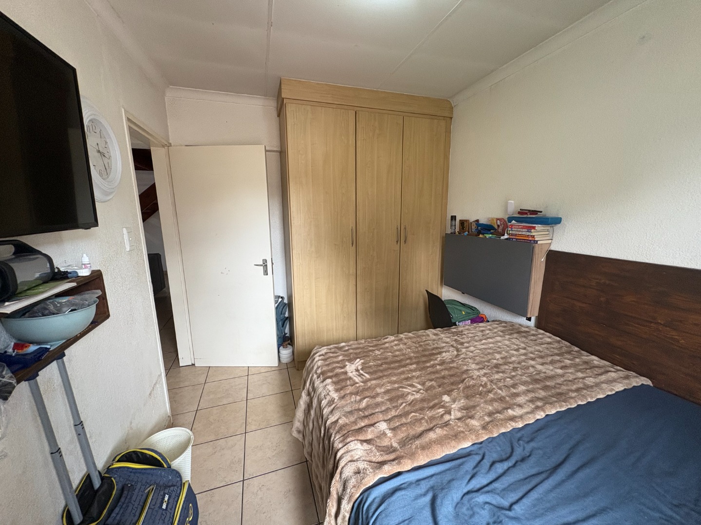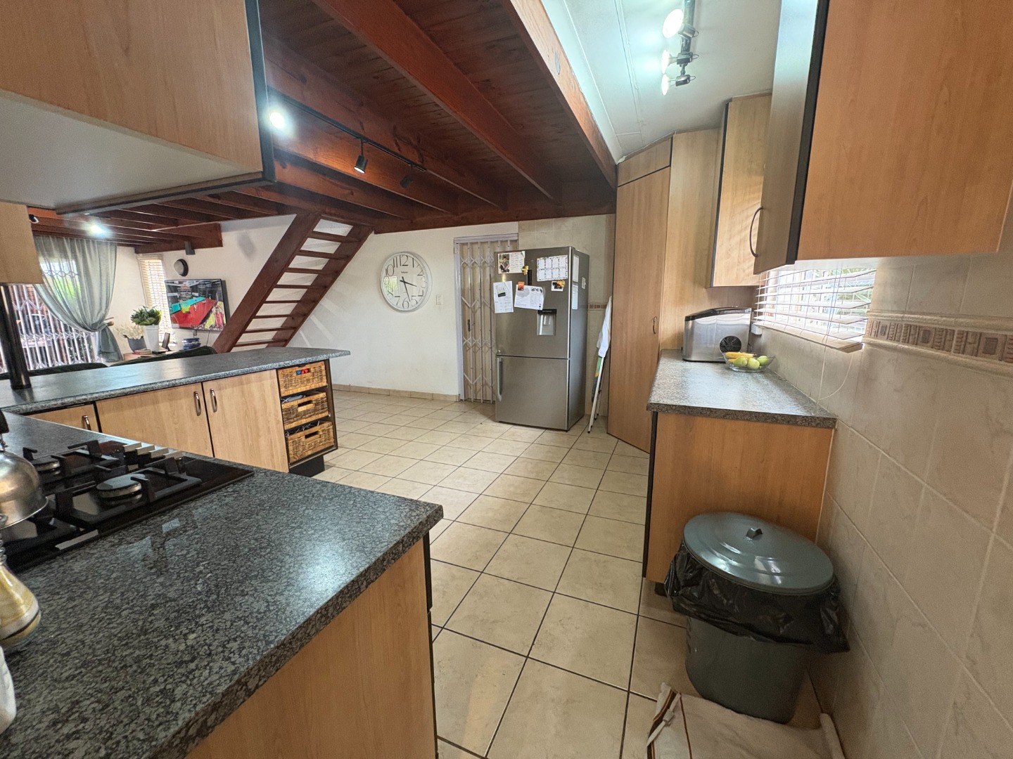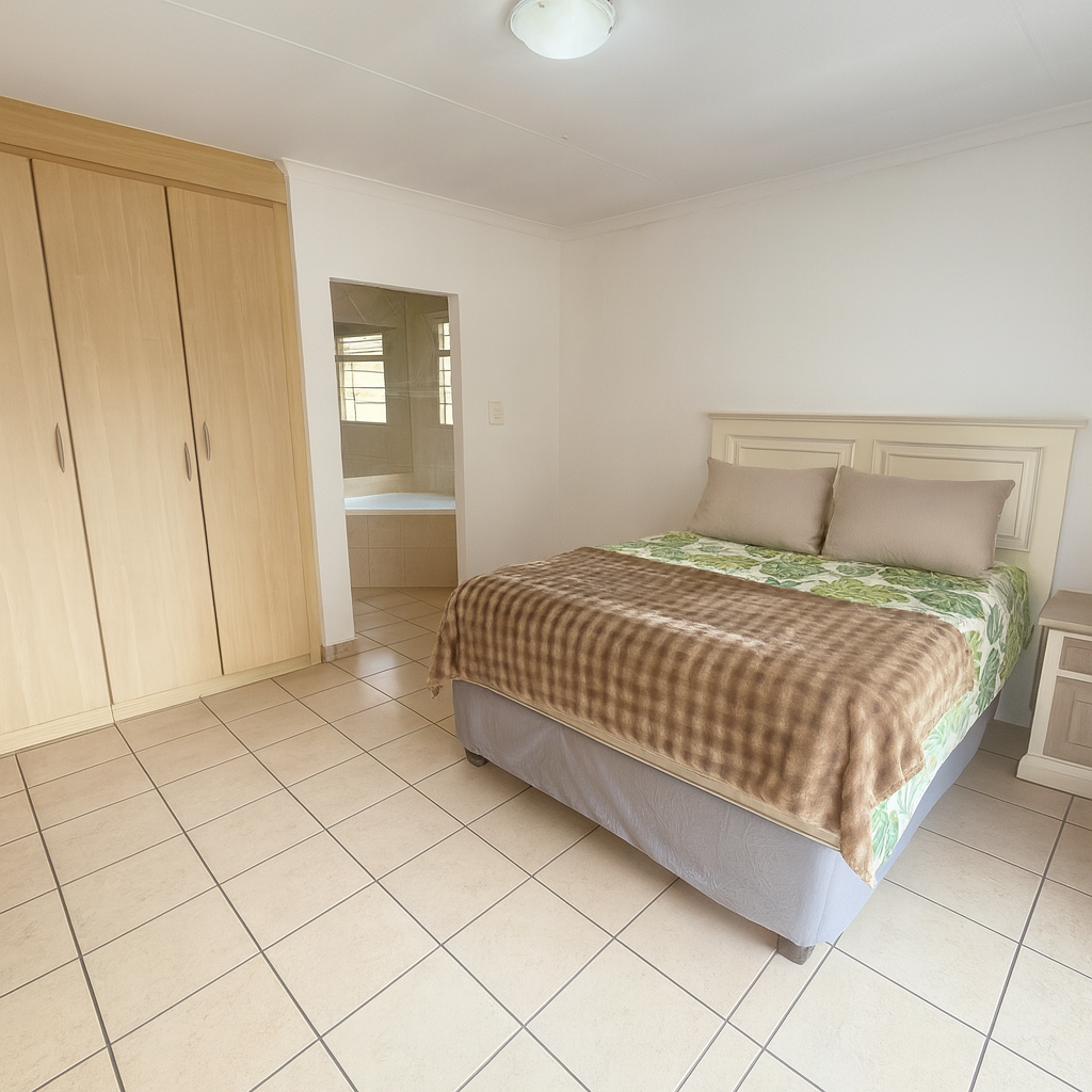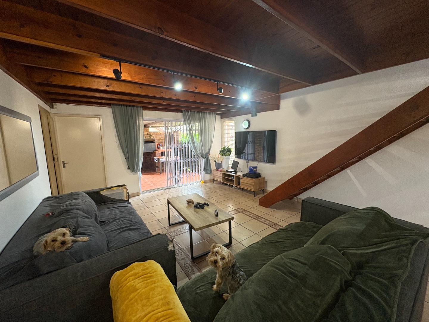The sliding doors from the braai area open directly into the TV lounge, secured with Trellidoor, and connect seamlessly to the open-plan kitchen with a separate scullery — a layout that keeps daily living simple and social. Downstairs offers two bedrooms with a shared bathroom plus a private main bedroom with an en-suite and its own Trellidoor sliding door leading outside. The double garage has direct access into the house, adding both convenience and security.