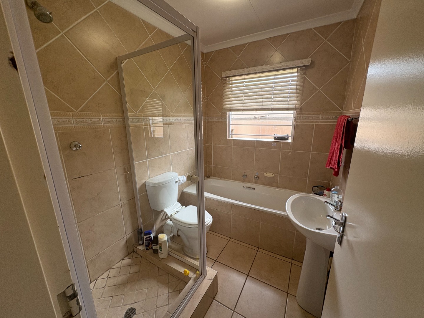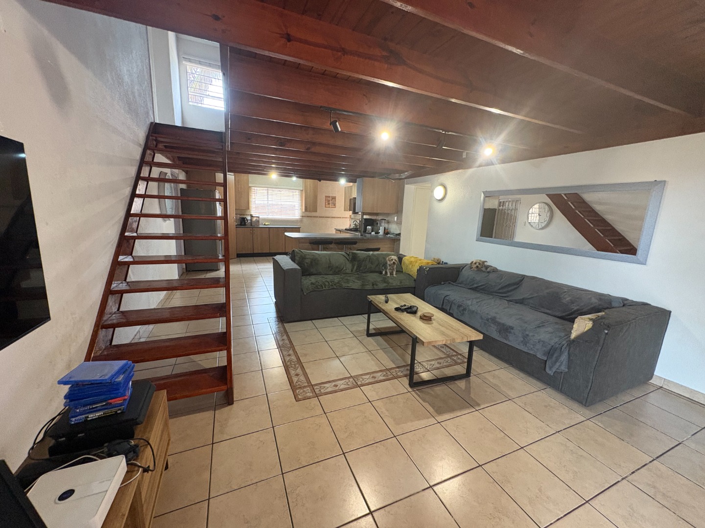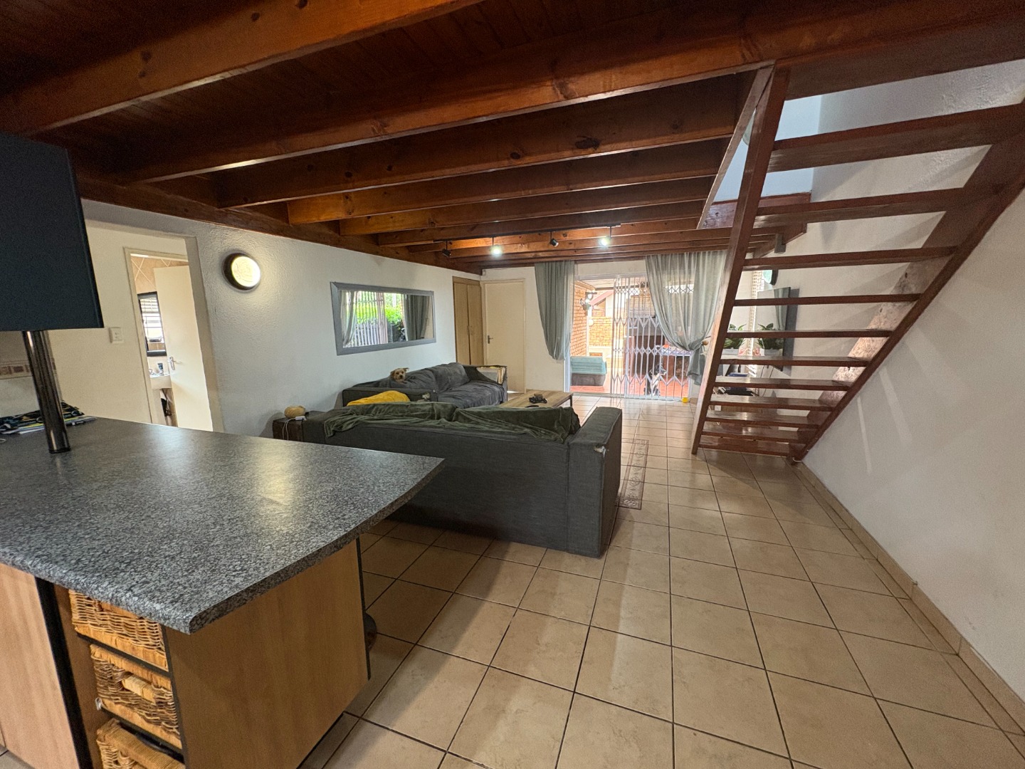 The sliding doors from the braai area open directly into the TV lounge, secured with Trellidoor, and connect seamlessly to the open-plan kitchen with a separate scullery — a layout that keeps daily living simple and social. Downstairs offers two bedrooms with a shared bathroom plus a private main bedroom with an en-suite and its own Trellidoor sliding door leading outside. The double garage has direct access into the house, adding both convenience and security.