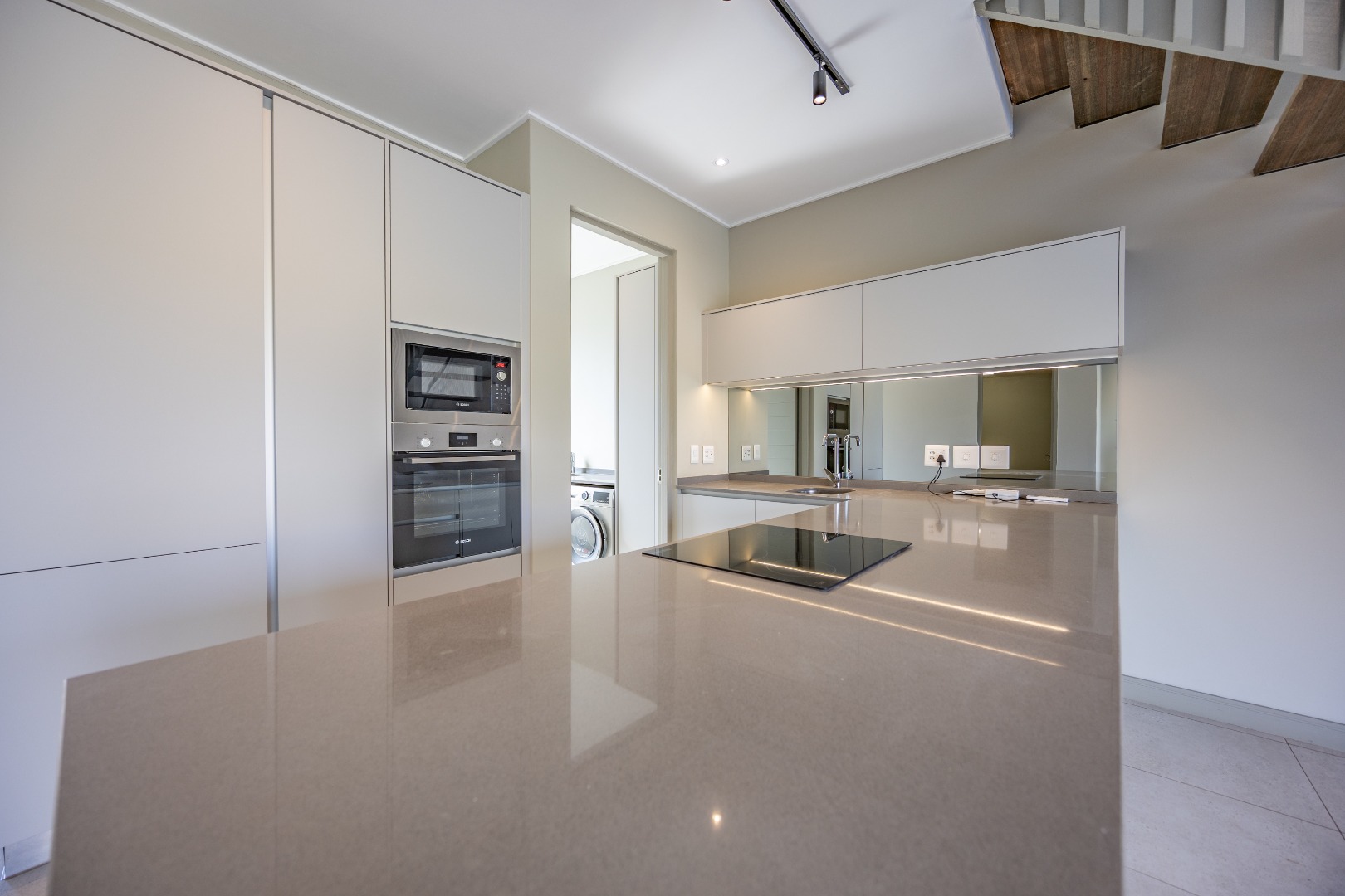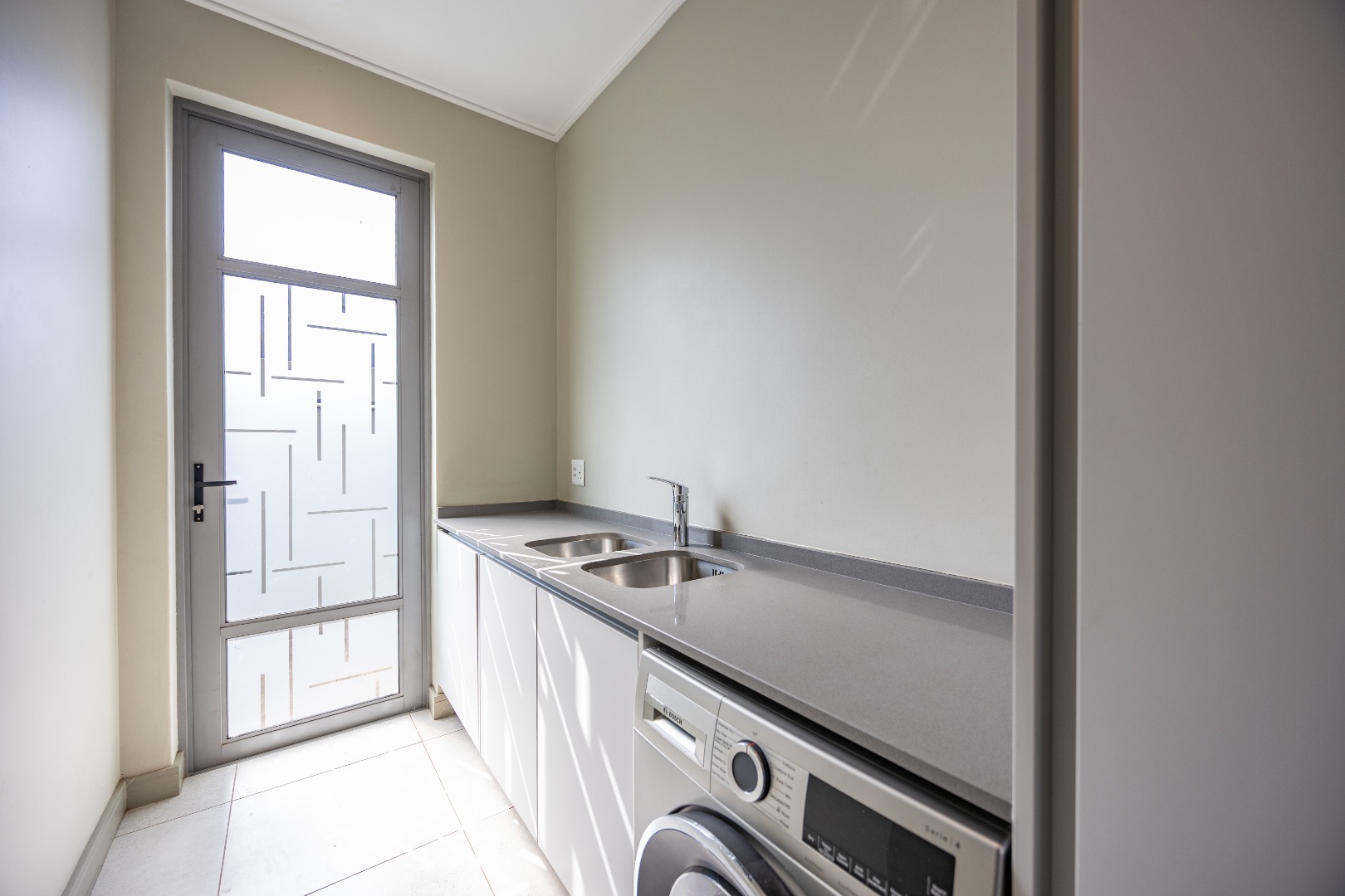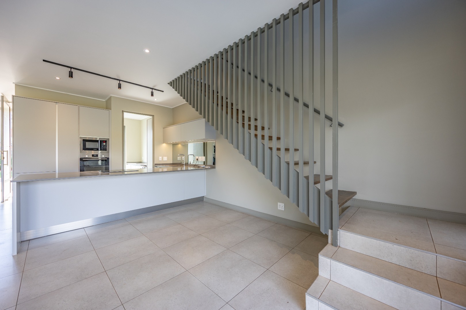 The ground floor boasts a generous lounge area, a stylish dining space, and a modern kitchen equipped with high-end finishes, sleek cabinetry, and a central island—perfect for family meals or casual gatherings. A separate scullery and pantry add functionality and keep the main kitchen space clutter-free.