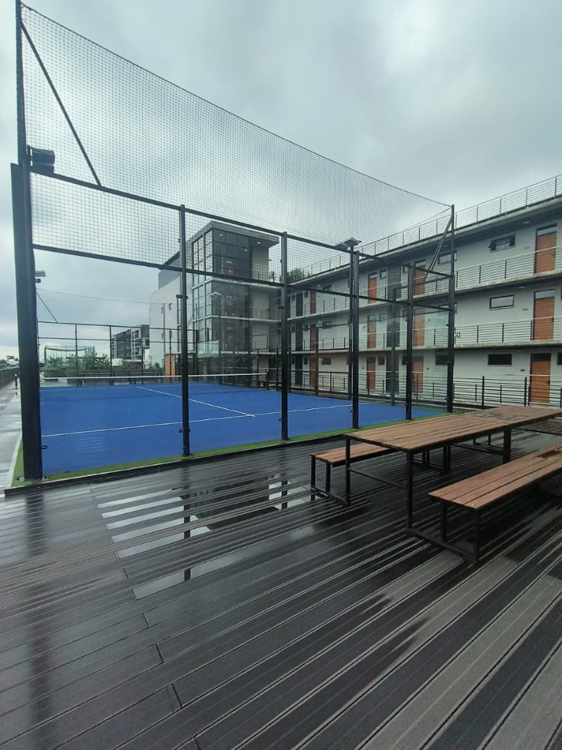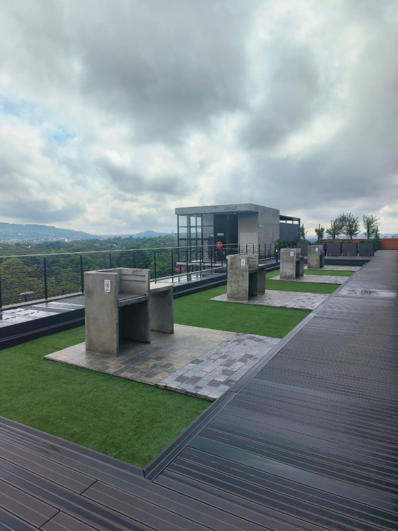 Beyond the individual unit, residents gain access to an array of premium communal amenities designed to enhance their lifestyle. The complex features a vibrant outdoor tennis court, perfect for recreation and socialising. A spacious outdoor deck with picnic tables provides an ideal setting for relaxation or gatherings. The rooftop amenity area is a true highlight, offering multiple concrete BBQ stations, and composite decking, all set against a backdrop of panoramic views. A common building on the rooftop further extends the communal living experience.