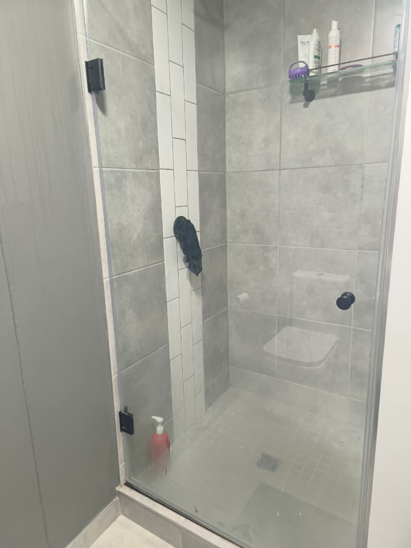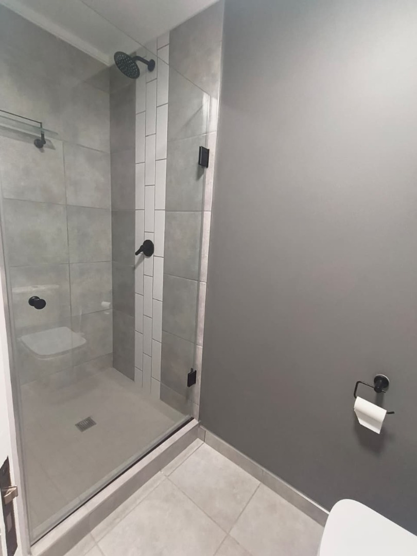 Both bedrooms are thoughtfully designed with comfort and practicality in mind, featuring built-in white wardrobes that offer ample storage solutions. The two bathrooms are equally impressive, showcasing modern grey and white tiling, clear glass walk-in shower enclosures, and contemporary matte black fixtures. These well-appointed spaces reflect the overall sophisticated design of the apartment.