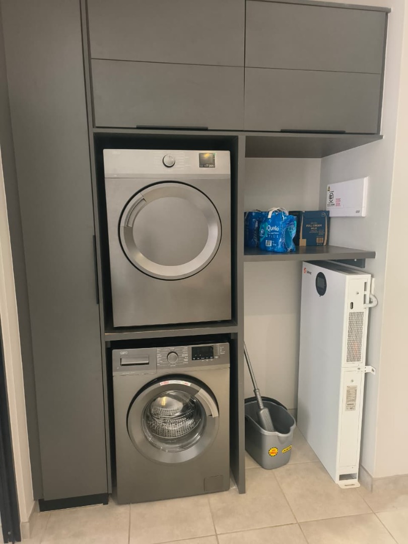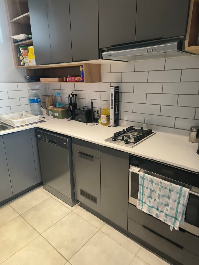 The heart of this home is its sleek, modern kitchen, equipped with dark grey cabinetry, pristine white countertops, and a classic white subway tile backsplash. Integrated appliances, including a gas hob, oven and dishwasher, ensure a functional and aesthetically pleasing culinary space. Adjacent to the kitchen, a dedicated laundry area features space-saving stacked front-load washing and drying machines, neatly integrated into matching dark grey cabinetry for optimal storage and efficiency. The apartment also benefits from a private balcony, providing a pleasant outdoor retreat.