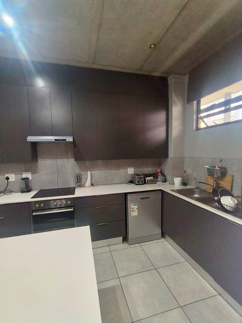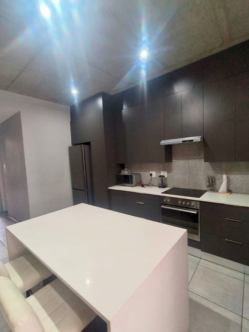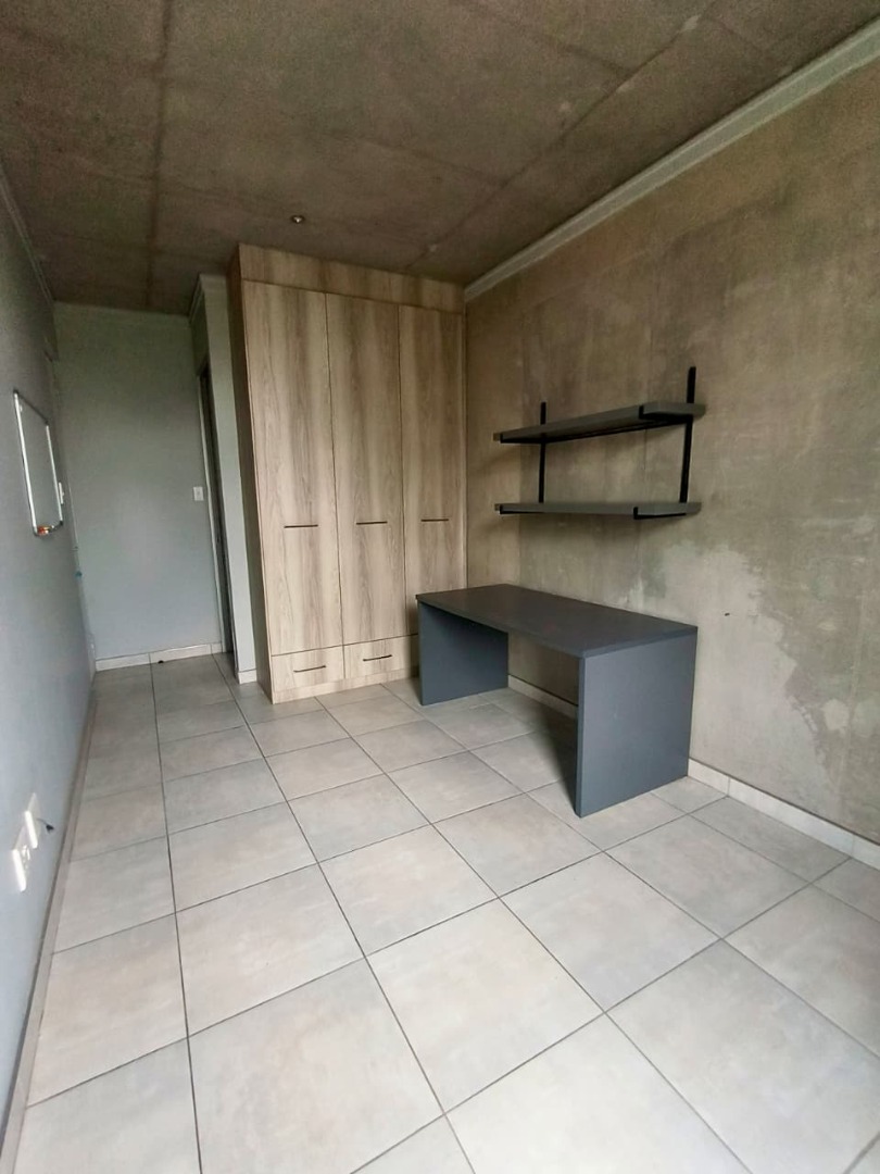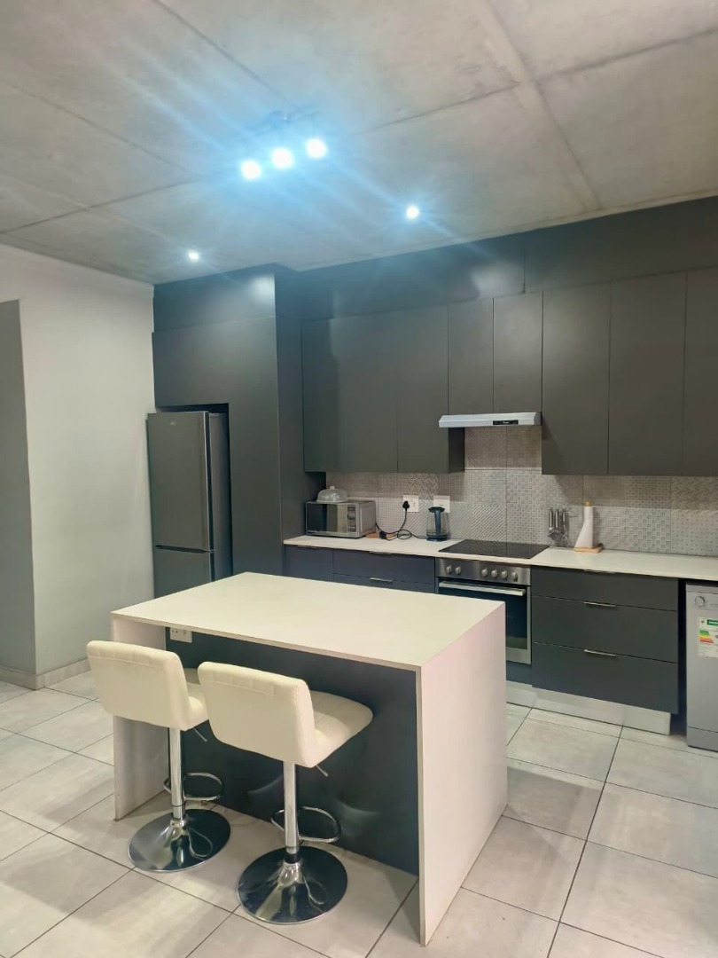 This contemporary 95 sqm apartment offers a sophisticated living experience, ideal for students seeking comfort and convenience in Pretoria. The fully furnished residence features two well-appointed bedrooms and two modern bathrooms, providing ample personal space. The heart of the home is a sleek kitchen, boasting dark flat-panel cabinetry, pristine white countertops, and a spacious central island perfect for dining or study. Integrated appliances include an oven, hob, and extractor fan, complemented by a dishwasher, double sink, fridge, ensuring a fully equipped culinary space. The living areas maintain a modern industrial aesthetic with exposed concrete ceilings and clean tiled flooring throughout, furnished with a contemporary sofa, coffee table, and TV stand. Each bedroom is designed for functionality, featuring built-in wooden wardrobes, a dedicated desk area with a chair, and wall-mounted shelving, all under the distinctive concrete ceiling and alongside textured walls. Two dedicated parking spaces add to the practicality of this rental.