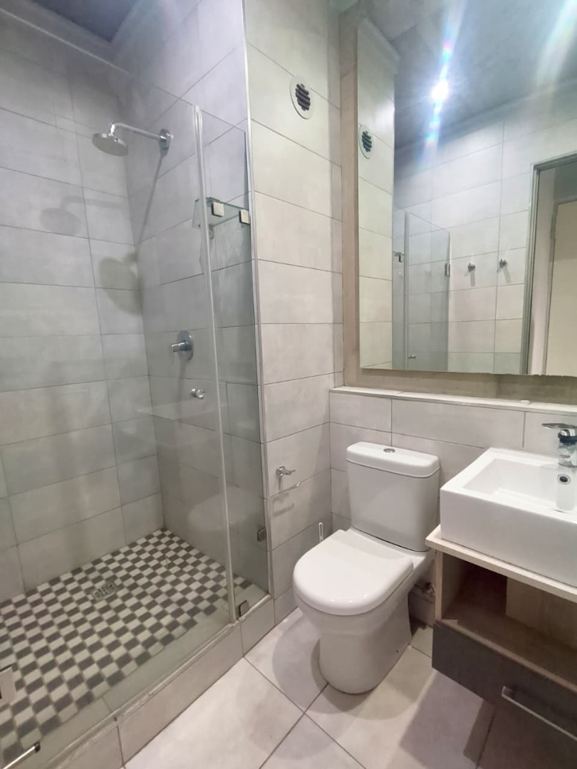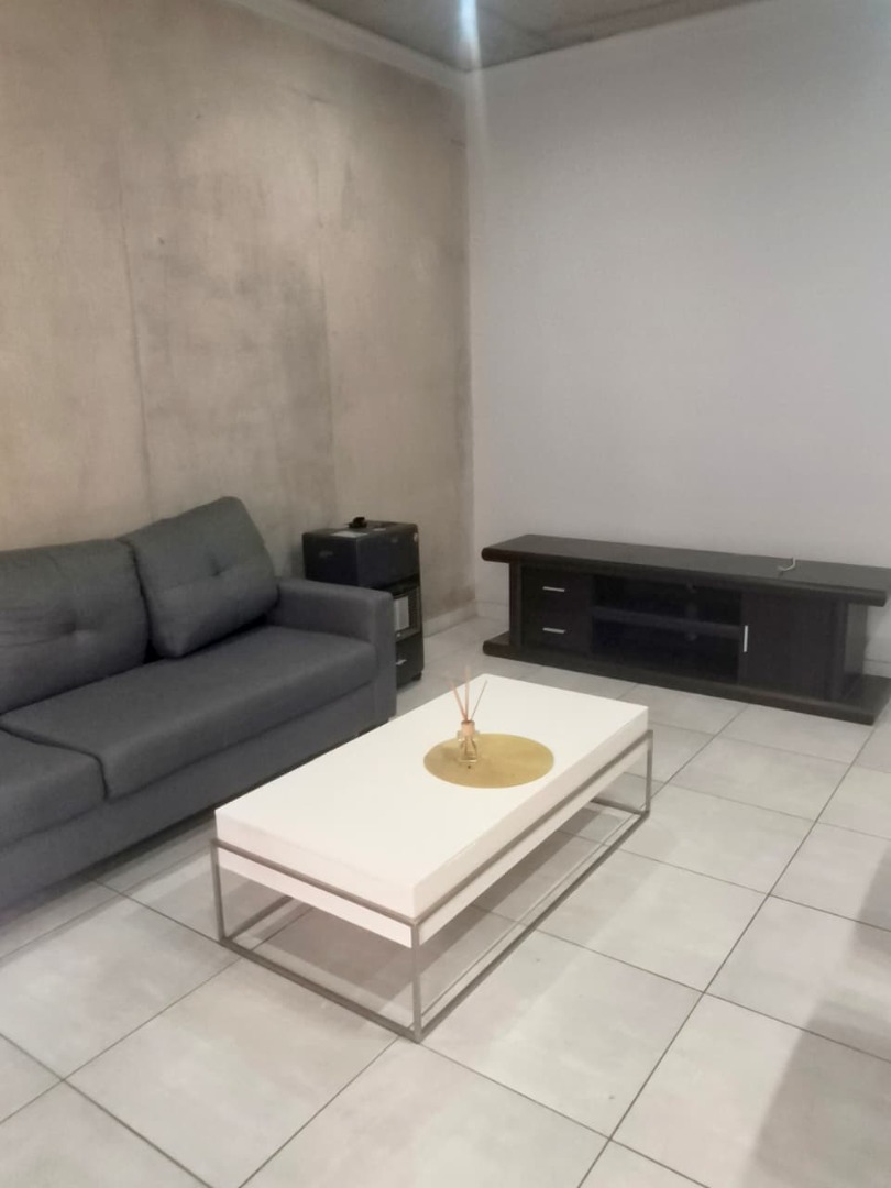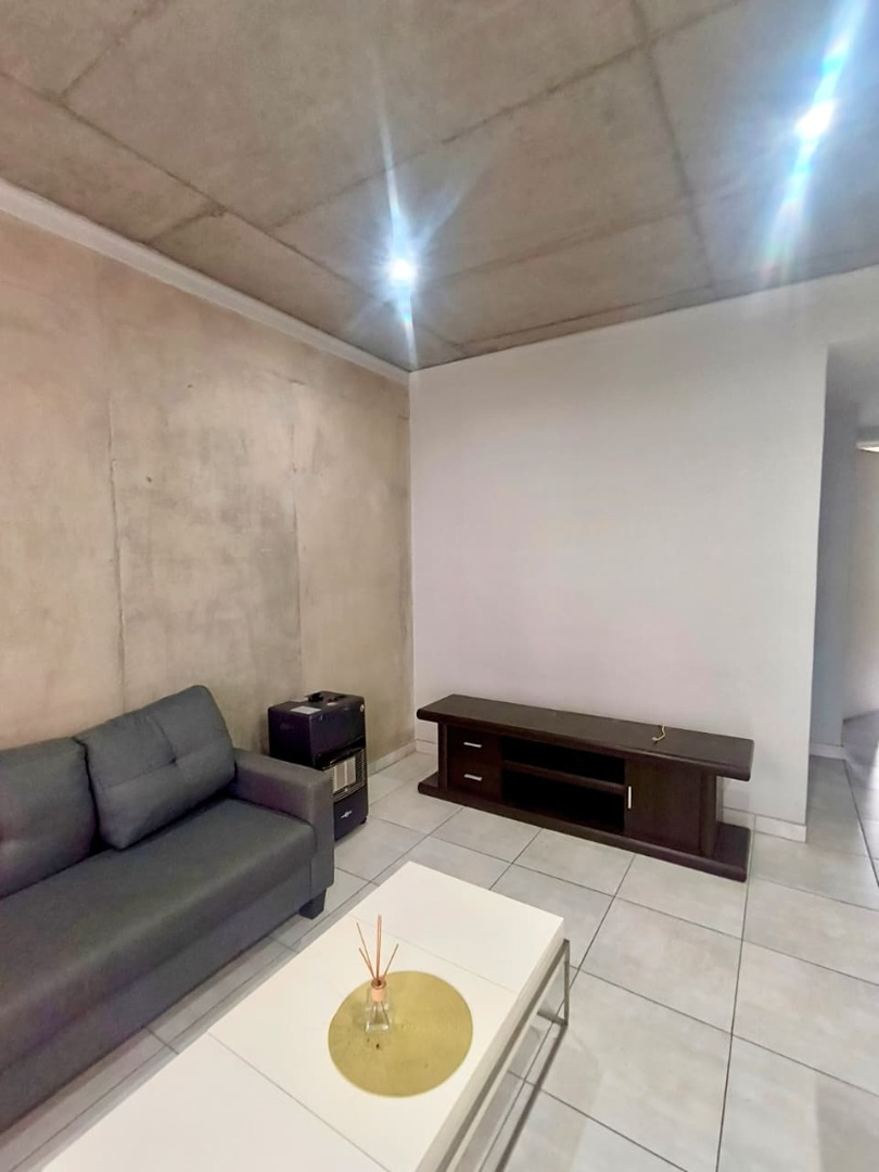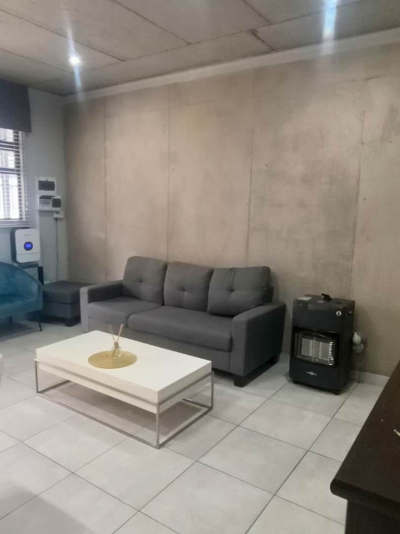 This contemporary 95 sqm apartment offers a sophisticated living experience, ideal for students seeking comfort and convenience in Pretoria. The fully furnished residence features two well-appointed bedrooms and two modern bathrooms, providing ample personal space. The heart of the home is a sleek kitchen, boasting dark flat-panel cabinetry, pristine white countertops, and a spacious central island perfect for dining or study. Integrated appliances include an oven, hob, and extractor fan, complemented by a dishwasher, double sink, fridge, ensuring a fully equipped culinary space. The living areas maintain a modern industrial aesthetic with exposed concrete ceilings and clean tiled flooring throughout, furnished with a contemporary sofa, coffee table, and TV stand. Each bedroom is designed for functionality, featuring built-in wooden wardrobes, a dedicated desk area with a chair, and wall-mounted shelving, all under the distinctive concrete ceiling and alongside textured walls. Two dedicated parking spaces add to the practicality of this rental.