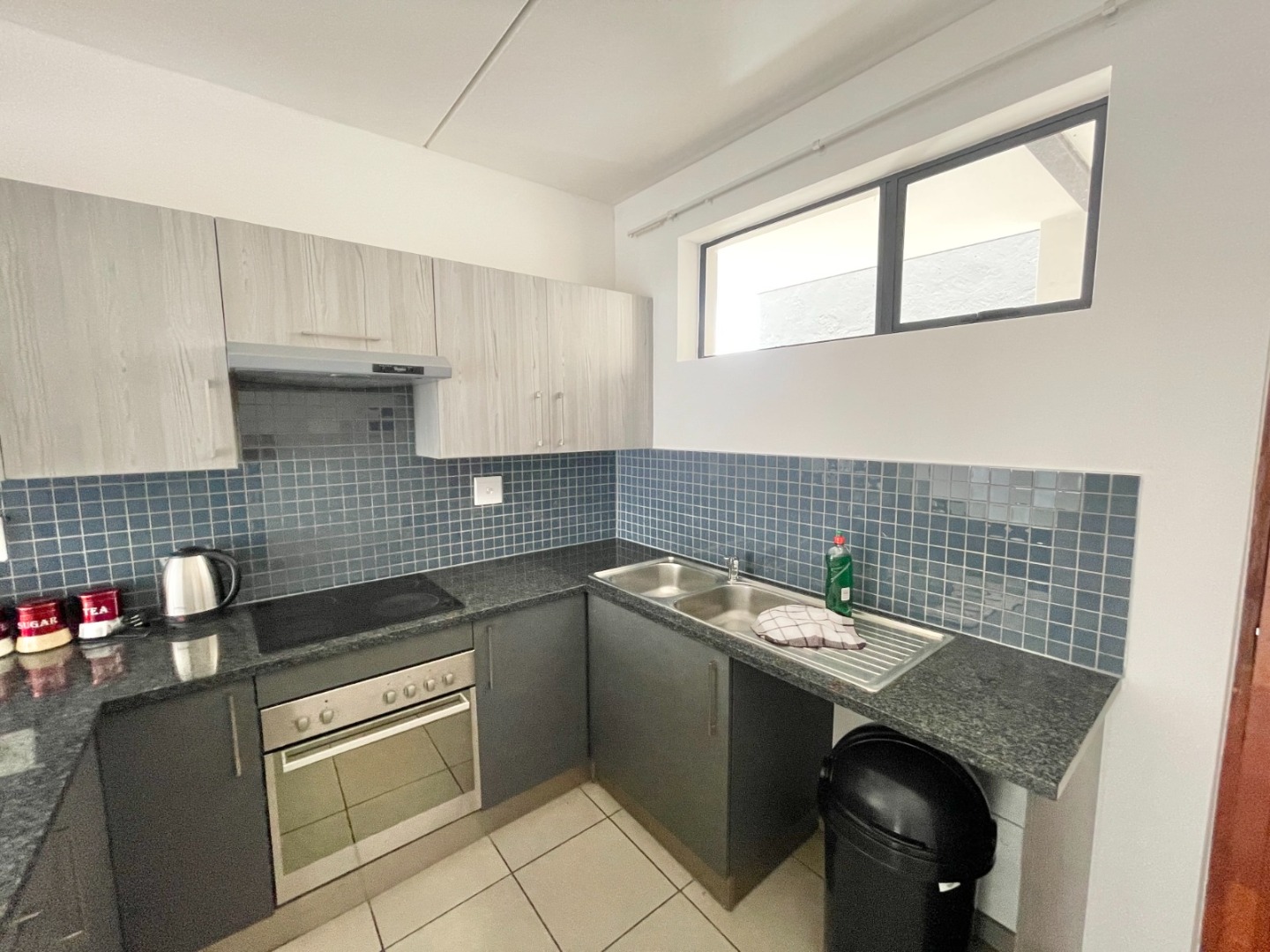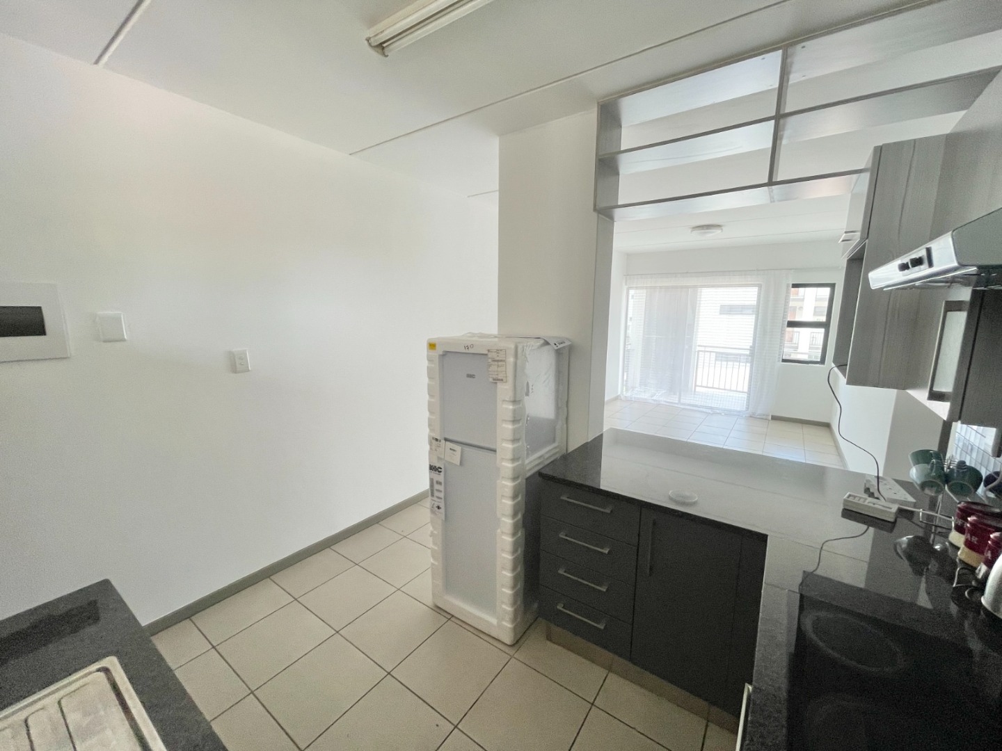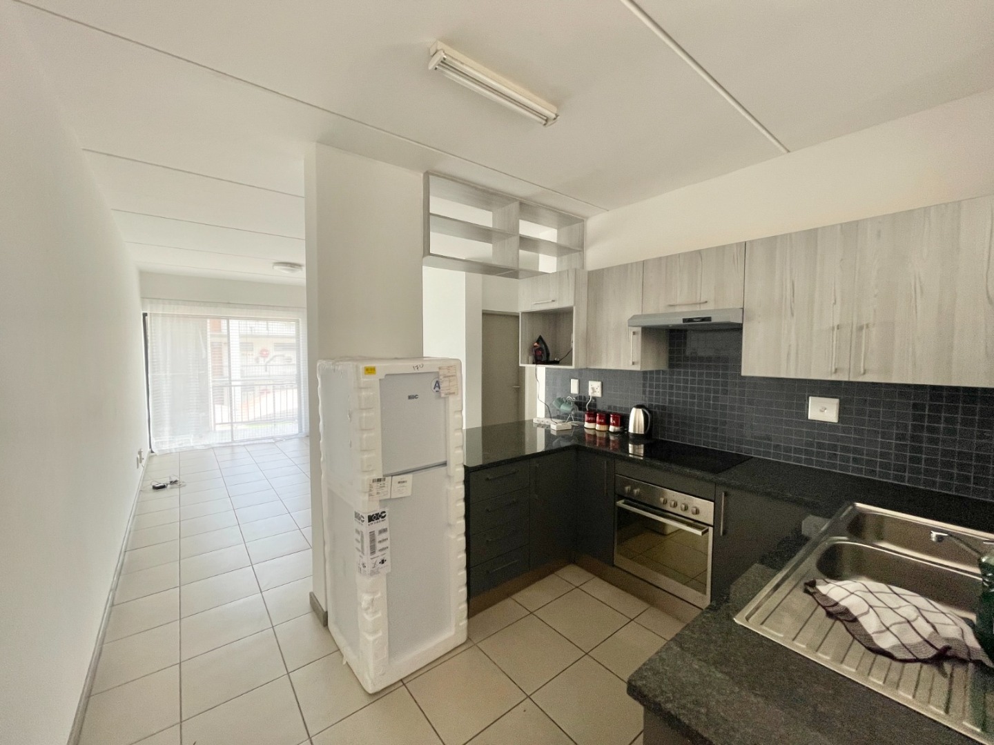 This modern 67 sqm apartment in a secure complex offers comfortable living in Elarduspark, Pretoria. Designed with an open-plan layout, the residence features a contemporary kitchen equipped with dark granite-look countertops, an integrated oven and hob, a double stainless steel sink, and a stylish blue-grey tiled backsplash. The kitchen seamlessly flows into the lounge area, which benefits from ample natural light streaming through large sliding doors, creating a bright and inviting atmosphere. Tiled flooring extends throughout the apartment, ensuring easy maintenance, and a new refrigerator is included for convenience.