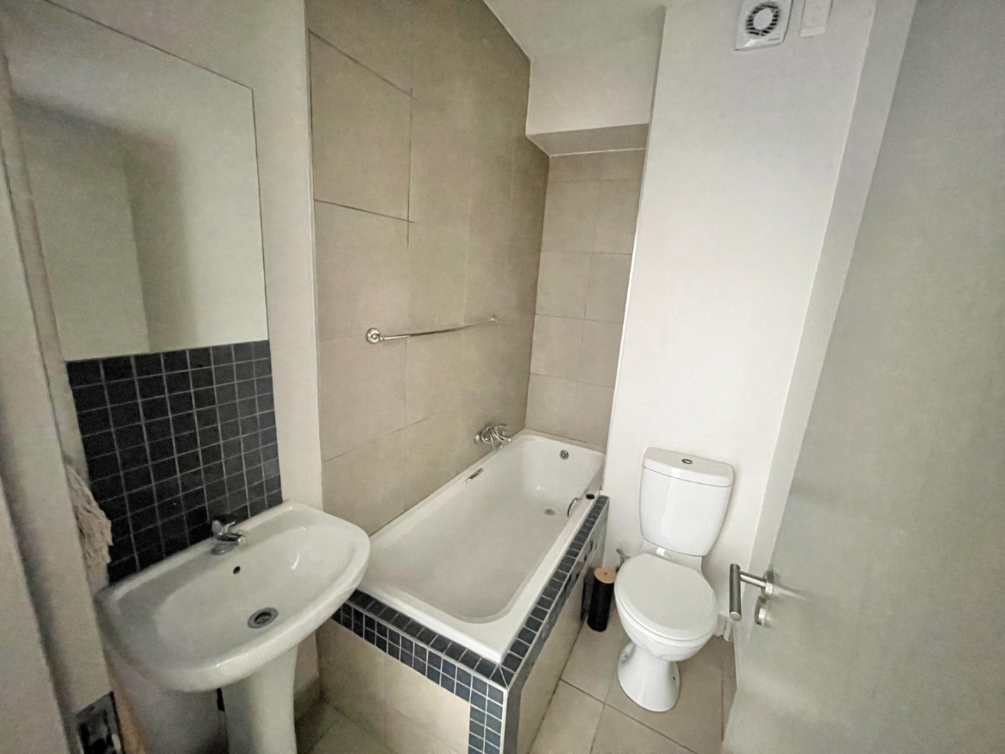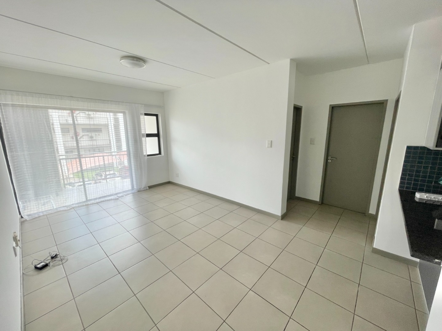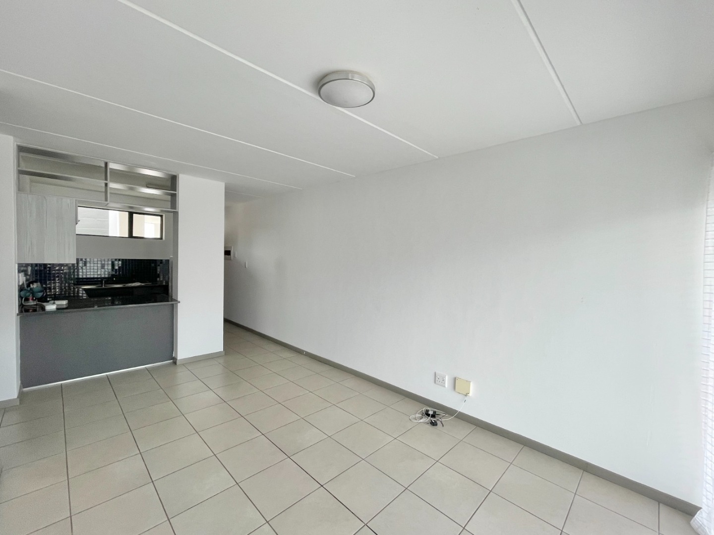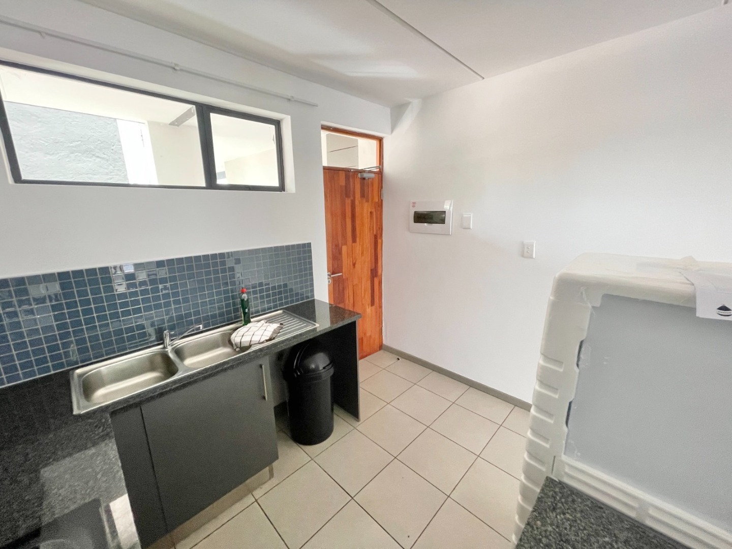 This modern 67 sqm apartment in a secure complex offers comfortable living in Elarduspark, Pretoria. Designed with an open-plan layout, the residence features a contemporary kitchen equipped with dark granite-look countertops, an integrated oven and hob, a double stainless steel sink, and a stylish blue-grey tiled backsplash. The kitchen seamlessly flows into the lounge area, which benefits from ample natural light streaming through large sliding doors, creating a bright and inviting atmosphere. Tiled flooring extends throughout the apartment, ensuring easy maintenance, and a new refrigerator is included for convenience.
