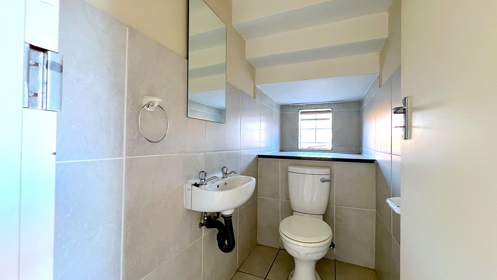 The ground floor features a contemporary kitchen with ample cupboard space, seamlessly flowing into the dining area—perfect for family meals or entertaining guests. The spacious lounge is filled with natural light and opens onto a covered patio, overlooking a beautifully maintained wrap-around garden that provides a tranquil outdoor retreat. A guest toilet on this level adds to the convenience and functionality of the layout.