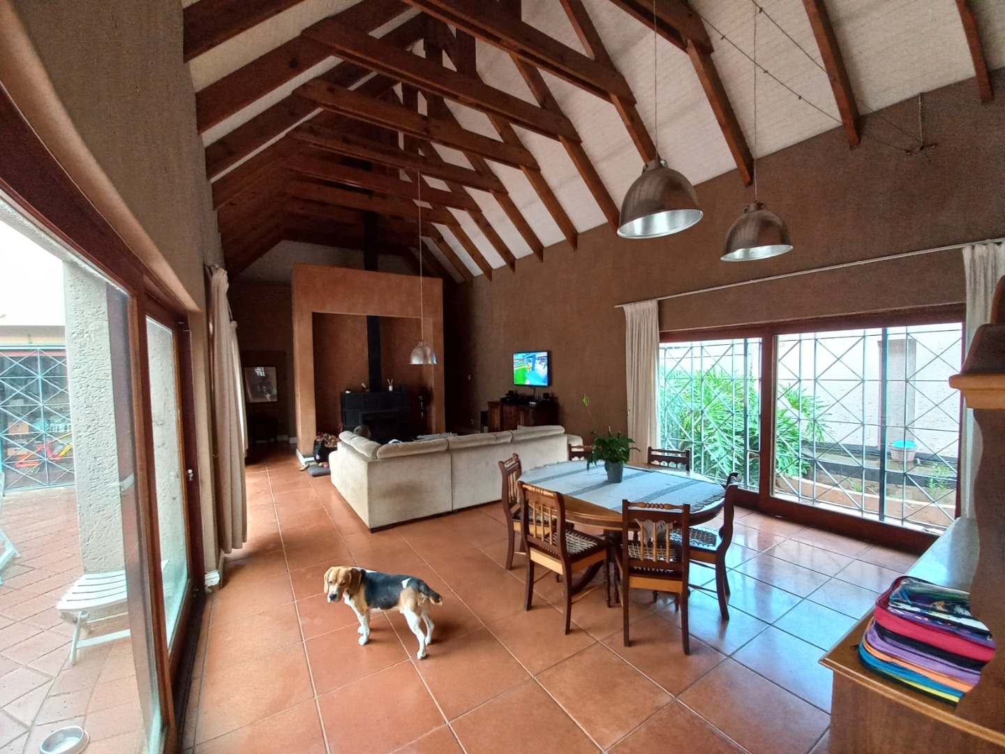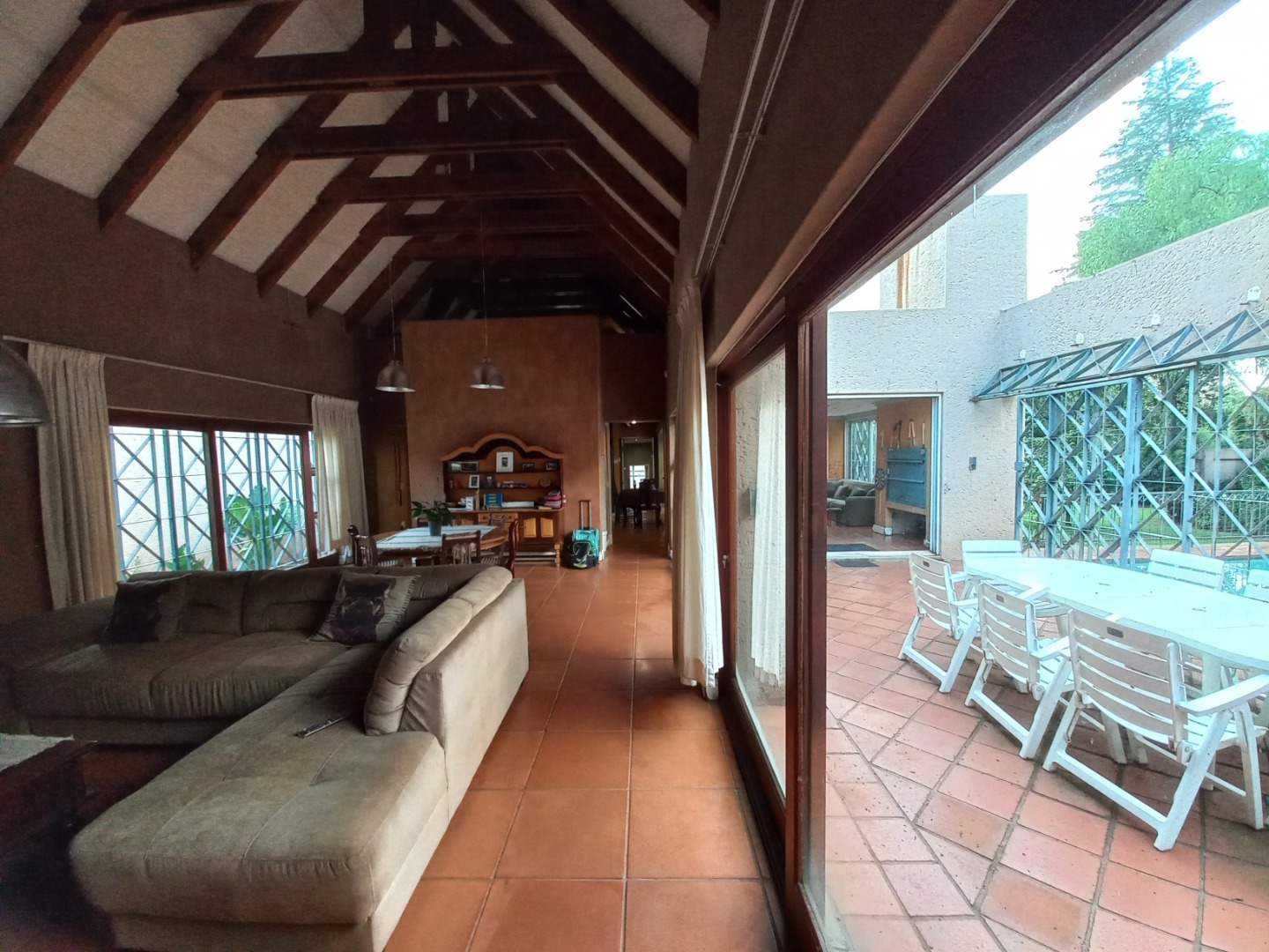 Do not miss out on this charming 3-bedroom, 2-bathroom residential rental property in Faerie Glen, Pretoria. The property offers a unique blend of rustic charm and privacy! Spanning a generous 405 sqm floor area on a 1267 sqm erf, the home features a distinctive ivy-clad facade and a welcoming atmosphere. Inside, discover spacious open-plan living areas, including a lounge, dining room, and a dedicated family TV room, all enhanced by high vaulted ceilings with exposed wooden beams and durable terracotta tile flooring. The well-appointed kitchen and a convenient laundry room cater to daily needs, while a guest toilet adds practicality. An inviting patio with a built-in braai extends the living space outdoors, perfect for entertaining.