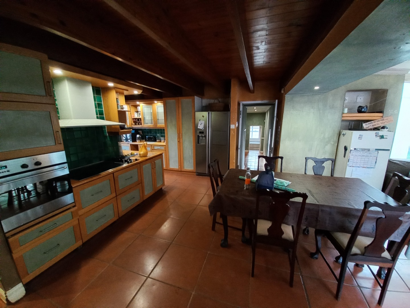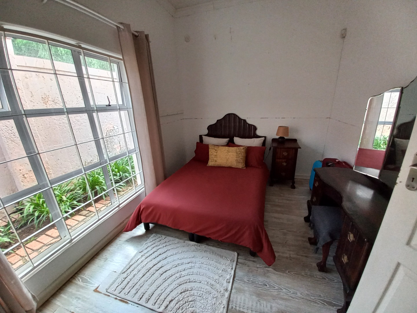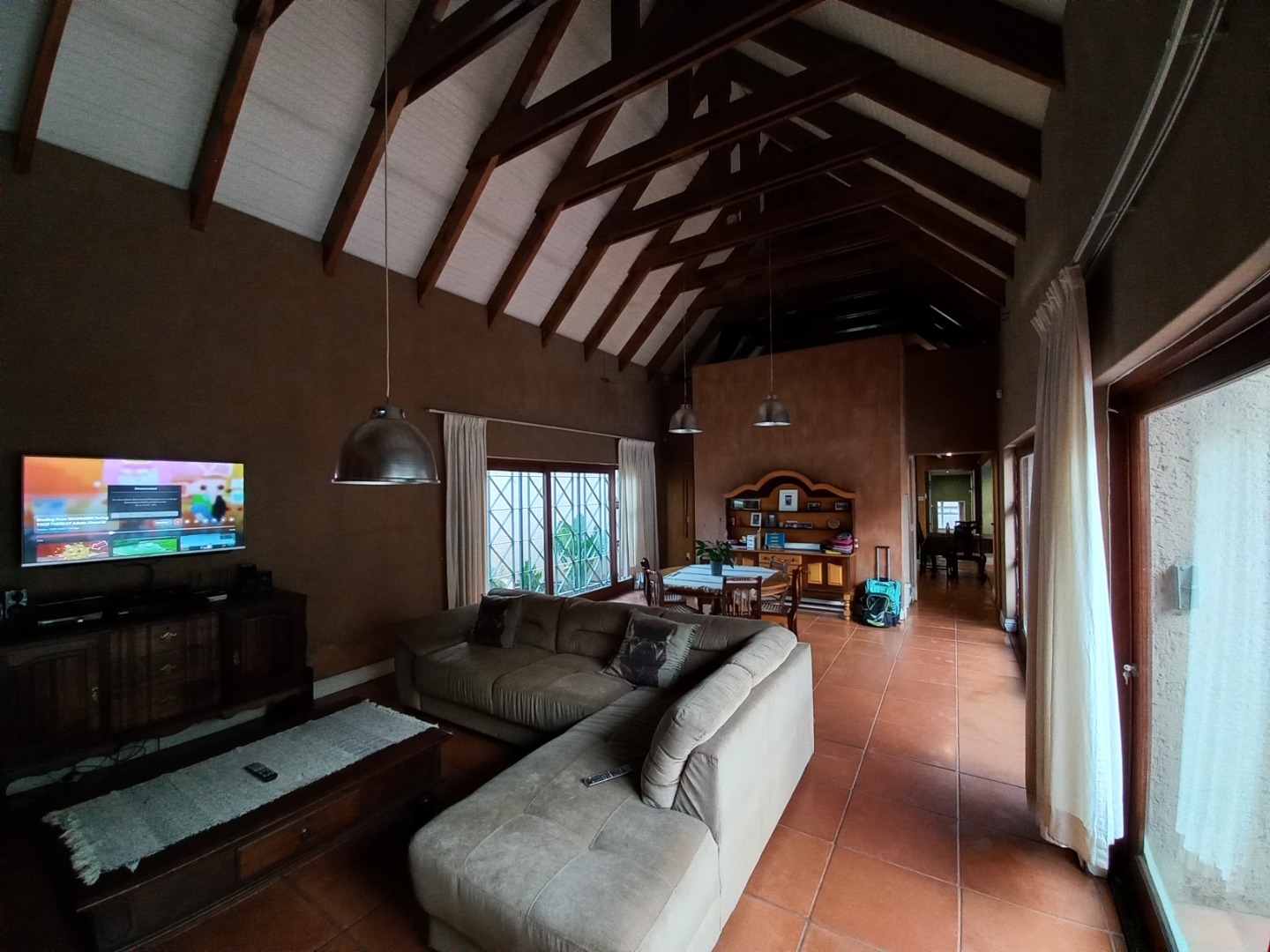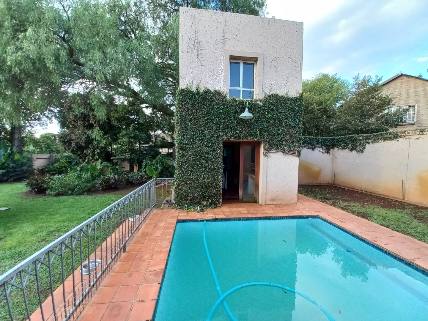 Do not miss out on this charming 3-bedroom, 2-bathroom residential rental property in Faerie Glen, Pretoria. The property offers a unique blend of rustic charm and privacy! Spanning a generous 405 sqm floor area on a 1267 sqm erf, the home features a distinctive ivy-clad facade and a welcoming atmosphere. Inside, discover spacious open-plan living areas, including a lounge, dining room, and a dedicated family TV room, all enhanced by high vaulted ceilings with exposed wooden beams and durable terracotta tile flooring. The well-appointed kitchen and a convenient laundry room cater to daily needs, while a guest toilet adds practicality. An inviting patio with a built-in braai extends the living space outdoors, perfect for entertaining.