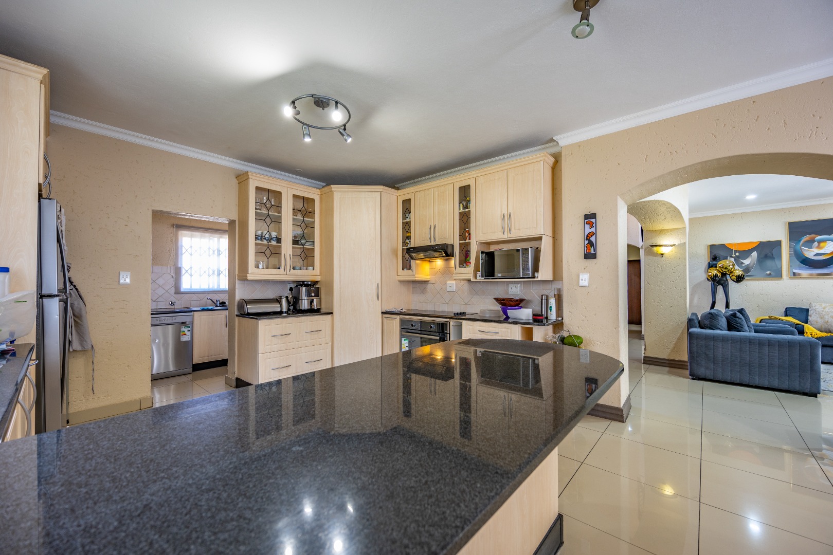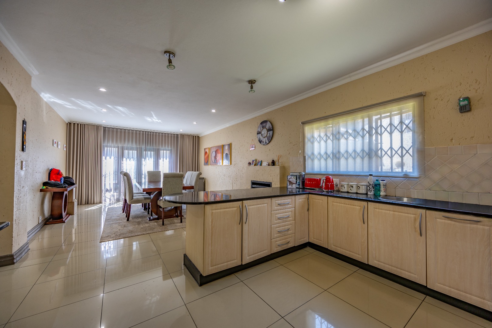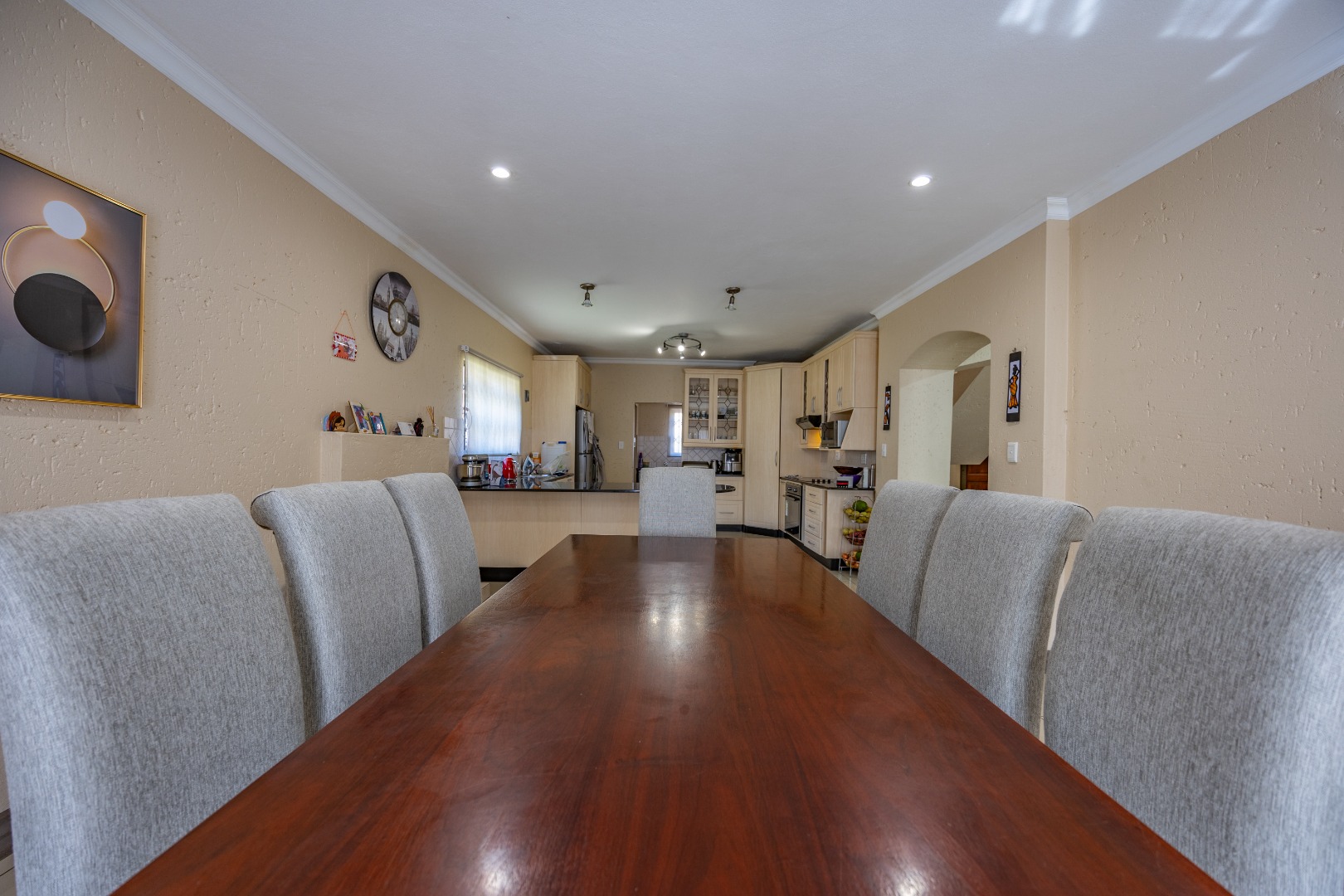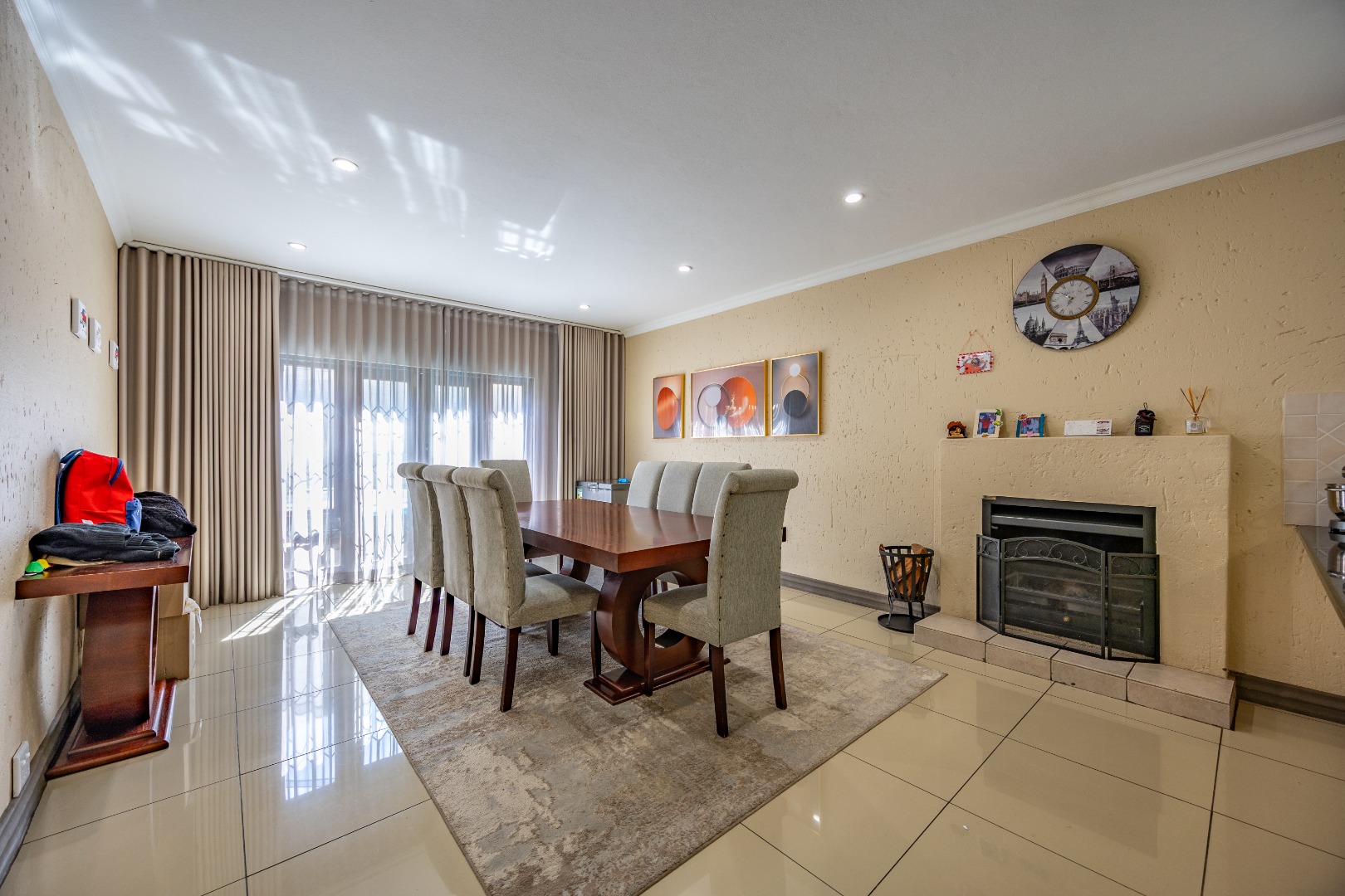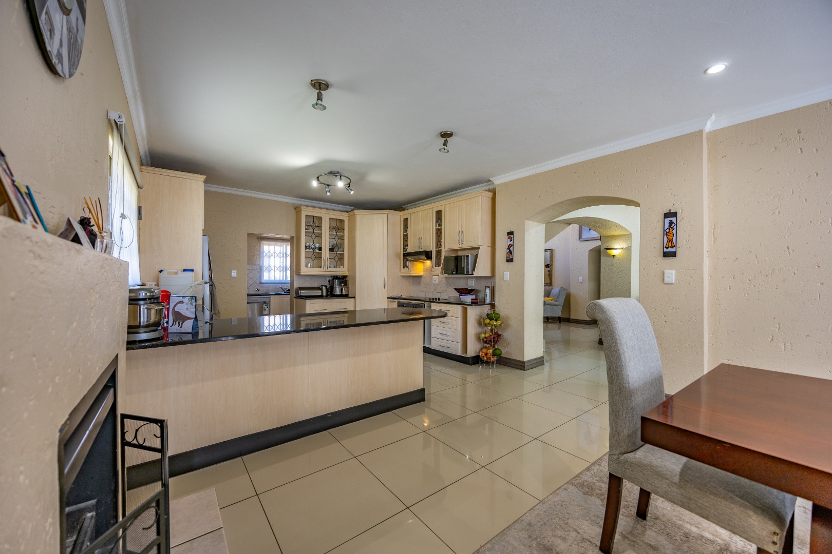Step inside to high ceilings and multiple living areas. The formal TV lounge flows into a dining room with a cozy wood-burning fireplace and doors opening up to the outdoor entertainment space. The newly renovated kitchen is a chef’s delight, featuring a Defy oven, electric hob, extractor fan, double-door fridge space, and a separate scullery with room for three appliances. A second lounge and a dedicated office provide flexibility for work and relaxation.