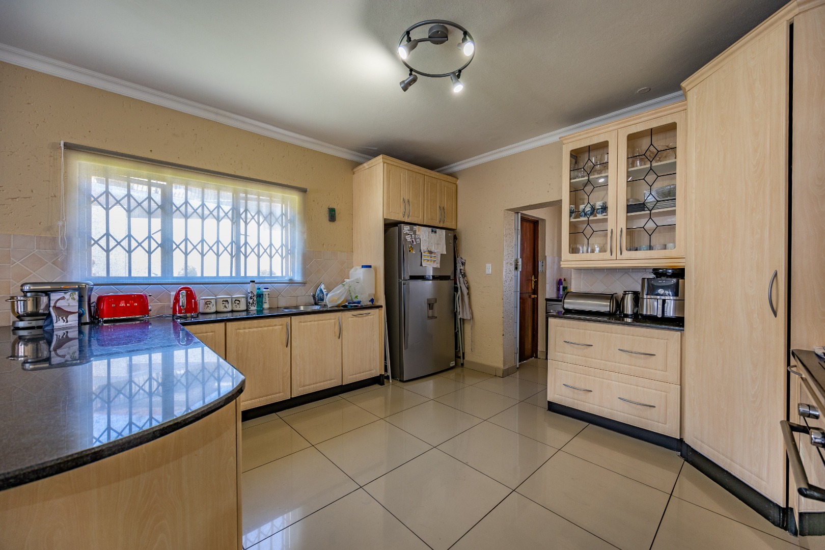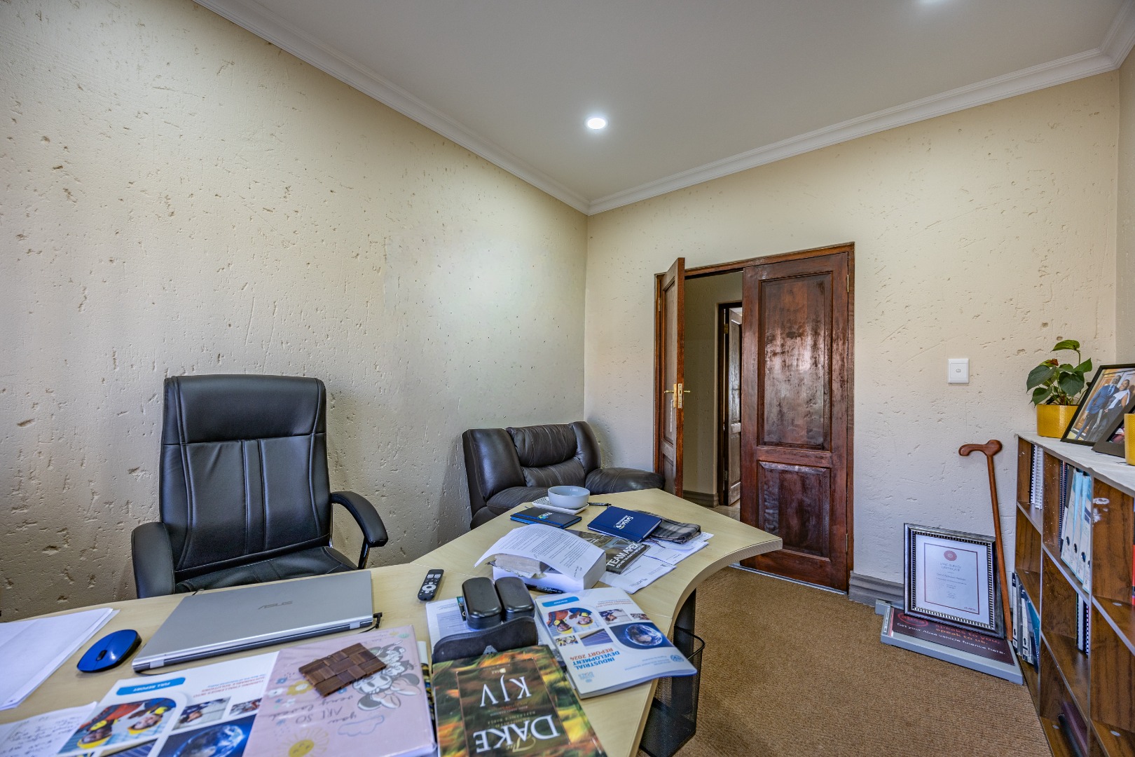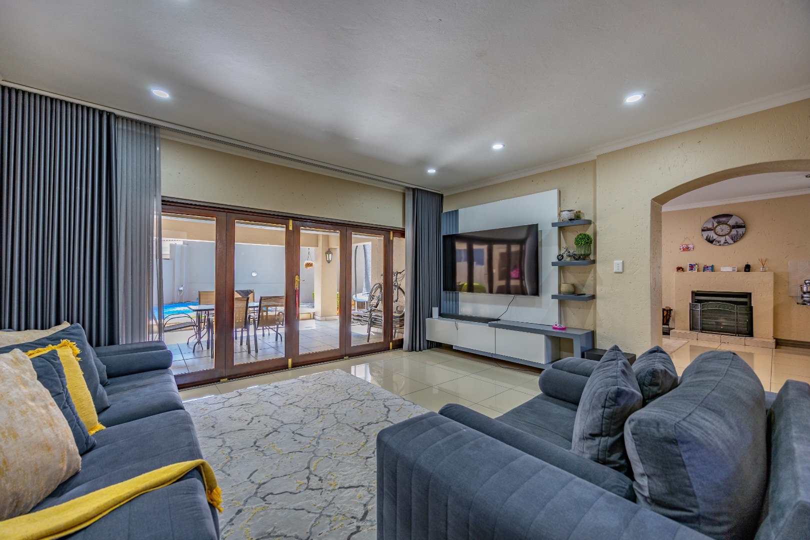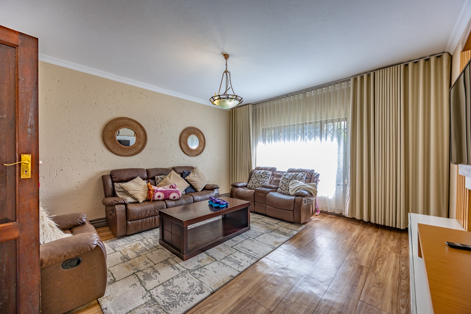 Step inside to high ceilings and multiple living areas. The formal TV lounge flows into a dining room with a cozy wood-burning fireplace and doors opening up to the outdoor entertainment space. The newly renovated kitchen is a chef’s delight, featuring a Defy oven, electric hob, extractor fan, double-door fridge space, and a separate scullery with room for three appliances. A second lounge and a dedicated office provide flexibility for work and relaxation.