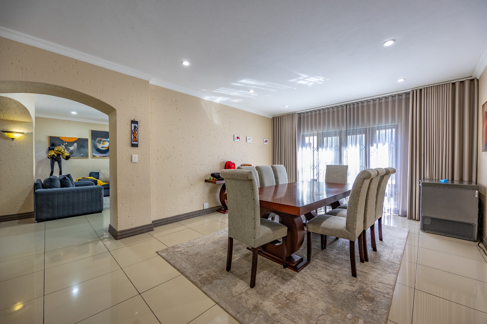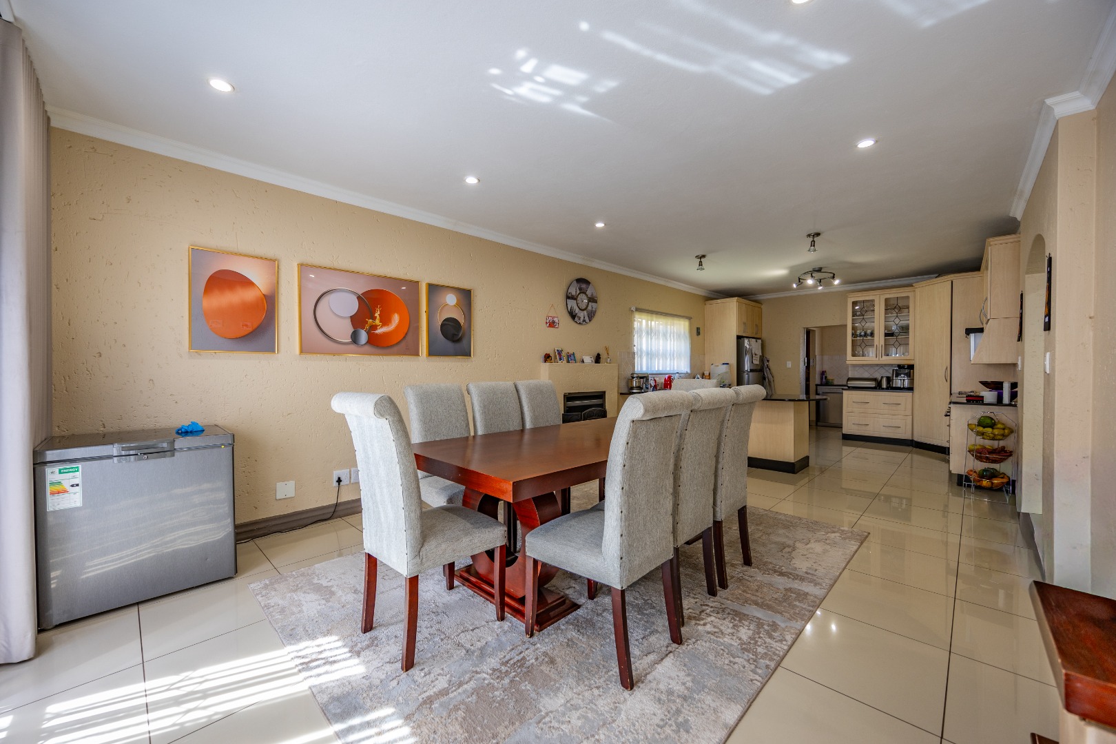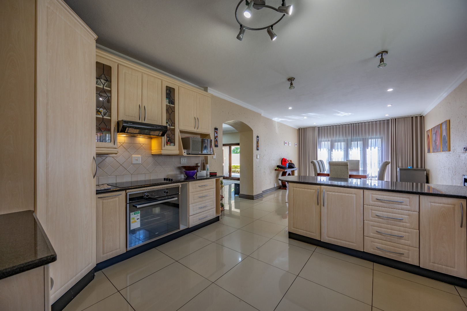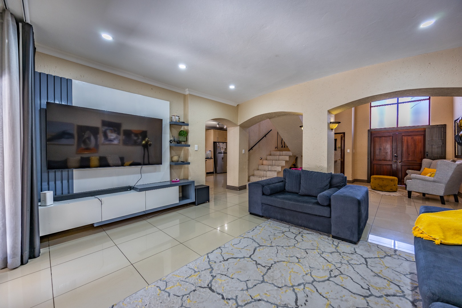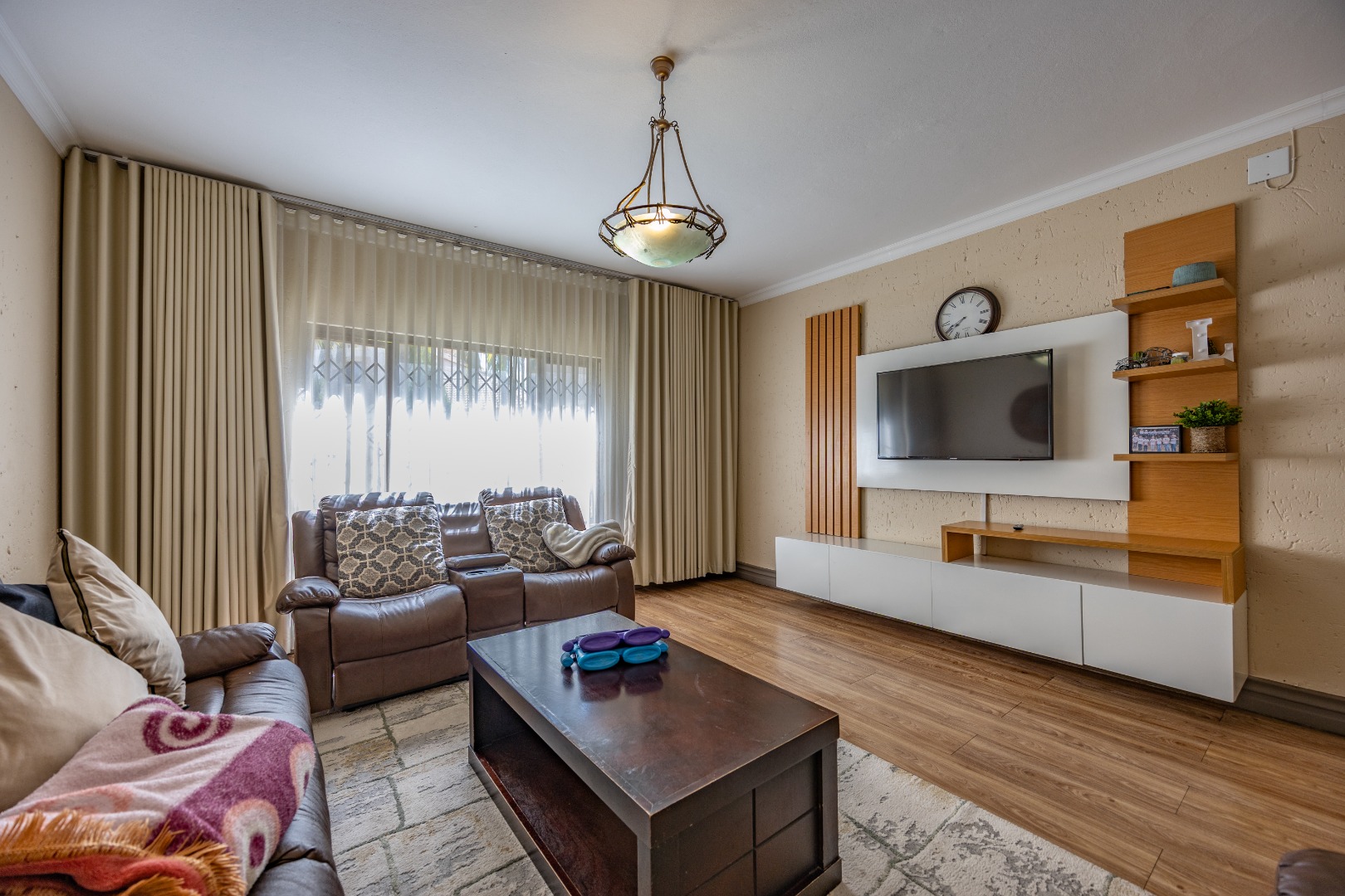 Step inside to high ceilings and multiple living areas. The formal TV lounge flows into a dining room with a cozy wood-burning fireplace and doors opening up to the outdoor entertainment space. The newly renovated kitchen is a chef’s delight, featuring a Defy oven, electric hob, extractor fan, double-door fridge space, and a separate scullery with room for three appliances. A second lounge and a dedicated office provide flexibility for work and relaxation.