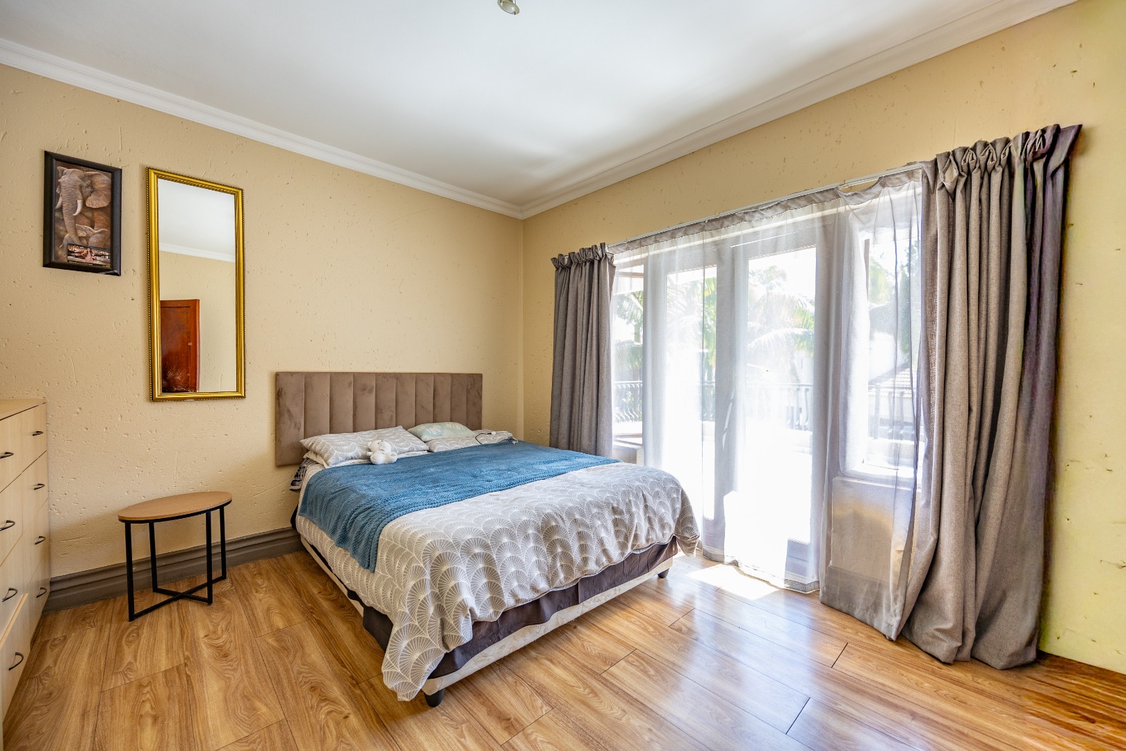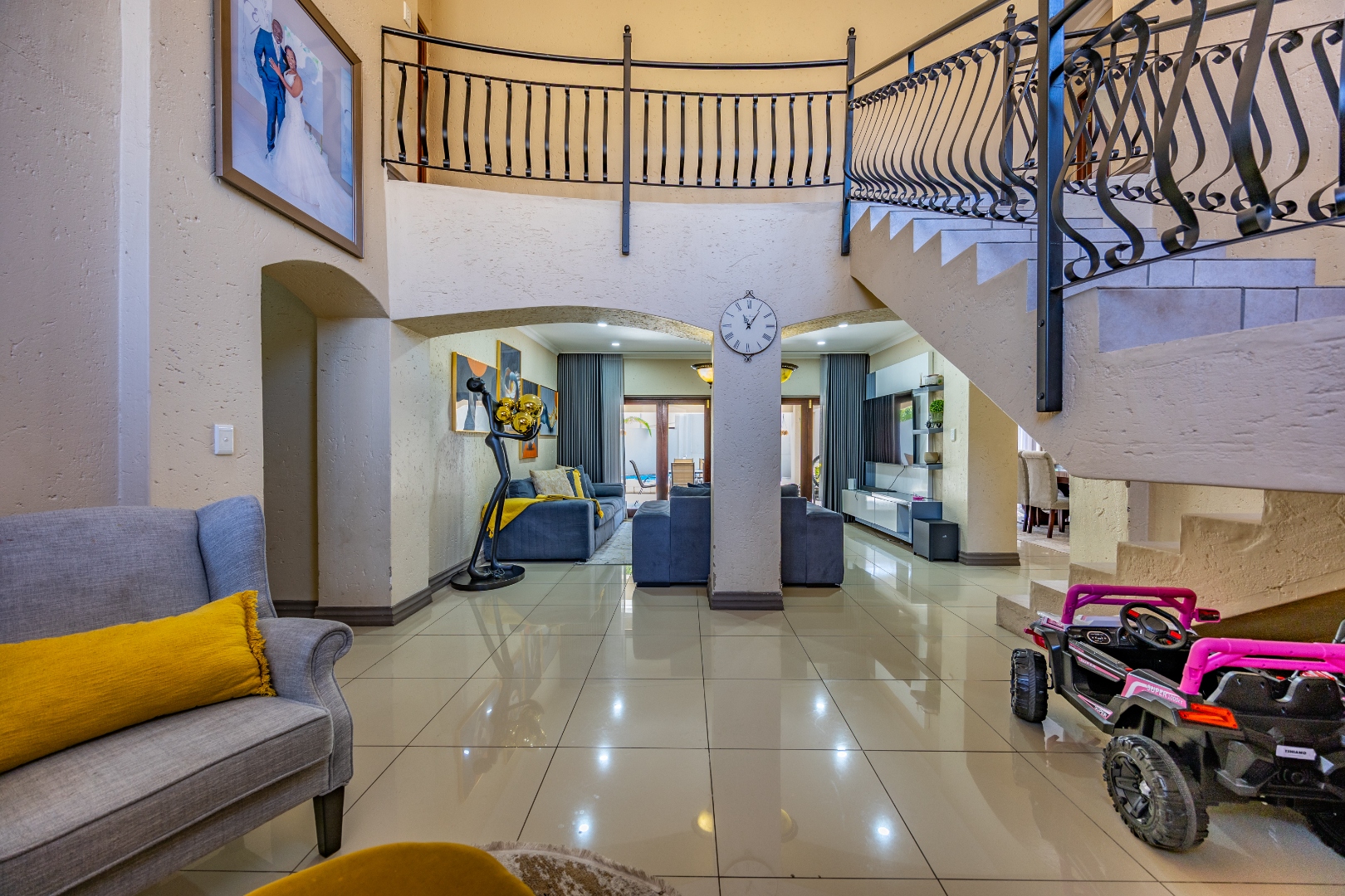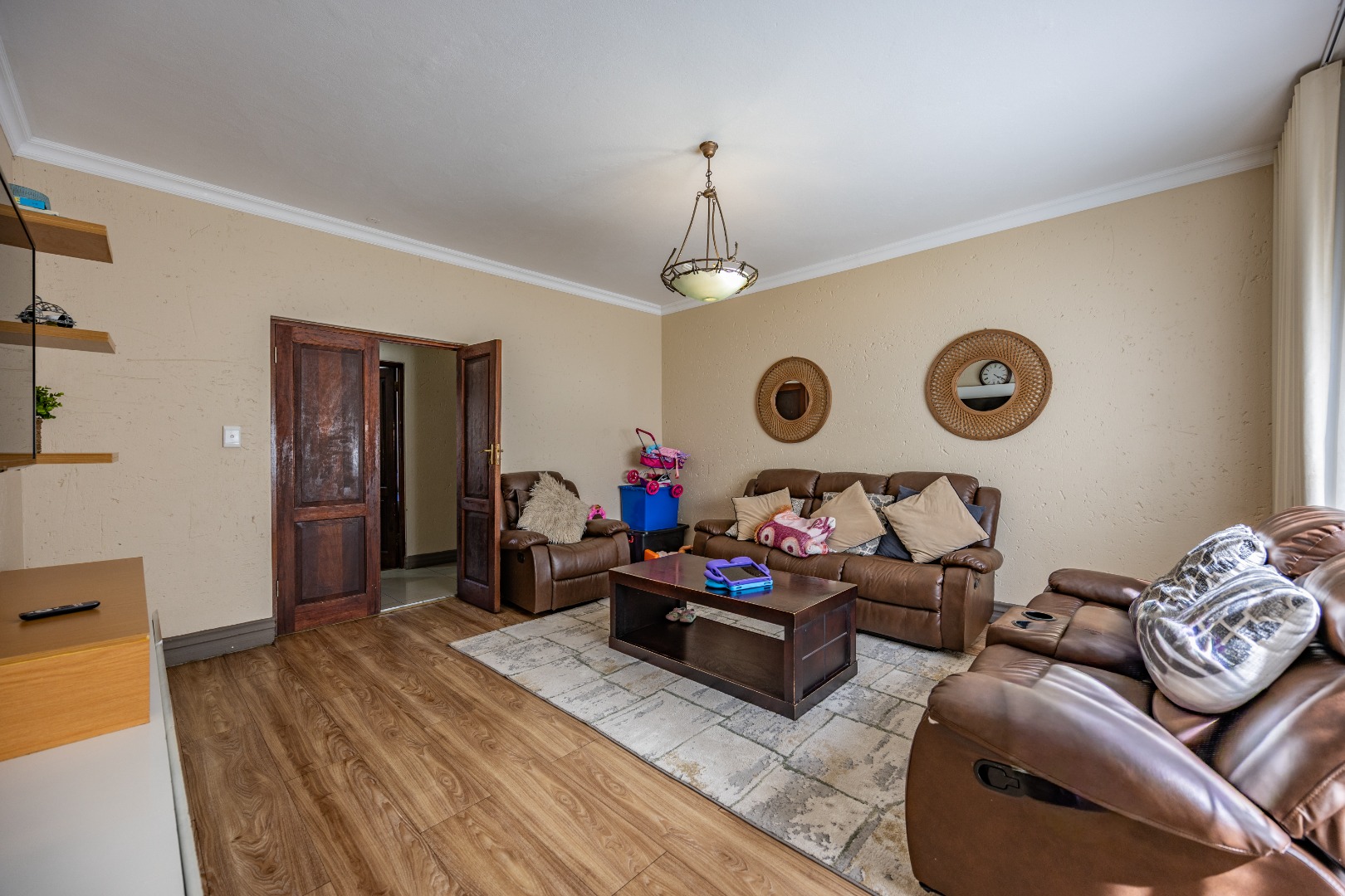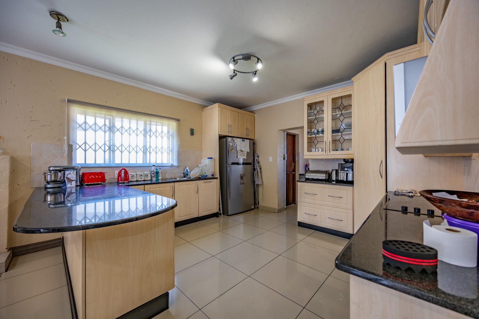 Step inside to high ceilings and multiple living areas. The formal TV lounge flows into a dining room with a cozy wood-burning fireplace and doors opening up to the outdoor entertainment space. The newly renovated kitchen is a chef’s delight, featuring a Defy oven, electric hob, extractor fan, double-door fridge space, and a separate scullery with room for three appliances. A second lounge and a dedicated office provide flexibility for work and relaxation.