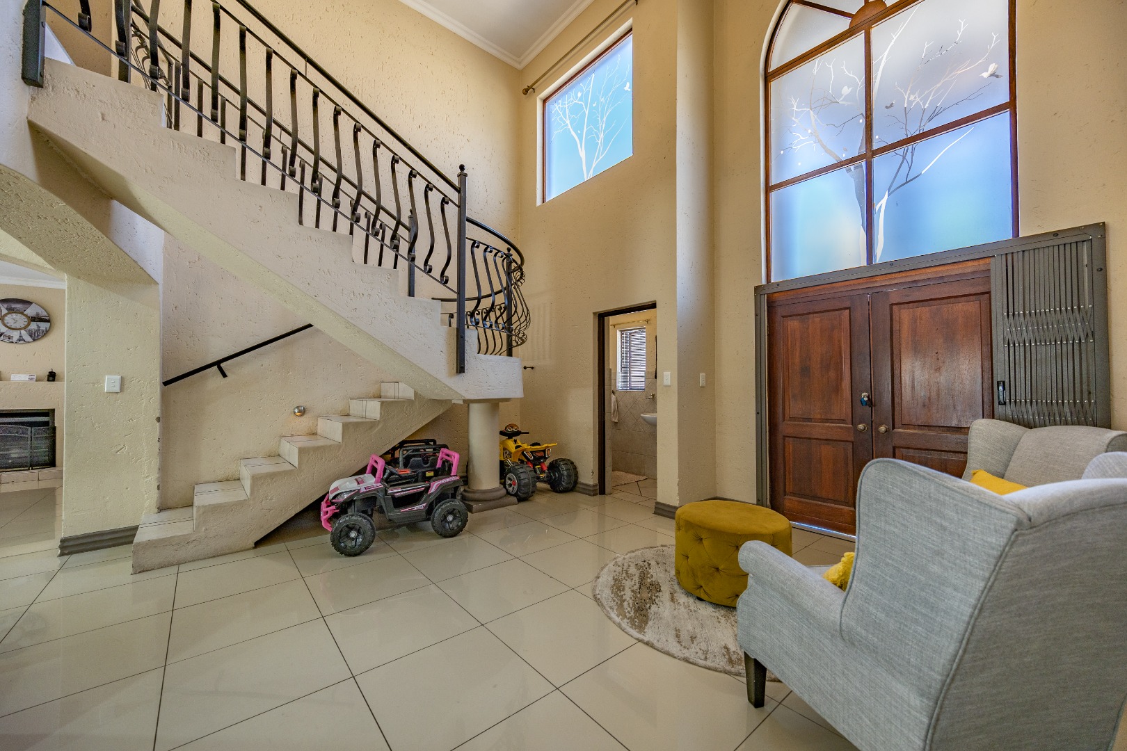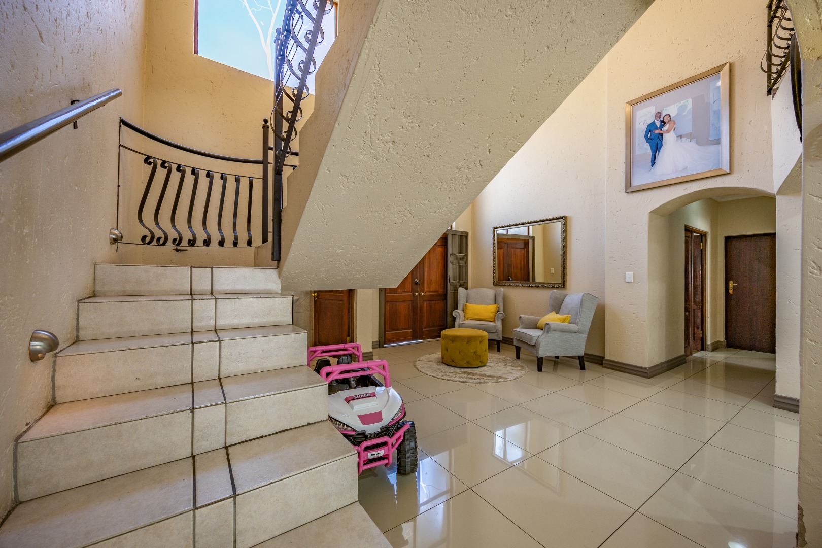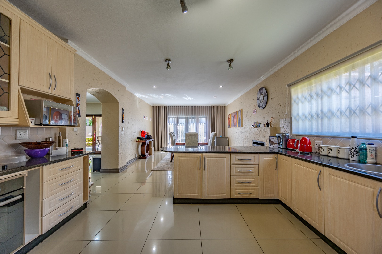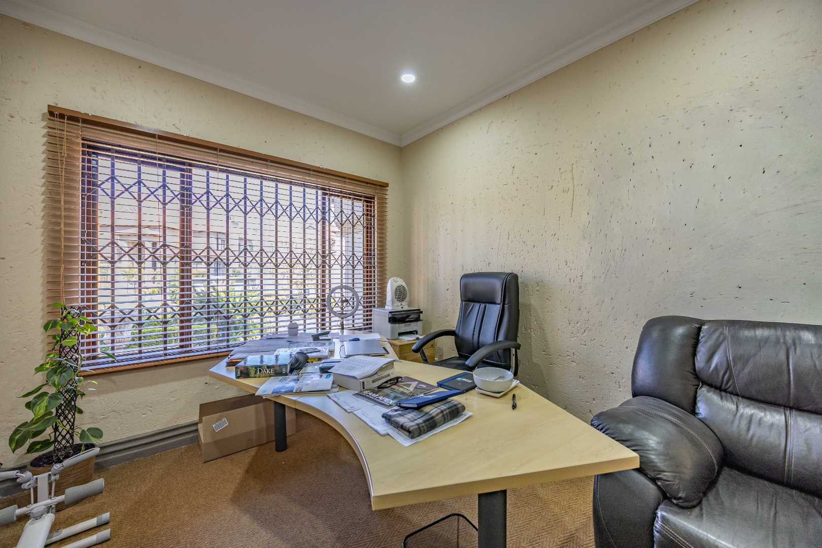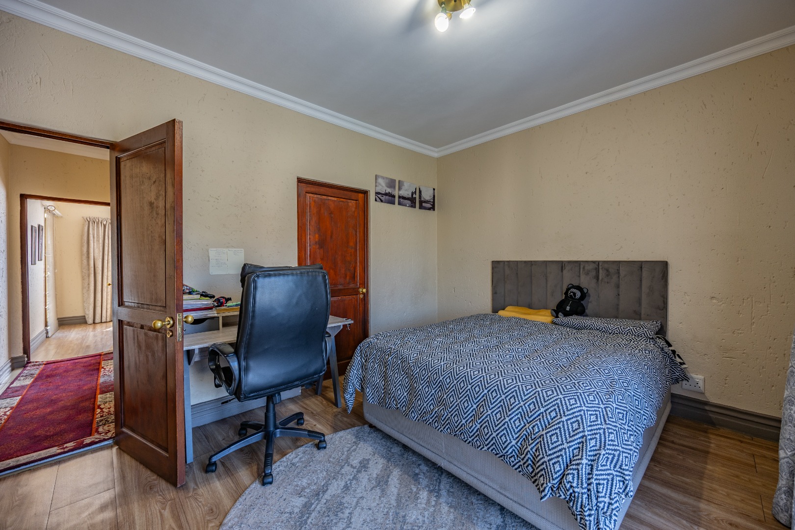 Step inside to high ceilings and multiple living areas. The formal TV lounge flows into a dining room with a cozy wood-burning fireplace and doors opening up to the outdoor entertainment space. The newly renovated kitchen is a chef’s delight, featuring a Defy oven, electric hob, extractor fan, double-door fridge space, and a separate scullery with room for three appliances. A second lounge and a dedicated office provide flexibility for work and relaxation.