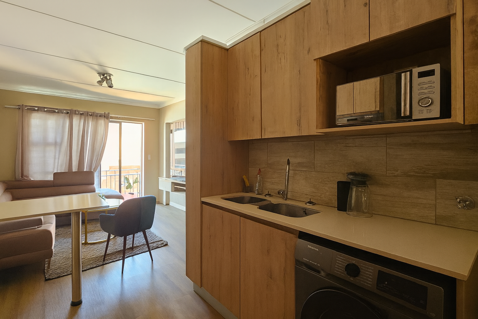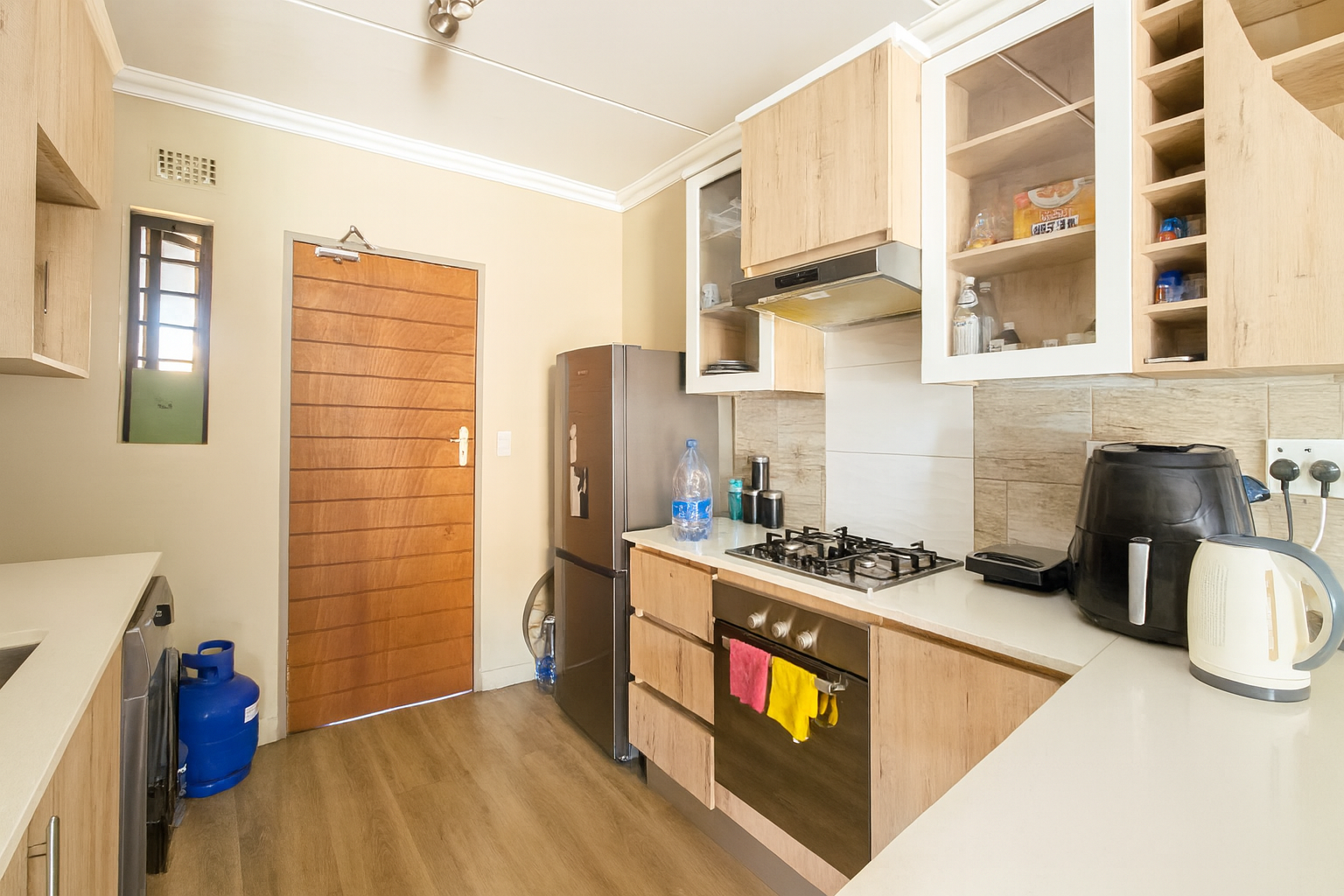 The apartment features two spacious bedrooms, both fitted with built-in cupboards. The main bedroom offers ample space, while the second bedroom comfortably accommodates a double bed, perfect for a small family, couple, or young professional. The open-plan kitchen and living area create a warm and welcoming atmosphere, ideal for entertaining. The kitchen is equipped with a gas stove and geyser, helping you save on electricity costs.