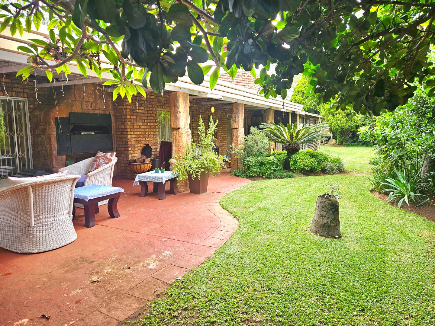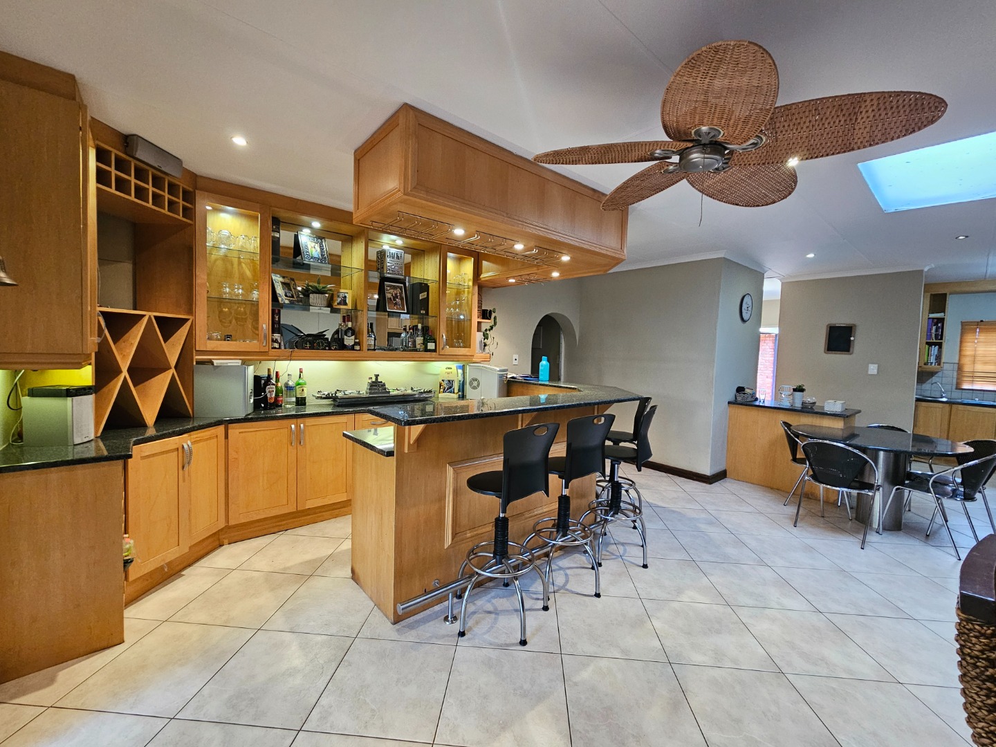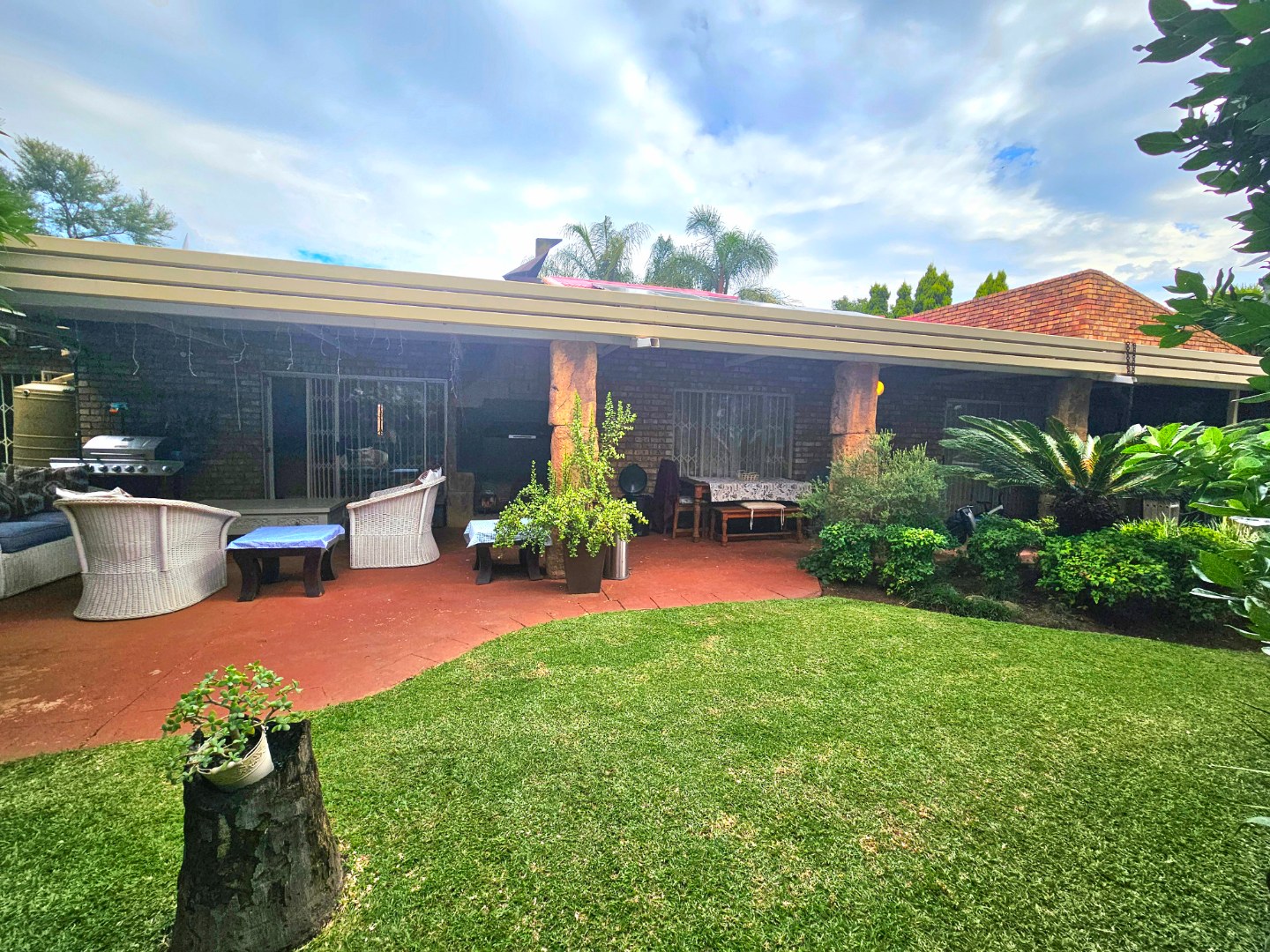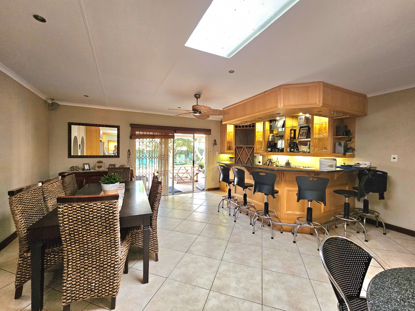 This stunning, single storey, five bedroom or four bedroom and study house offers much more than what meets the eye. The benefits include the security of the Moreleta Village estate, the solar system, the water tank and irrigation. The well maintained home boasts an open plan kitchen with granite tops, breakfast nook, pantry, gas stove, space for double fridges and ample beachwood cupboards which extend into the scullery/laundry area. The scullery has space for 3 appliance, including a top loader. The spacious, open plan area has a living area/dining room and a built-in bar, ideal for entertaining family and friends. It leads out through a sliding door onto a patio with a built-in Braai and a garden where you can continue to entertain or simply relax while sipping cocktails by the solar heated swimming pool, watching the children playing in the garden and tree house. The front door leads down a passage to 2 big lounges with sliding doors, a guest toilet and a air conditioned bedroom/ study with laminated flooring and a door leading outside onto the front garden, ideal for a home office. The other four carpeted bedrooms and 2 full bathrooms are on the other side of the house. The Main bathroom is en-suite and has a double shower and basin. The master bedroom is spacious and has a door to the backyard. The house includes 2 garages, 2 carport , ample parking space, staff quarters with shower and toilet, store room and fibre. The solar system includes 14 panels, a 8.8KW invertor and battery.