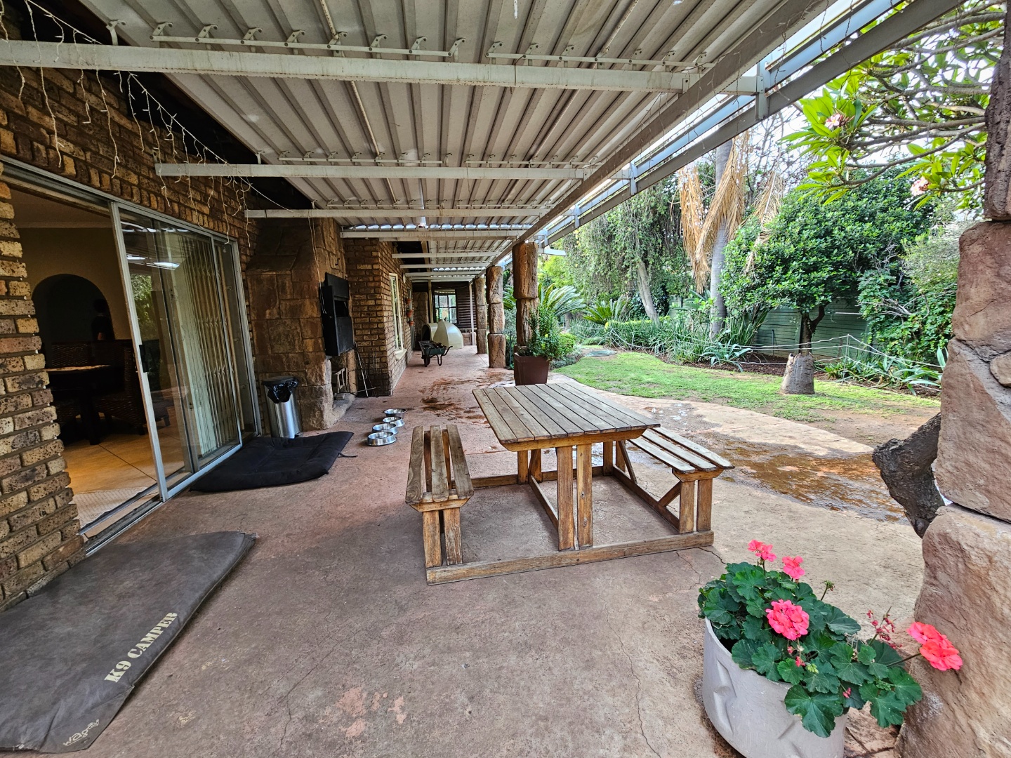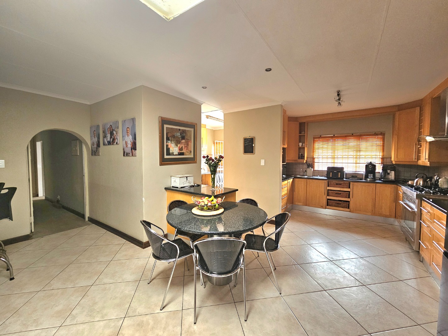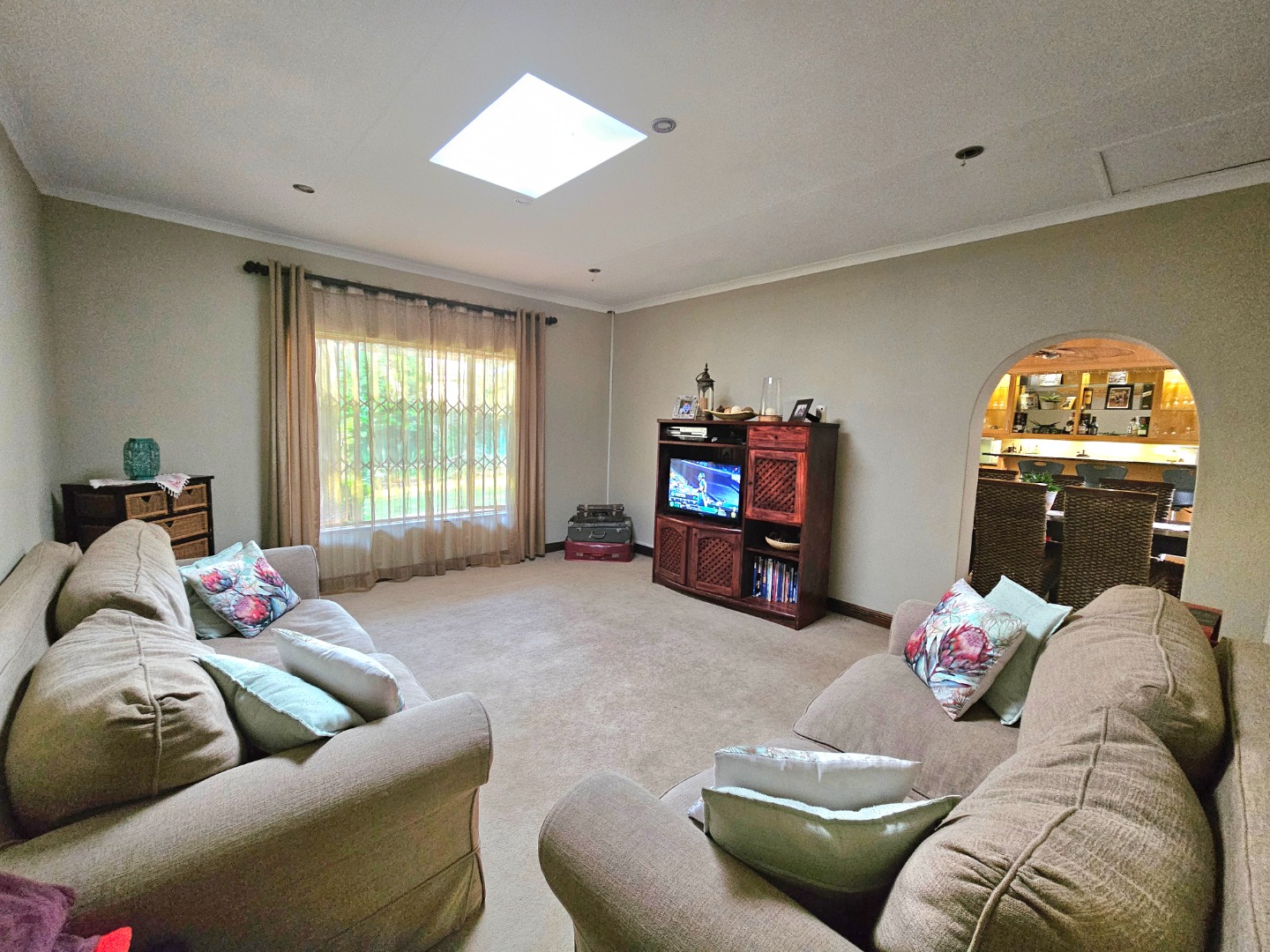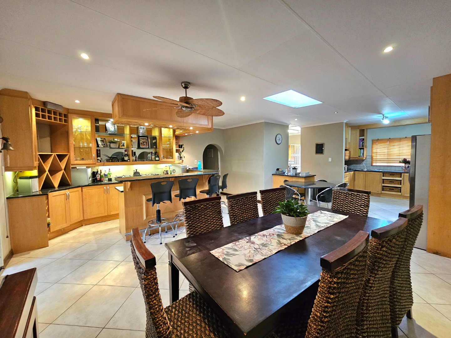 This stunning, single storey, five bedroom or four bedroom and study house offers much more than what meets the eye. The benefits include the security of the Moreleta Village estate, the solar system, the water tank and irrigation. The well maintained home boasts an open plan kitchen with granite tops, breakfast nook, pantry, gas stove, space for double fridges and ample beachwood cupboards which extend into the scullery/laundry area. The scullery has space for 3 appliance, including a top loader. The spacious, open plan area has a living area/dining room and a built-in bar, ideal for entertaining family and friends. It leads out through a sliding door onto a patio with a built-in Braai and a garden where you can continue to entertain or simply relax while sipping cocktails by the solar heated swimming pool, watching the children playing in the garden and tree house. The front door leads down a passage to 2 big lounges with sliding doors, a guest toilet and a air conditioned bedroom/ study with laminated flooring and a door leading outside onto the front garden, ideal for a home office. The other four carpeted bedrooms and 2 full bathrooms are on the other side of the house. The Main bathroom is en-suite and has a double shower and basin. The master bedroom is spacious and has a door to the backyard. The house includes 2 garages, 2 carport , ample parking space, staff quarters with shower and toilet, store room and fibre. The solar system includes 14 panels, a 8.8KW invertor and battery.