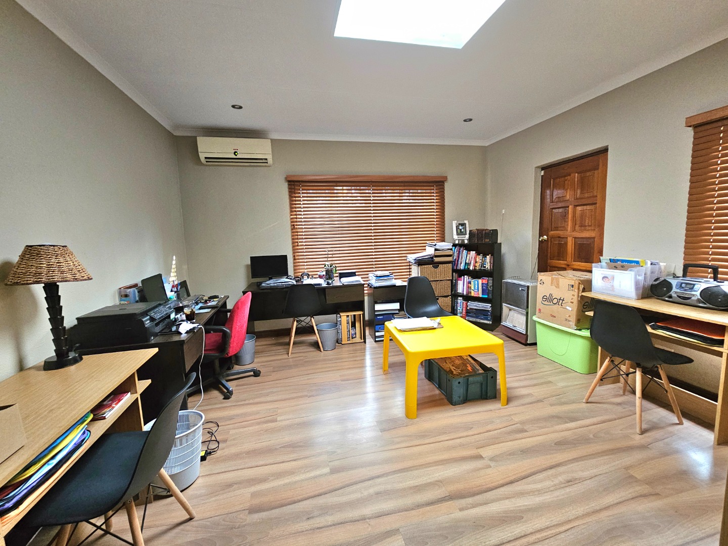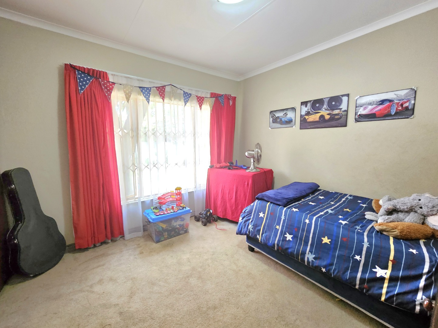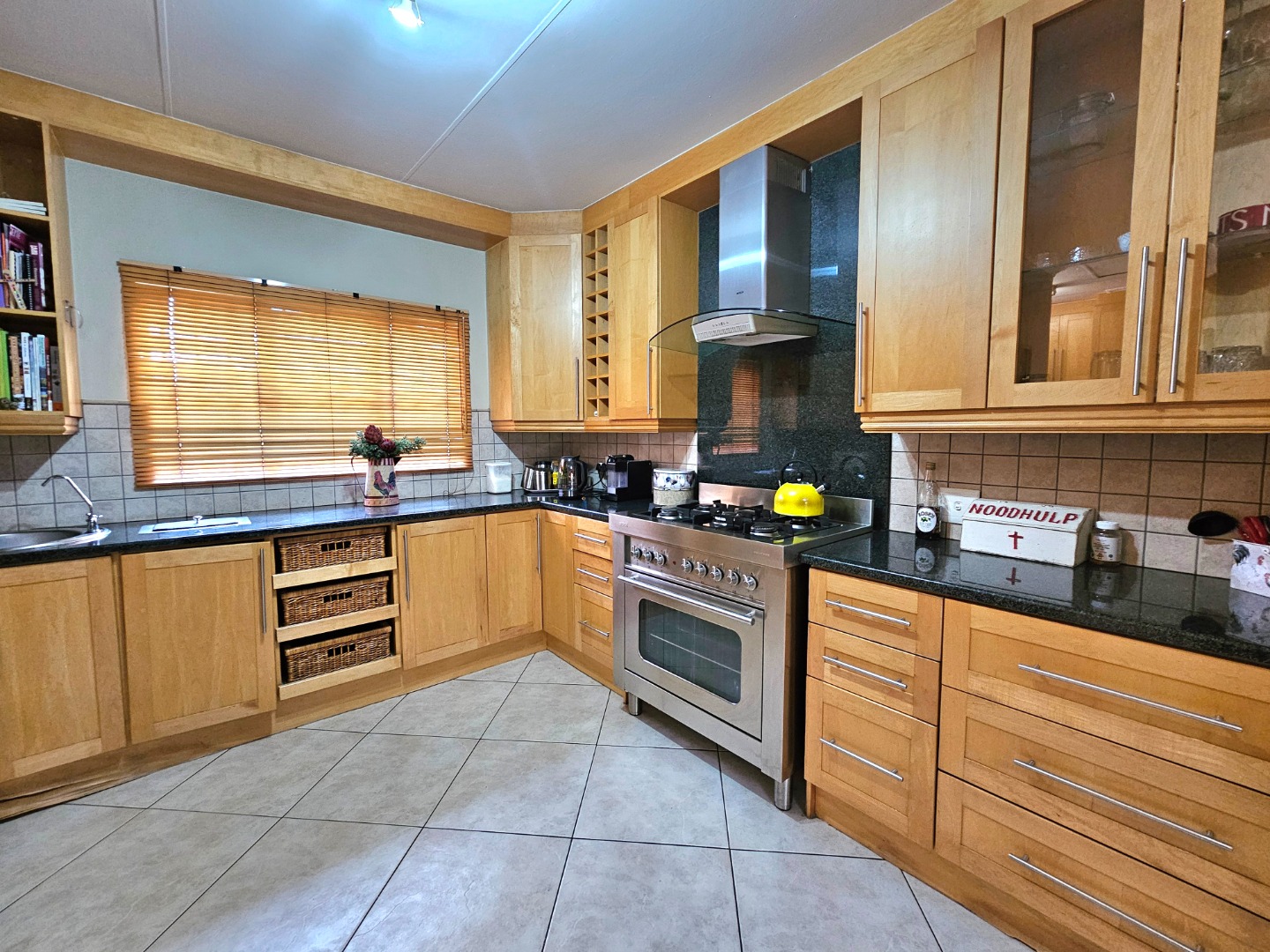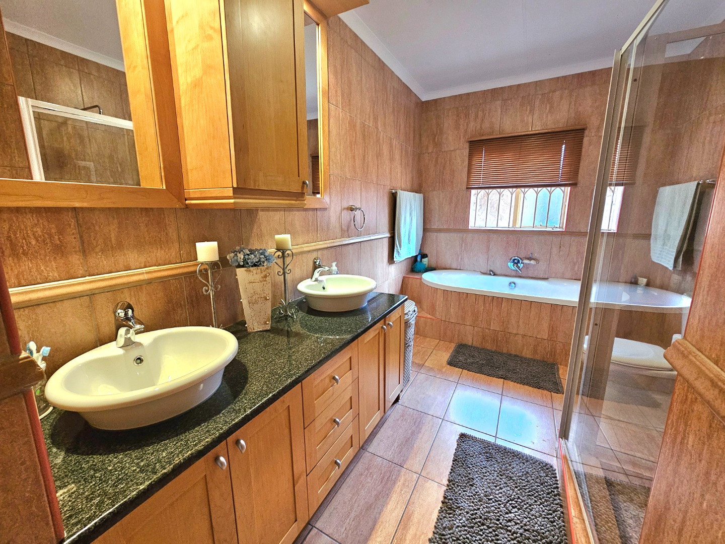 This stunning, single storey, five bedroom or four bedroom and study house offers much more than what meets the eye. The benefits include the security of the Moreleta Village estate, the solar system, the water tank and irrigation. The well maintained home boasts an open plan kitchen with granite tops, breakfast nook, pantry, gas stove, space for double fridges and ample beachwood cupboards which extend into the scullery/laundry area. The scullery has space for 3 appliance, including a top loader. The spacious, open plan area has a living area/dining room and a built-in bar, ideal for entertaining family and friends. It leads out through a sliding door onto a patio with a built-in Braai and a garden where you can continue to entertain or simply relax while sipping cocktails by the solar heated swimming pool, watching the children playing in the garden and tree house. The front door leads down a passage to 2 big lounges with sliding doors, a guest toilet and a air conditioned bedroom/ study with laminated flooring and a door leading outside onto the front garden, ideal for a home office. The other four carpeted bedrooms and 2 full bathrooms are on the other side of the house. The Main bathroom is en-suite and has a double shower and basin. The master bedroom is spacious and has a door to the backyard. The house includes 2 garages, 2 carport , ample parking space, staff quarters with shower and toilet, store room and fibre. The solar system includes 14 panels, a 8.8KW invertor and battery.
