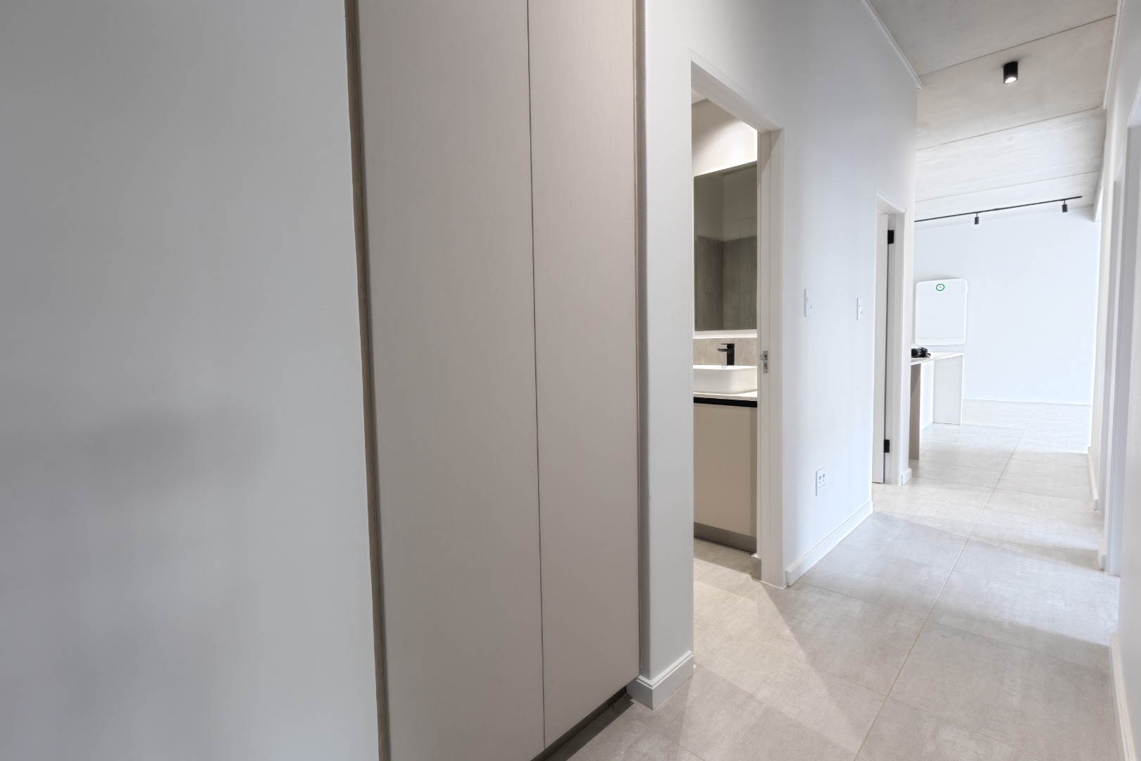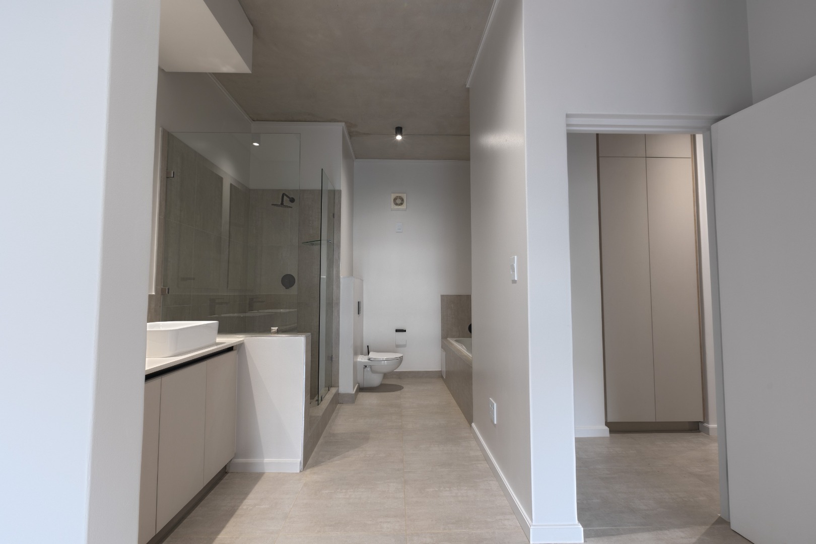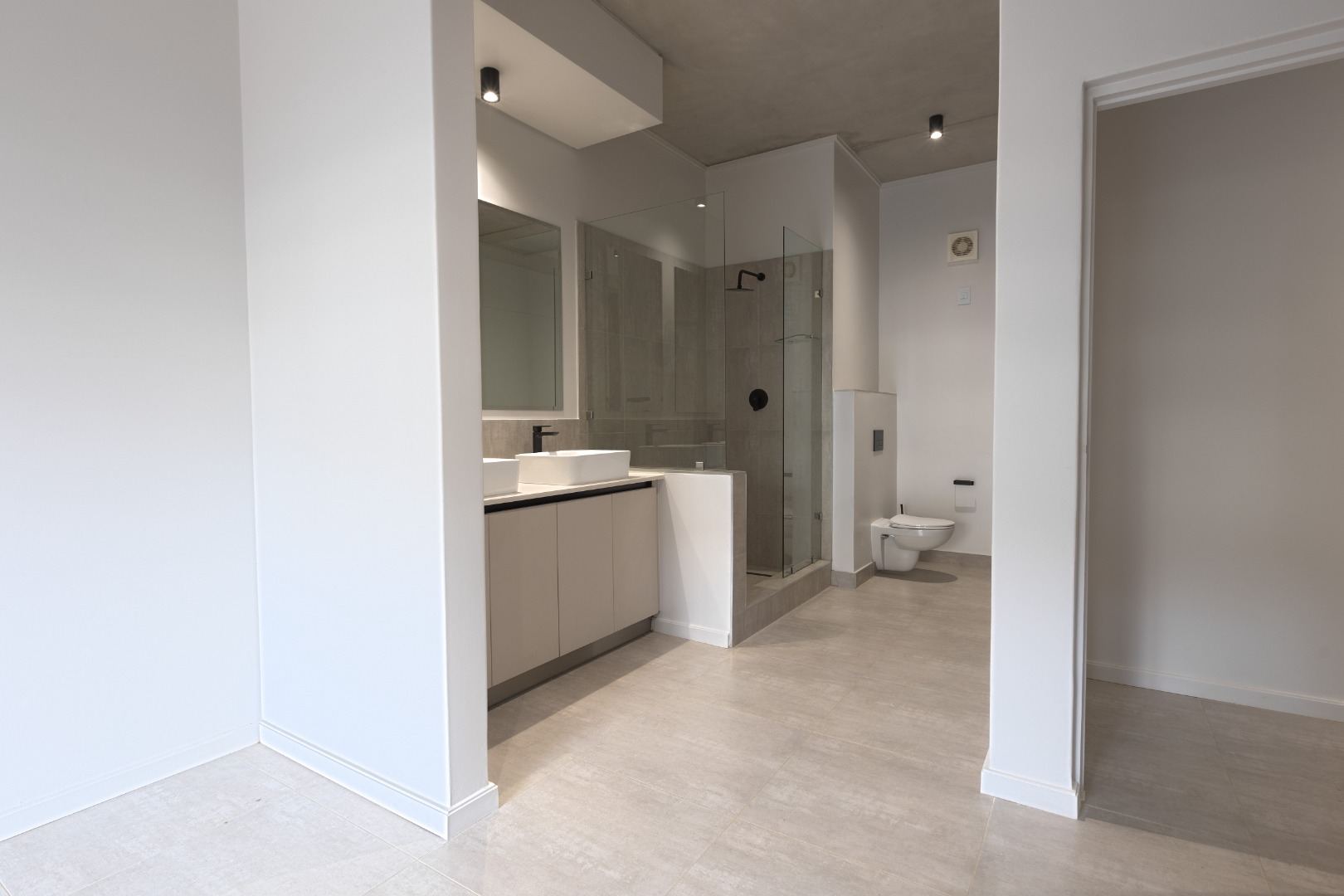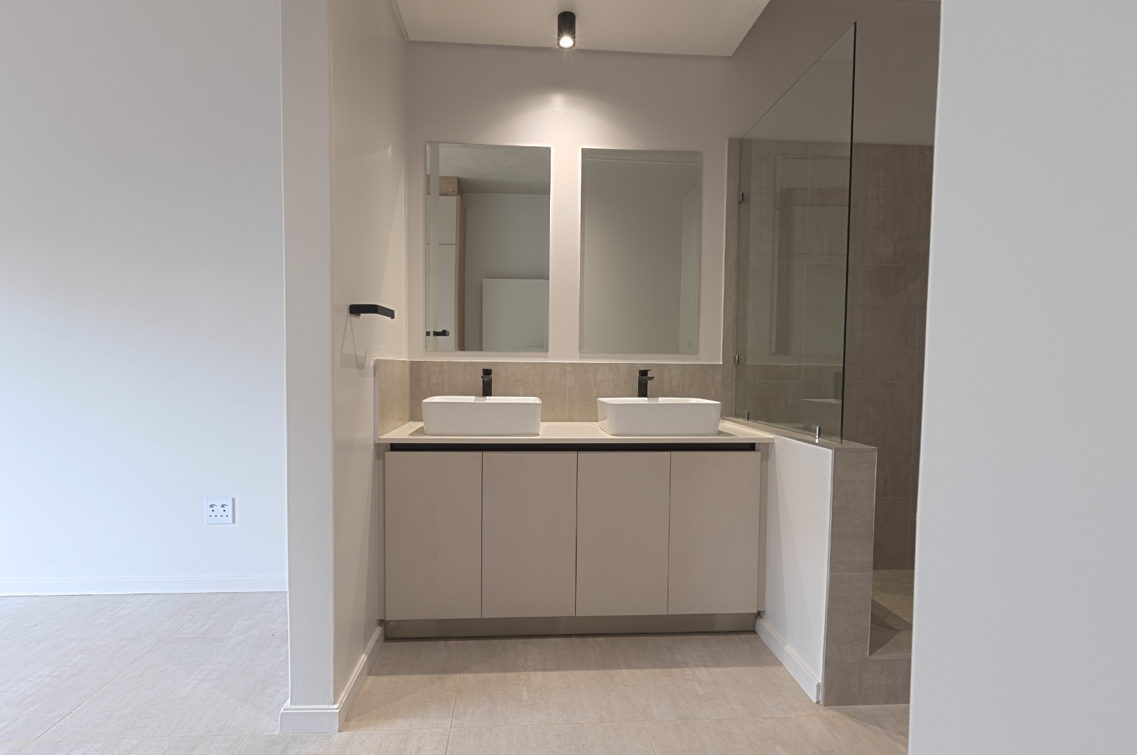 Each of the three bedrooms is generously sized with modern built-in cupboards and premium flooring. The bathrooms are finished to a superior standard, showcasing floating vanities, large mirrors, frameless showers, and refined neutral tiling. The main en-suite offers a luxurious double vanity and spacious shower, creating a serene retreat. Every bathroom carries the same contemporary aesthetic, ensuring a cohesive and elegant feel throughout the home.