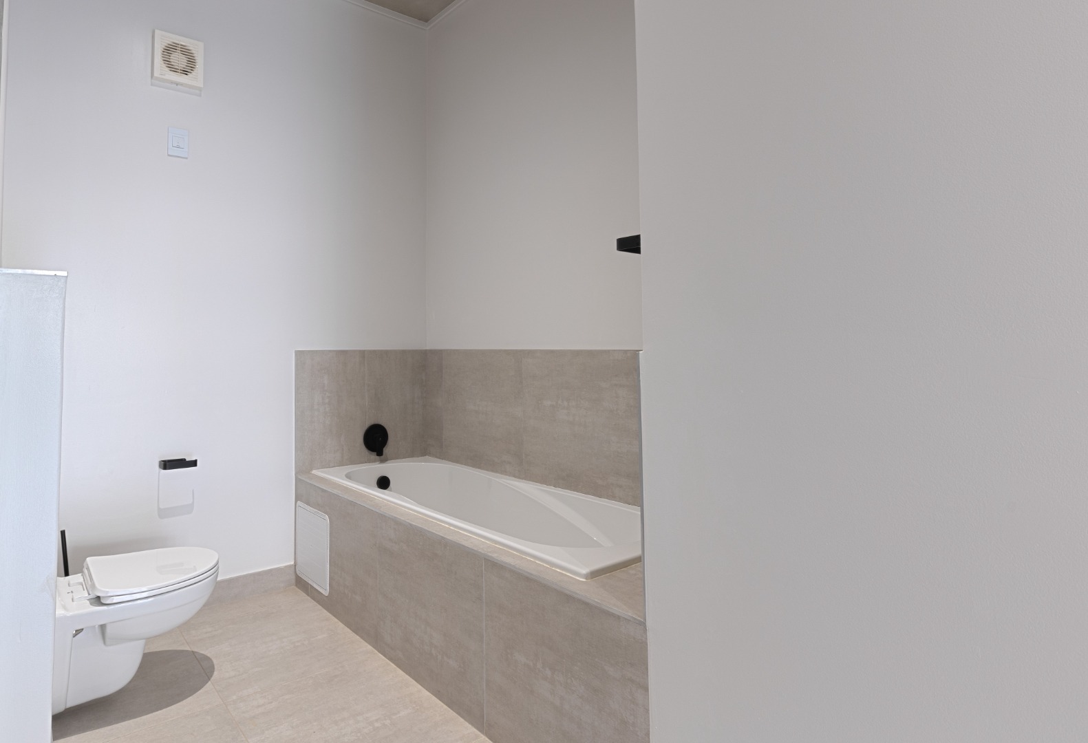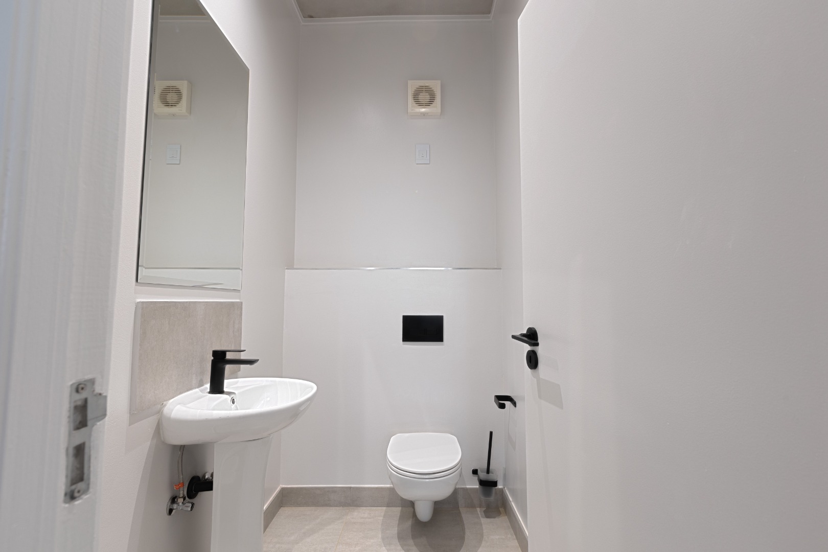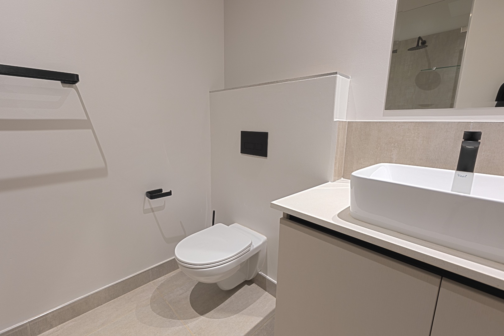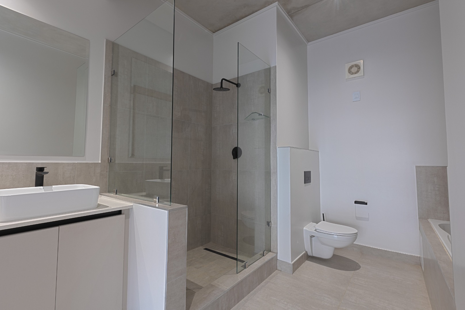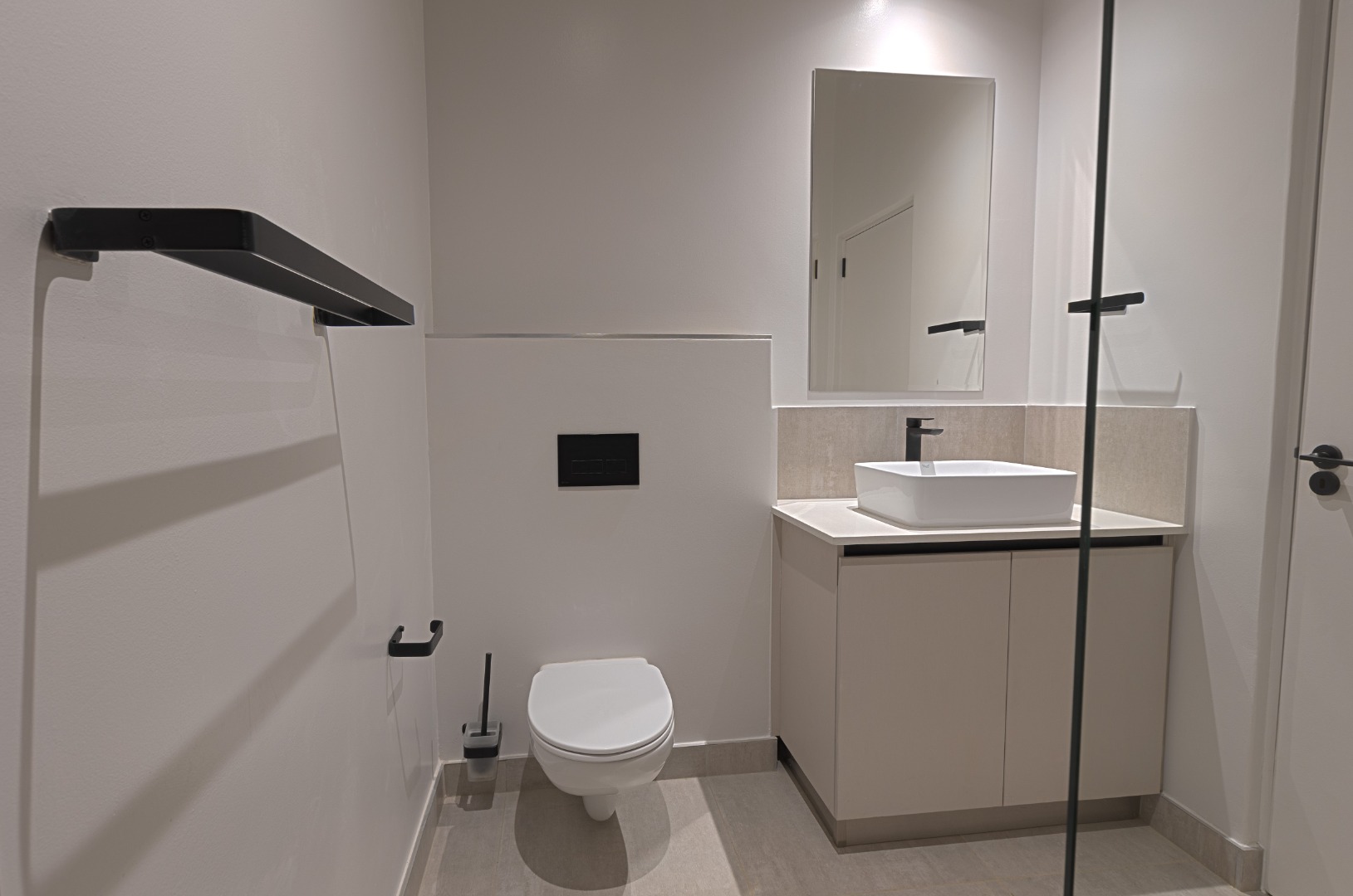 Each of the three bedrooms is generously sized with modern built-in cupboards and premium flooring. The bathrooms are finished to a superior standard, showcasing floating vanities, large mirrors, frameless showers, and refined neutral tiling. The main en-suite offers a luxurious double vanity and spacious shower, creating a serene retreat. Every bathroom carries the same contemporary aesthetic, ensuring a cohesive and elegant feel throughout the home.