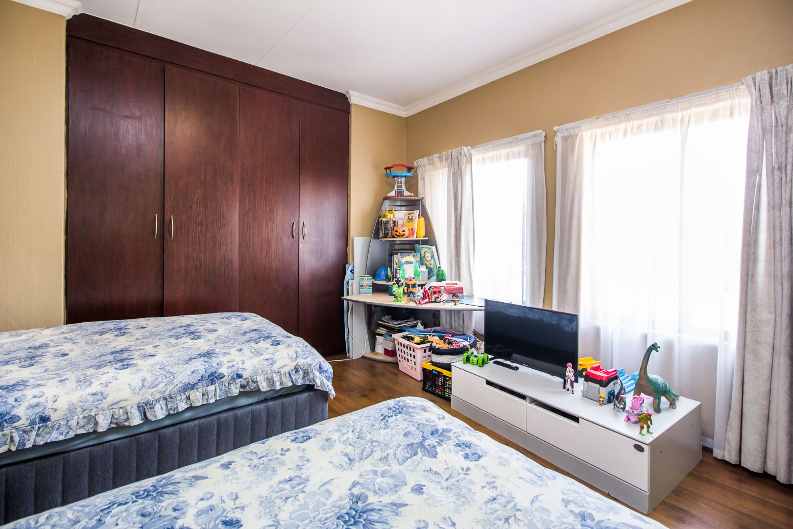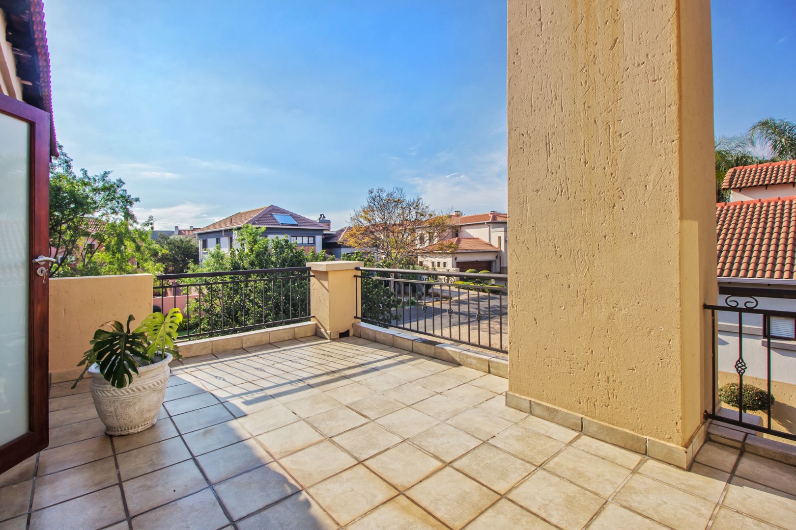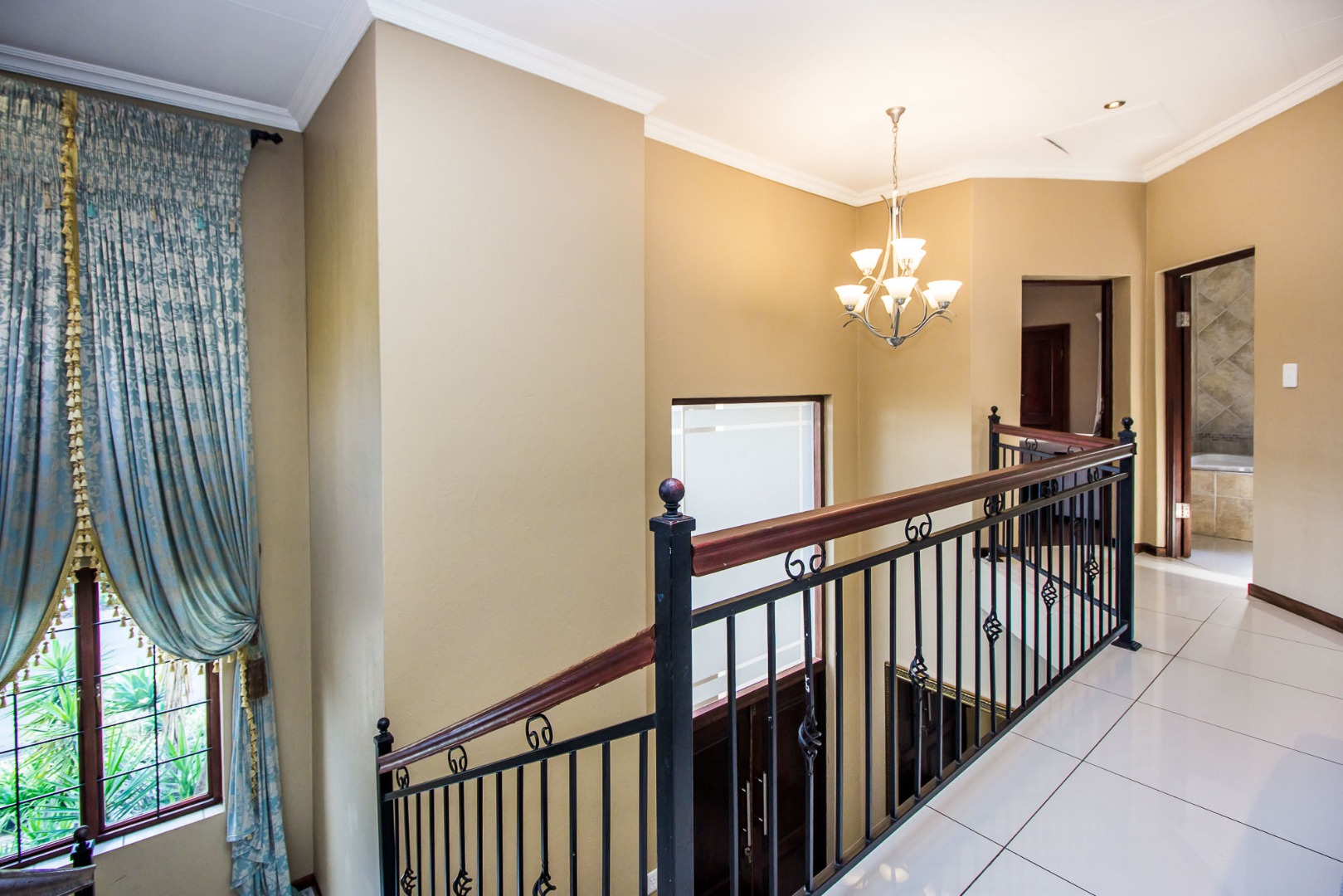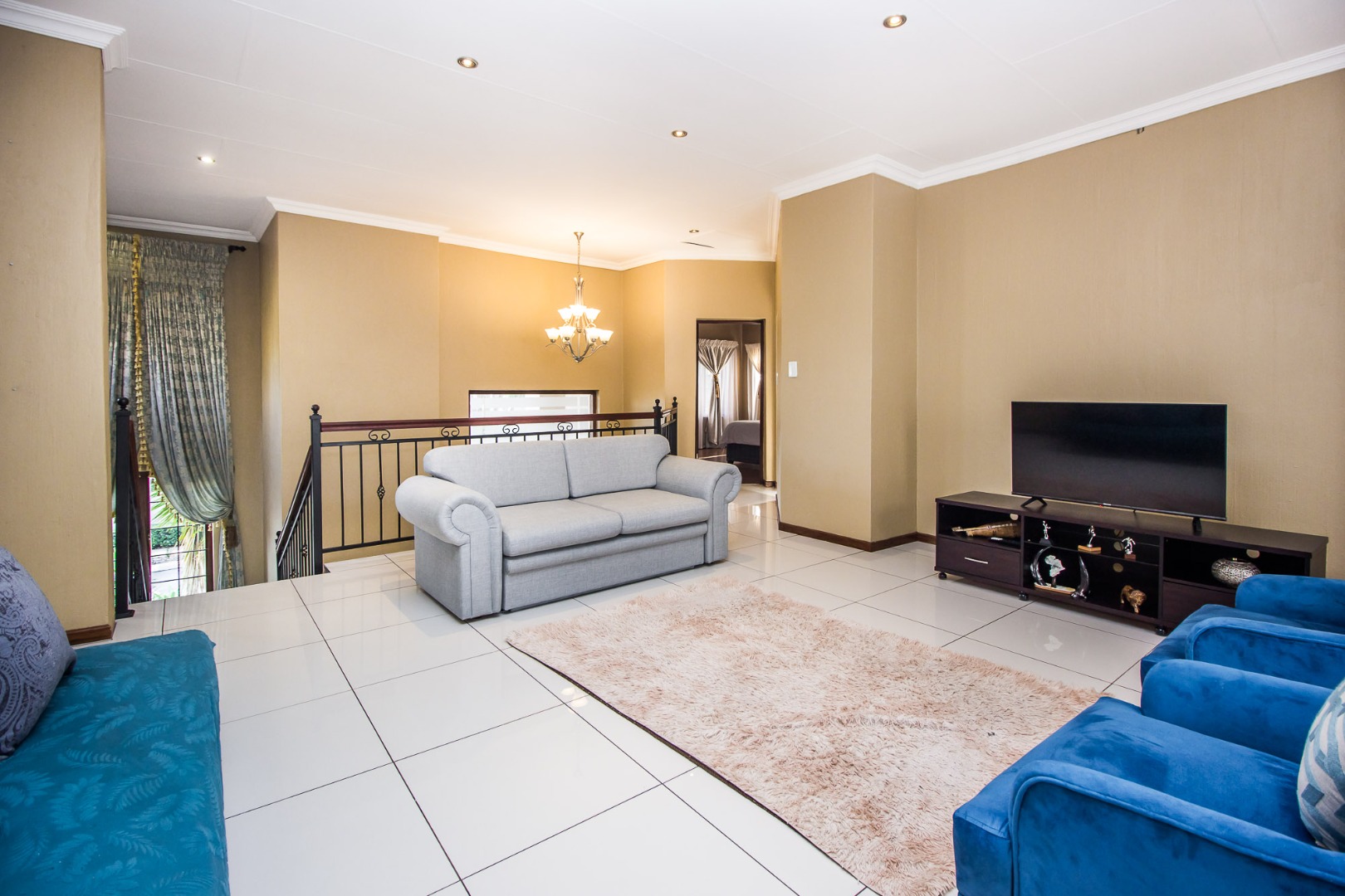 Upstairs offers an easy-living private wing for the family. The pajama lounge opens onto a balcony, giving you a relaxed second living space perfect for a TV room, reading area or kids’ lounge. Two well-sized bedrooms with built-in cupboards and laminated flooring share a full bathroom, making it ideal for children or guests. The main bedroom is a standout feature — spacious, bright and designed for comfort, complete with a walk-in wardrobe, a full en-suite bathroom, and its own private balcony. Curtains remain throughout the home, making move-in simple. With multiple balconies, generous living zones, secure estate living and a practical layout that suits modern family life, this home delivers a well-rounded rental option in the heart of Olympus AH.