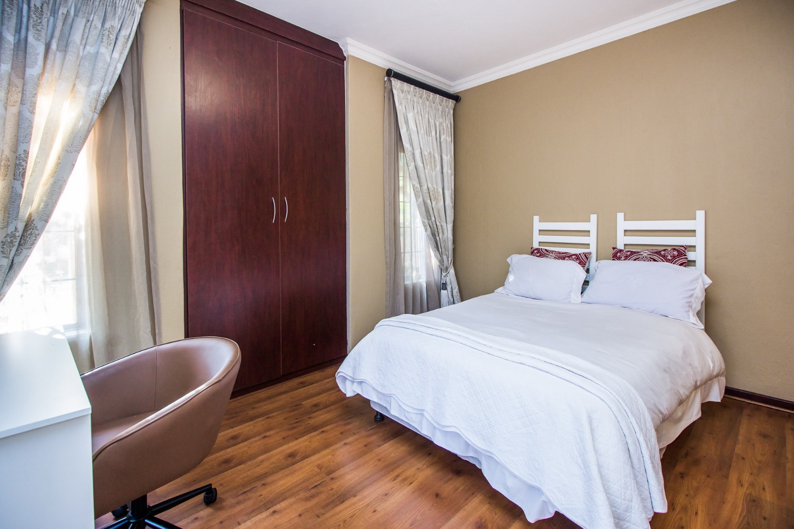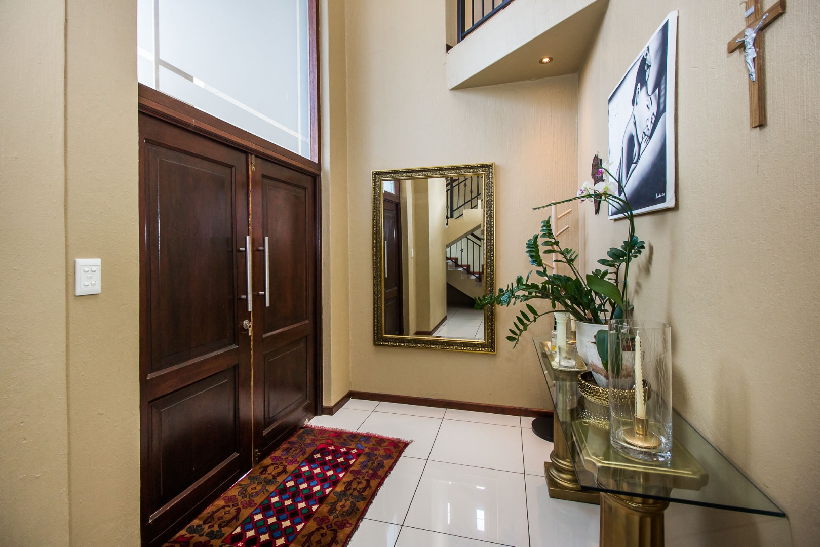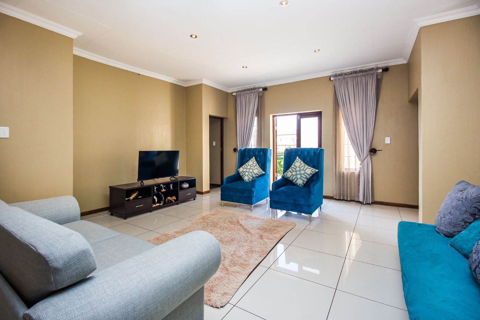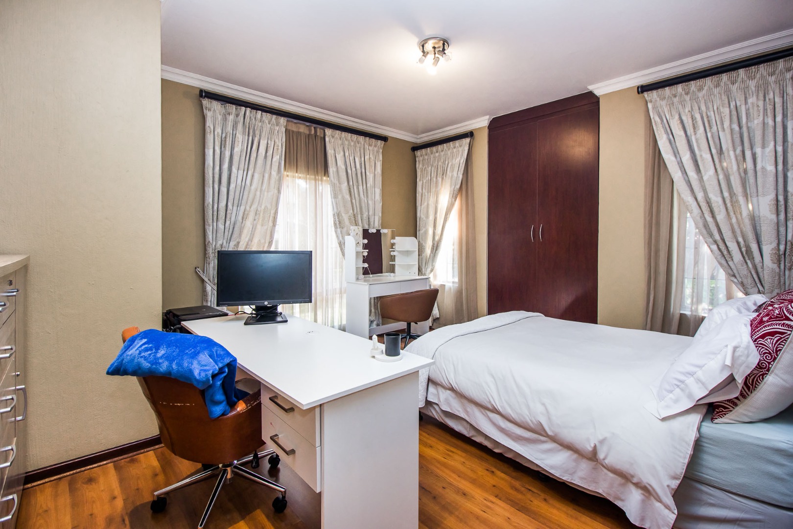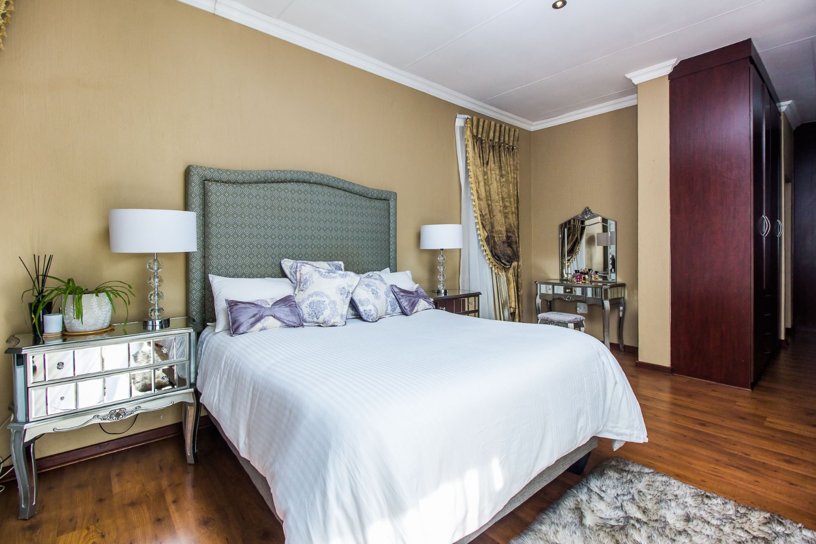 Upstairs offers an easy-living private wing for the family. The pajama lounge opens onto a balcony, giving you a relaxed second living space perfect for a TV room, reading area or kids’ lounge. Two well-sized bedrooms with built-in cupboards and laminated flooring share a full bathroom, making it ideal for children or guests. The main bedroom is a standout feature — spacious, bright and designed for comfort, complete with a walk-in wardrobe, a full en-suite bathroom, and its own private balcony. Curtains remain throughout the home, making move-in simple. With multiple balconies, generous living zones, secure estate living and a practical layout that suits modern family life, this home delivers a well-rounded rental option in the heart of Olympus AH.