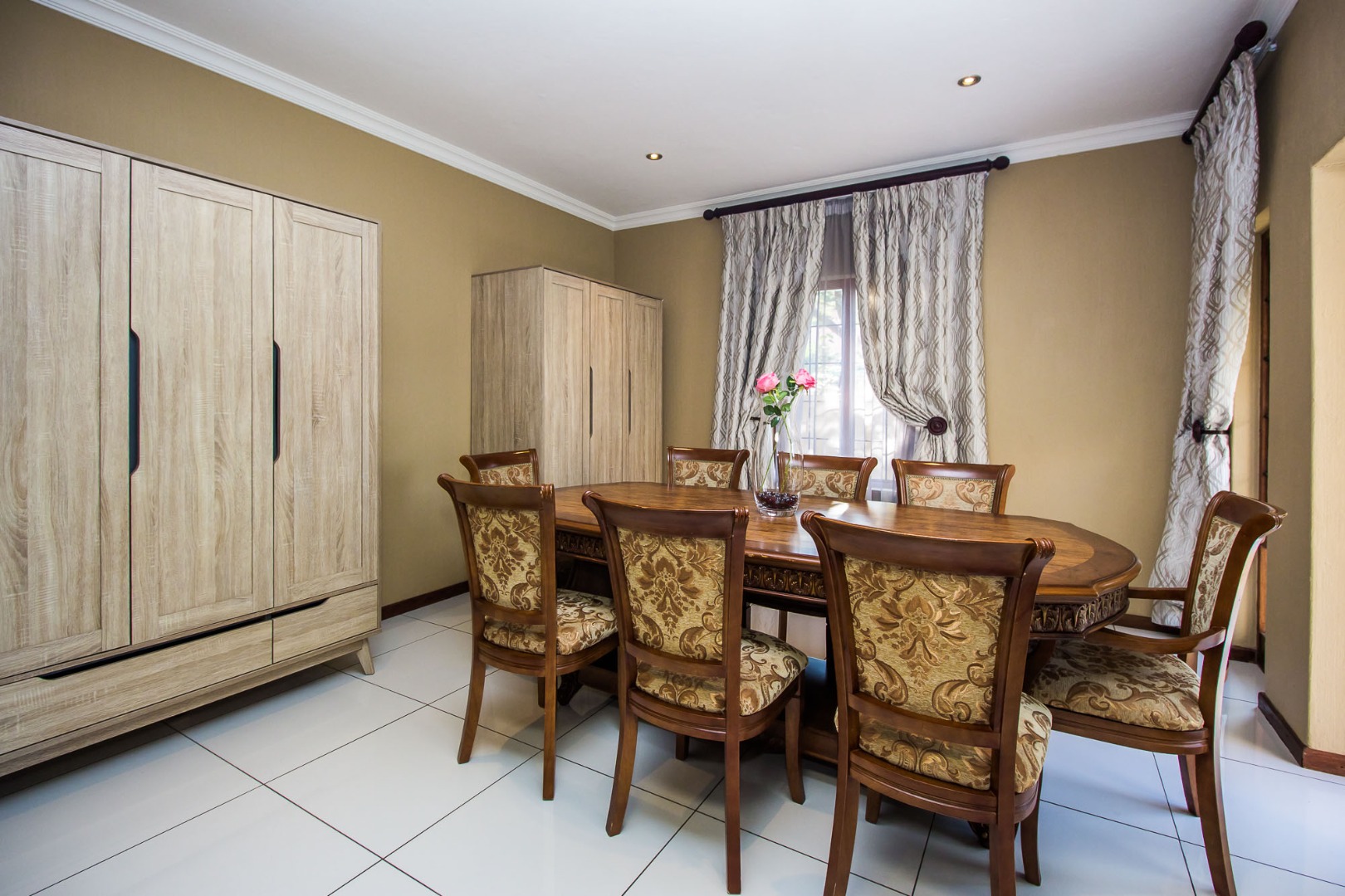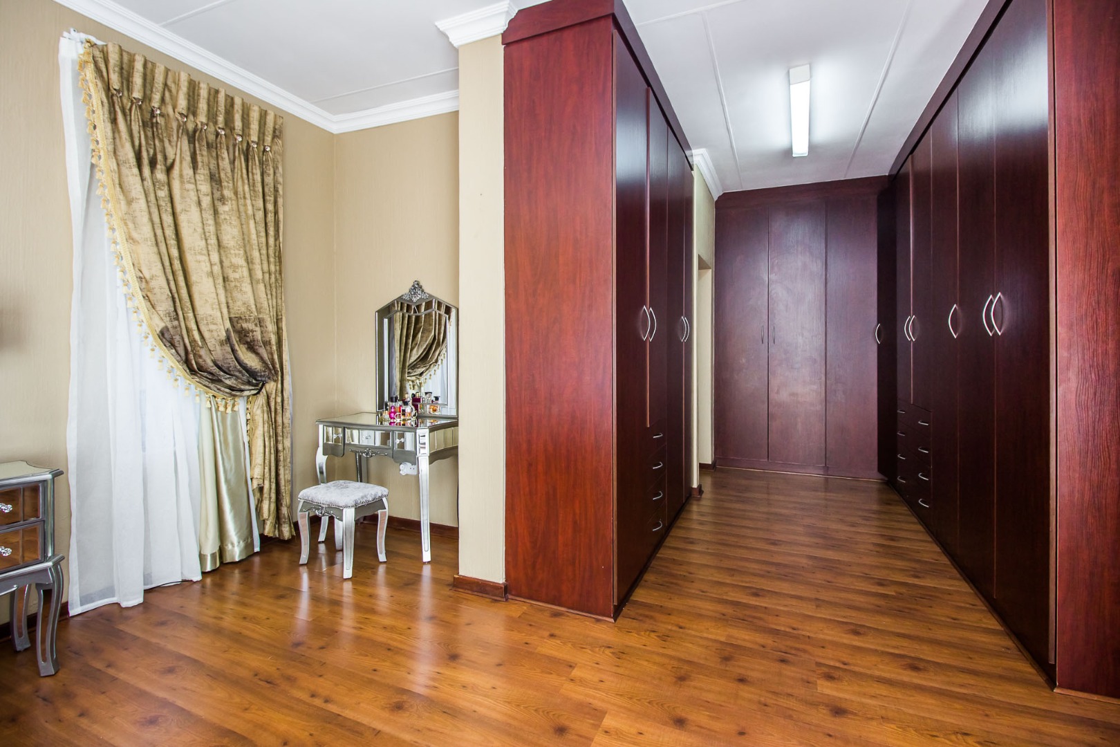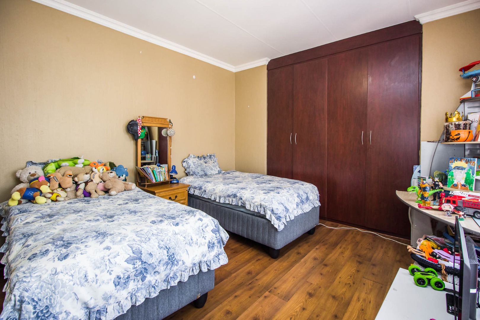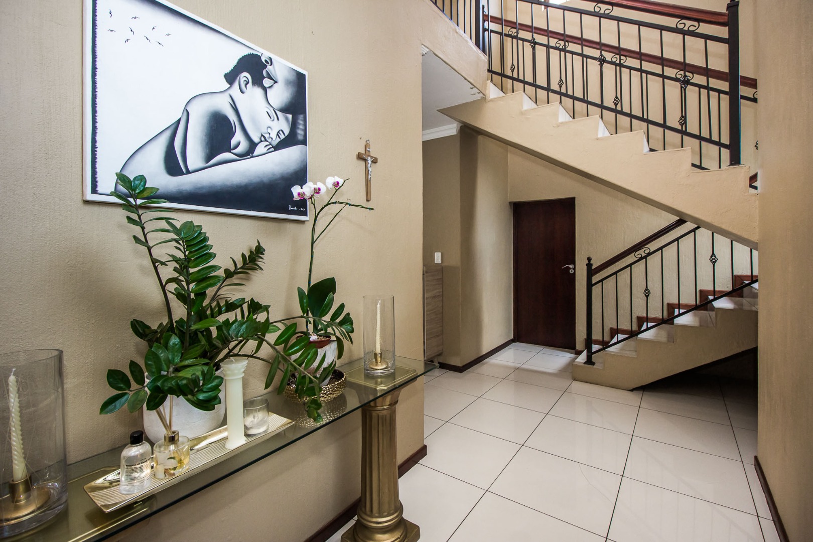 Upstairs offers an easy-living private wing for the family. The pajama lounge opens onto a balcony, giving you a relaxed second living space perfect for a TV room, reading area or kids’ lounge. Two well-sized bedrooms with built-in cupboards and laminated flooring share a full bathroom, making it ideal for children or guests. The main bedroom is a standout feature — spacious, bright and designed for comfort, complete with a walk-in wardrobe, a full en-suite bathroom, and its own private balcony. Curtains remain throughout the home, making move-in simple. With multiple balconies, generous living zones, secure estate living and a practical layout that suits modern family life, this home delivers a well-rounded rental option in the heart of Olympus AH.