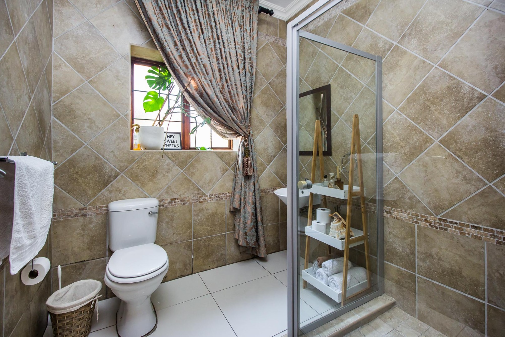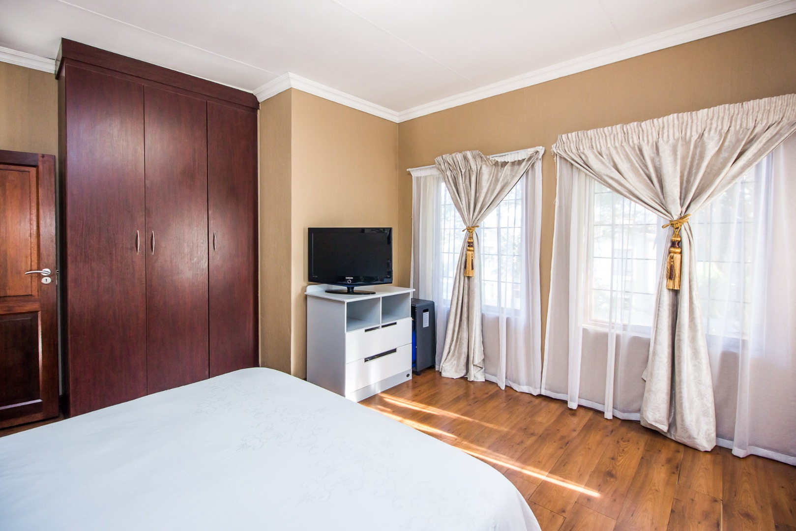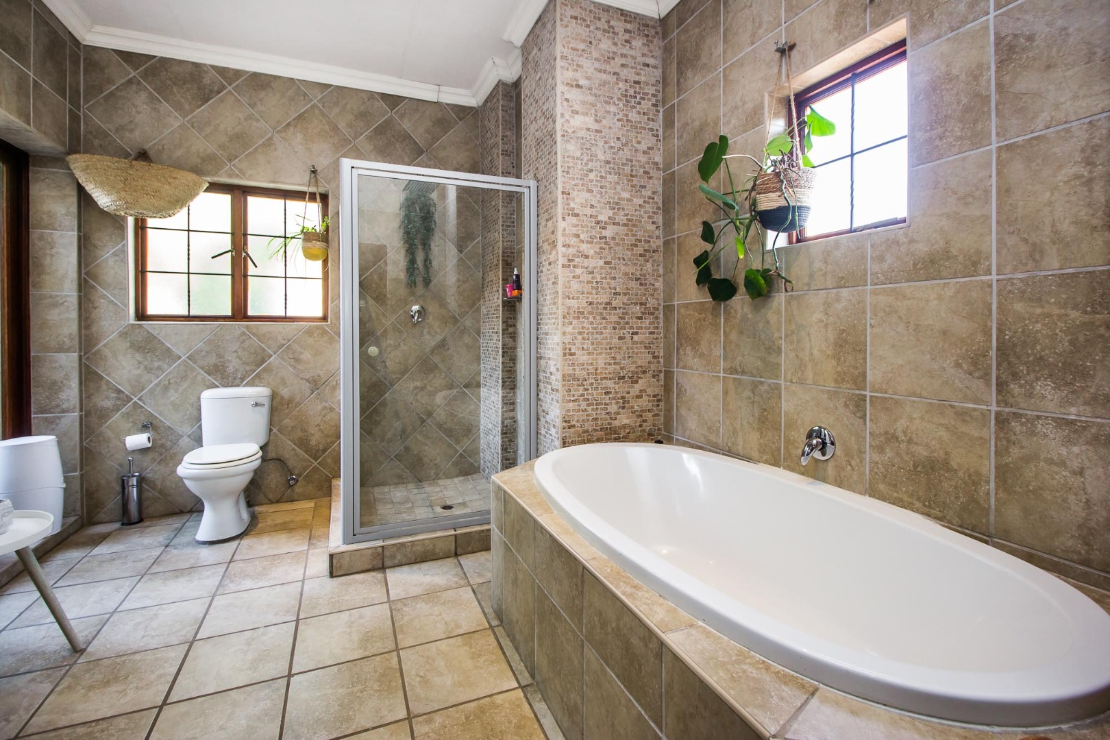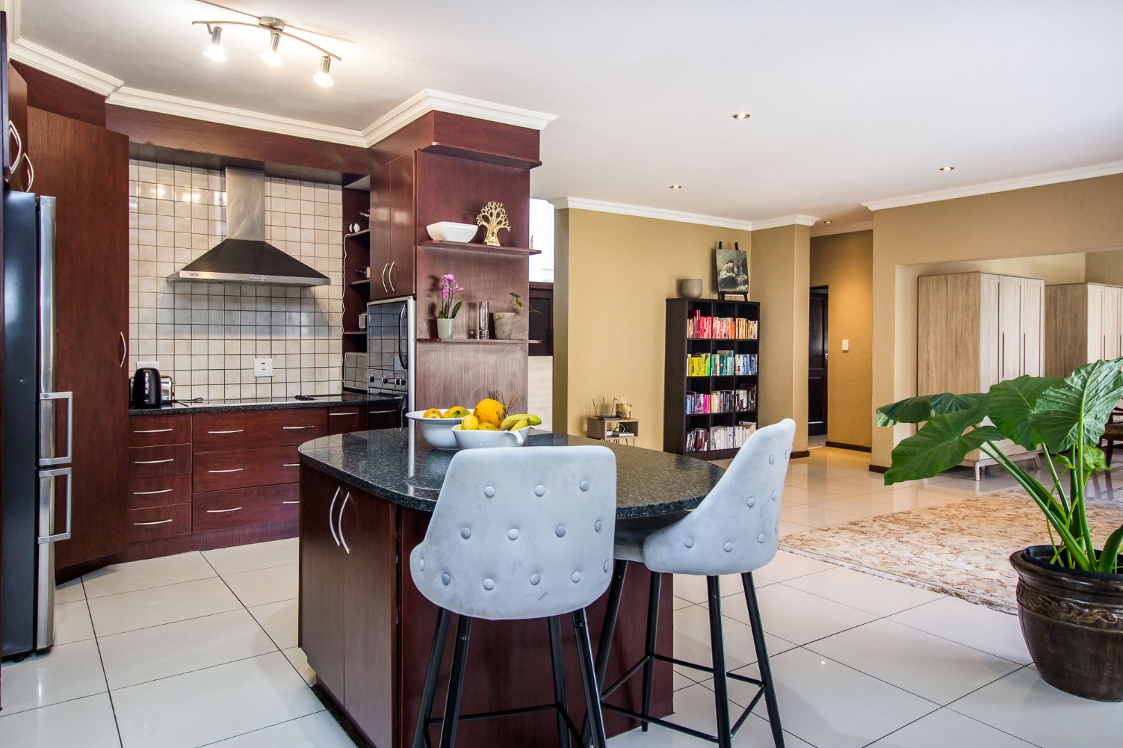 Upstairs offers an easy-living private wing for the family. The pajama lounge opens onto a balcony, giving you a relaxed second living space perfect for a TV room, reading area or kids’ lounge. Two well-sized bedrooms with built-in cupboards and laminated flooring share a full bathroom, making it ideal for children or guests. The main bedroom is a standout feature — spacious, bright and designed for comfort, complete with a walk-in wardrobe, a full en-suite bathroom, and its own private balcony. Curtains remain throughout the home, making move-in simple. With multiple balconies, generous living zones, secure estate living and a practical layout that suits modern family life, this home delivers a well-rounded rental option in the heart of Olympus AH.