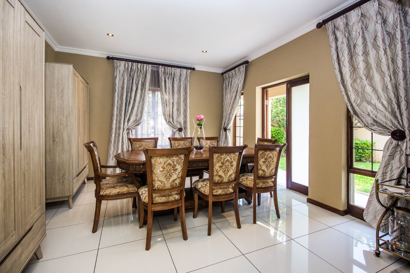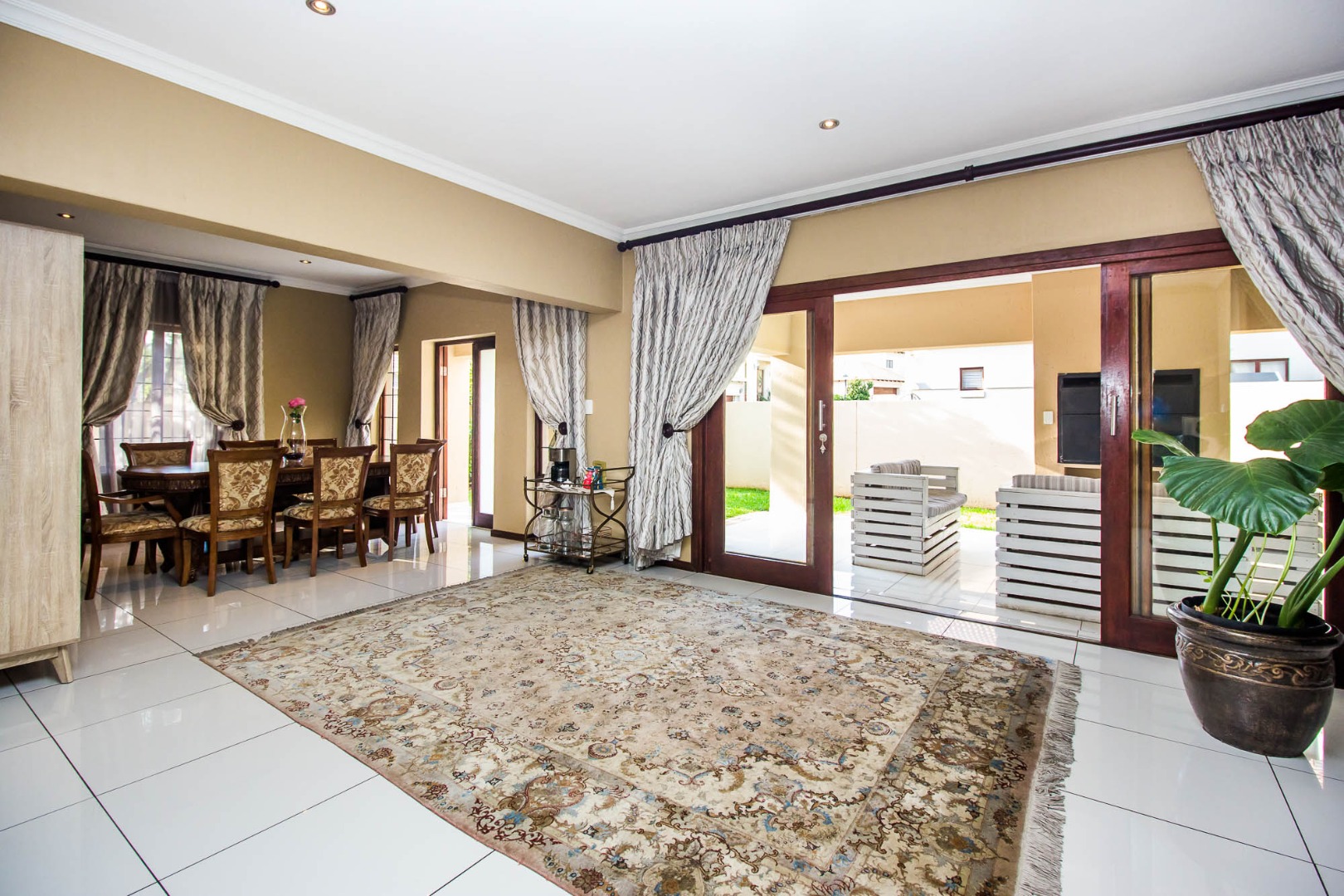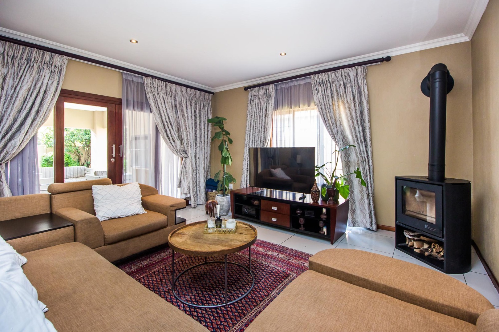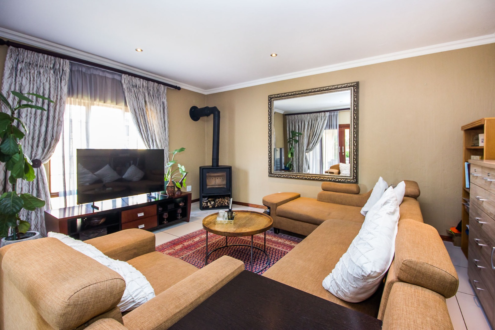 This home is positioned inside one of the most popular and secure estates in Olympus AH, offering a generous family layout with real comfort and practicality from the moment you step inside. The entrance hall opens into three expansive living areas — a dining room, a lounge, and a TV room with a fireplace — all flowing directly into the open-plan kitchen and scullery. The kitchen includes a double oven, electric stove and extractor fan, giving you a functional and well-equipped cooking space ideal for daily use or entertaining. The downstairs layout also features a private guest bedroom with built-in cupboards and a full guest bathroom with a shower, providing great accommodation for visitors or extended family. The patio with its built-in braai leads straight out to the garden, creating a smooth indoor-outdoor entertainment area. Practical extras such as staff quarters with a shower, an outside toilet, and the double garage all add to the convenience. Water and sewage are billed directly to the tenant, keeping everything transparent and straightforward.