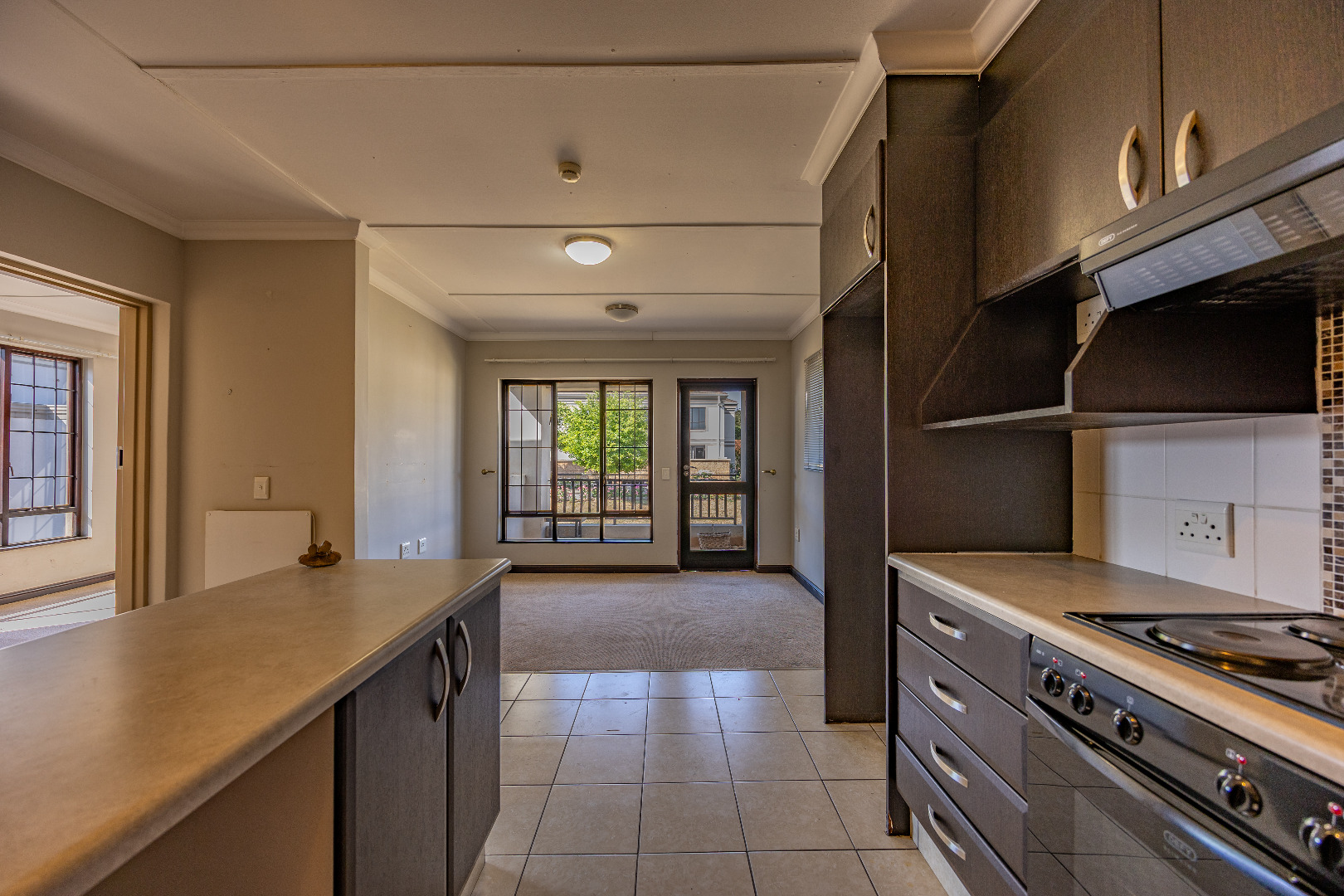 The home features an open-plan layout that connects the modern kitchen, dining, and living areas seamlessly. The kitchen includes dark wood-look cabinetry, light countertops, a built-in oven, hob, and extractor fan, enhanced by a stylish mosaic backsplash. Large windows and glass doors fill the living space with natural light and open onto a private balcony or patio — perfect for relaxation or fresh air. The bedroom offers ample built-in cupboards, and the full bathroom includes both a shower and a bathtub for added comfort.
