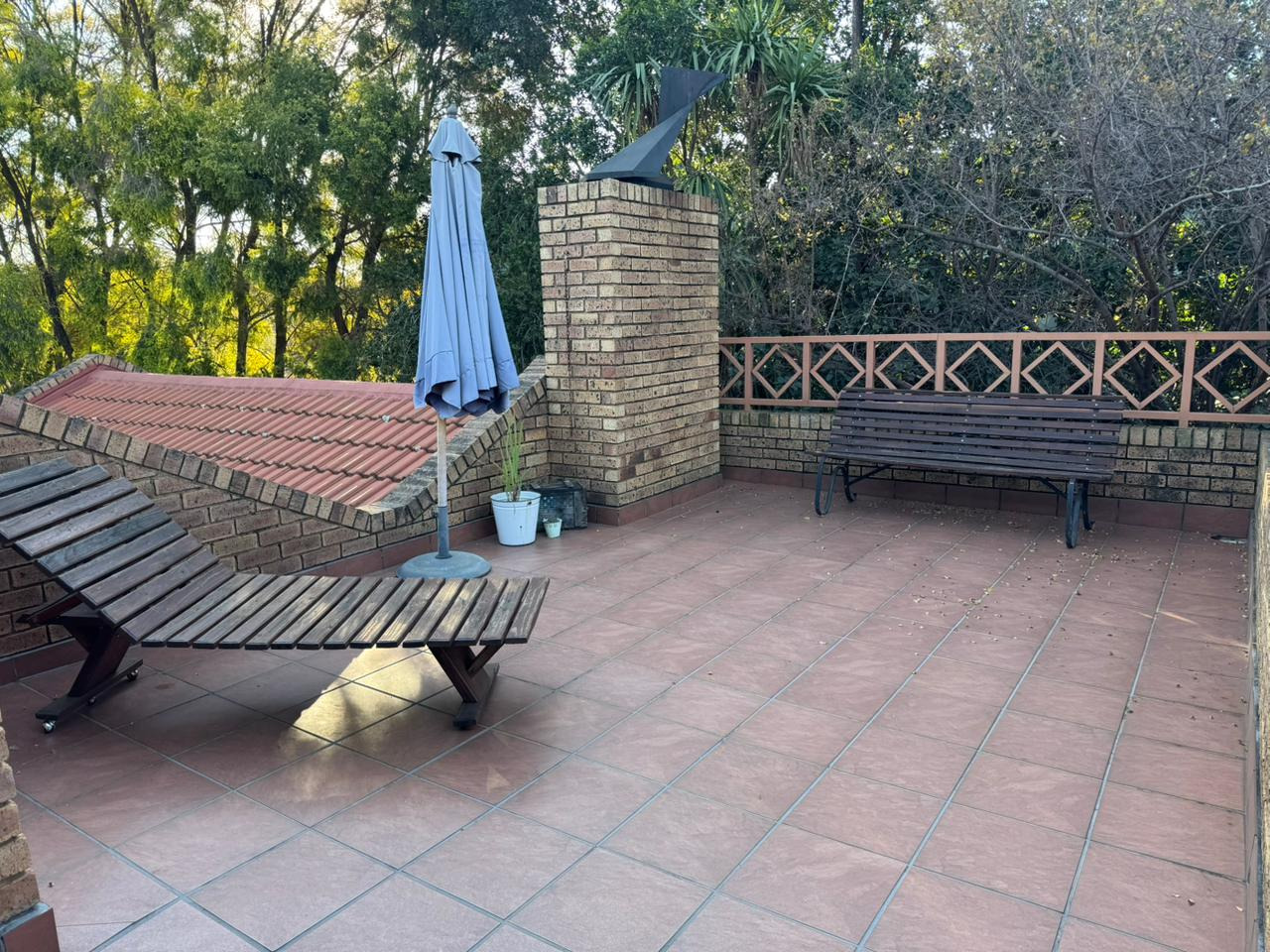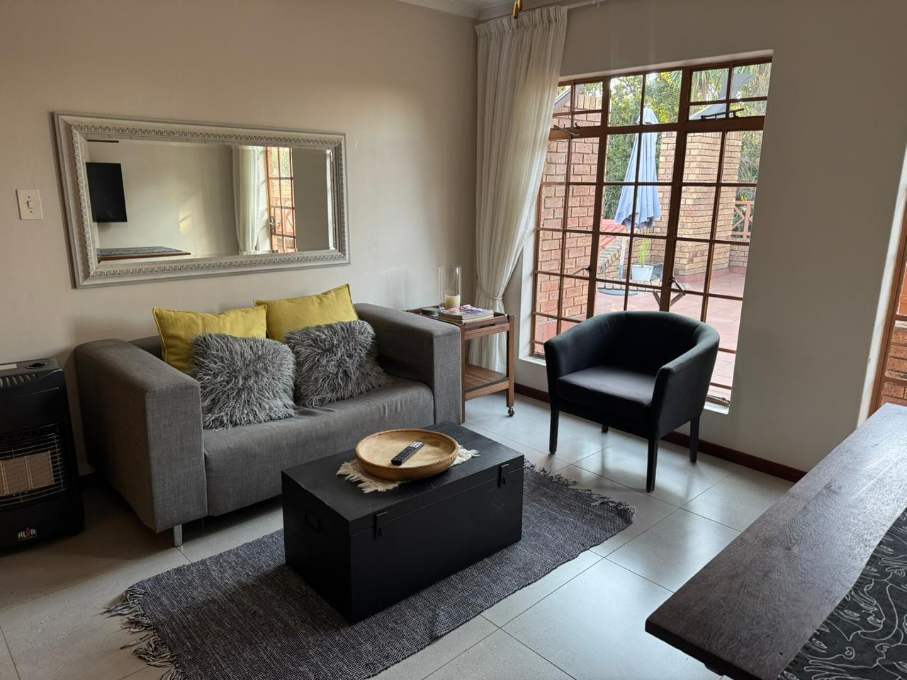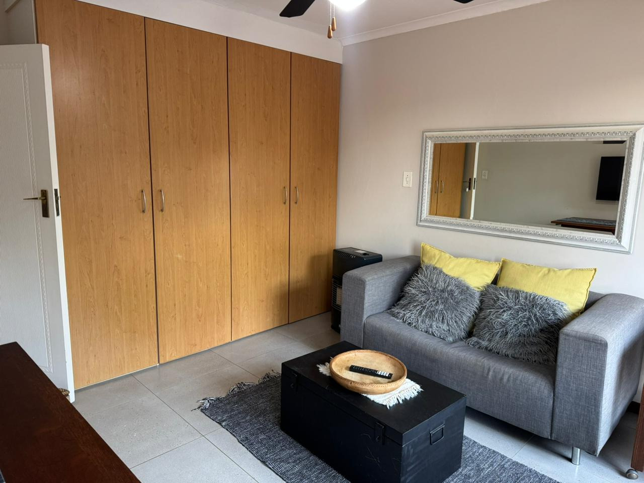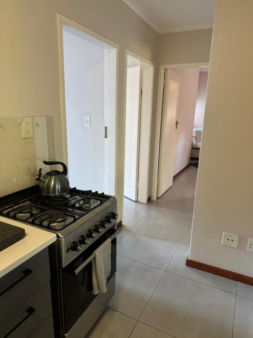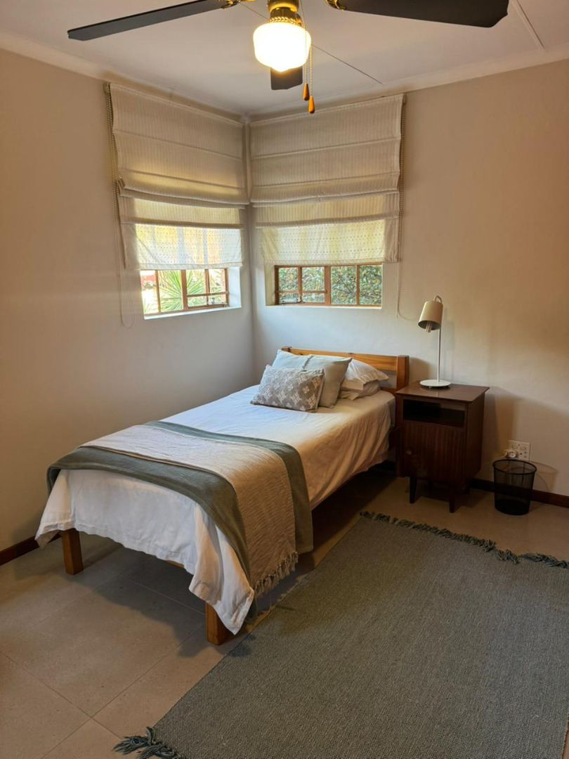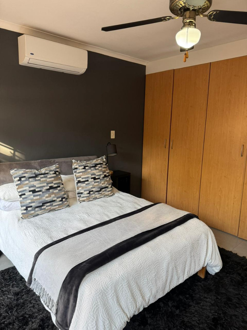 Both bedrooms are equipped with built-in cupboards, while the second bedroom includes a ceiling fan and air-conditioning and also opens onto the patio. A full bathroom is located in the passage and includes a shower, bath, basin, and toilet. Additional perks include included WiFi and domestic service. Electricity is prepaid and billed separately.