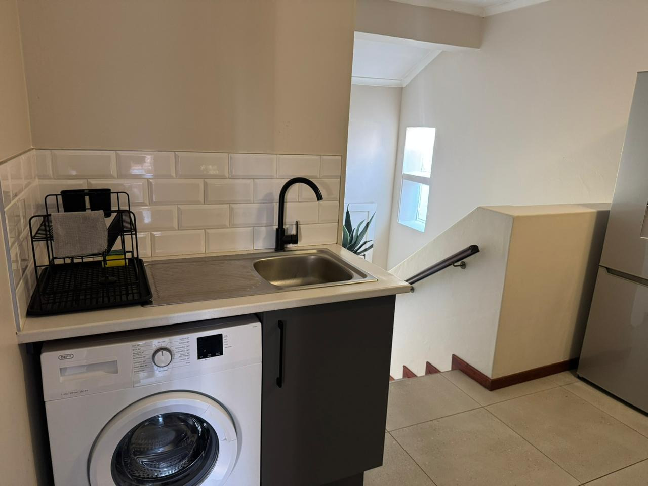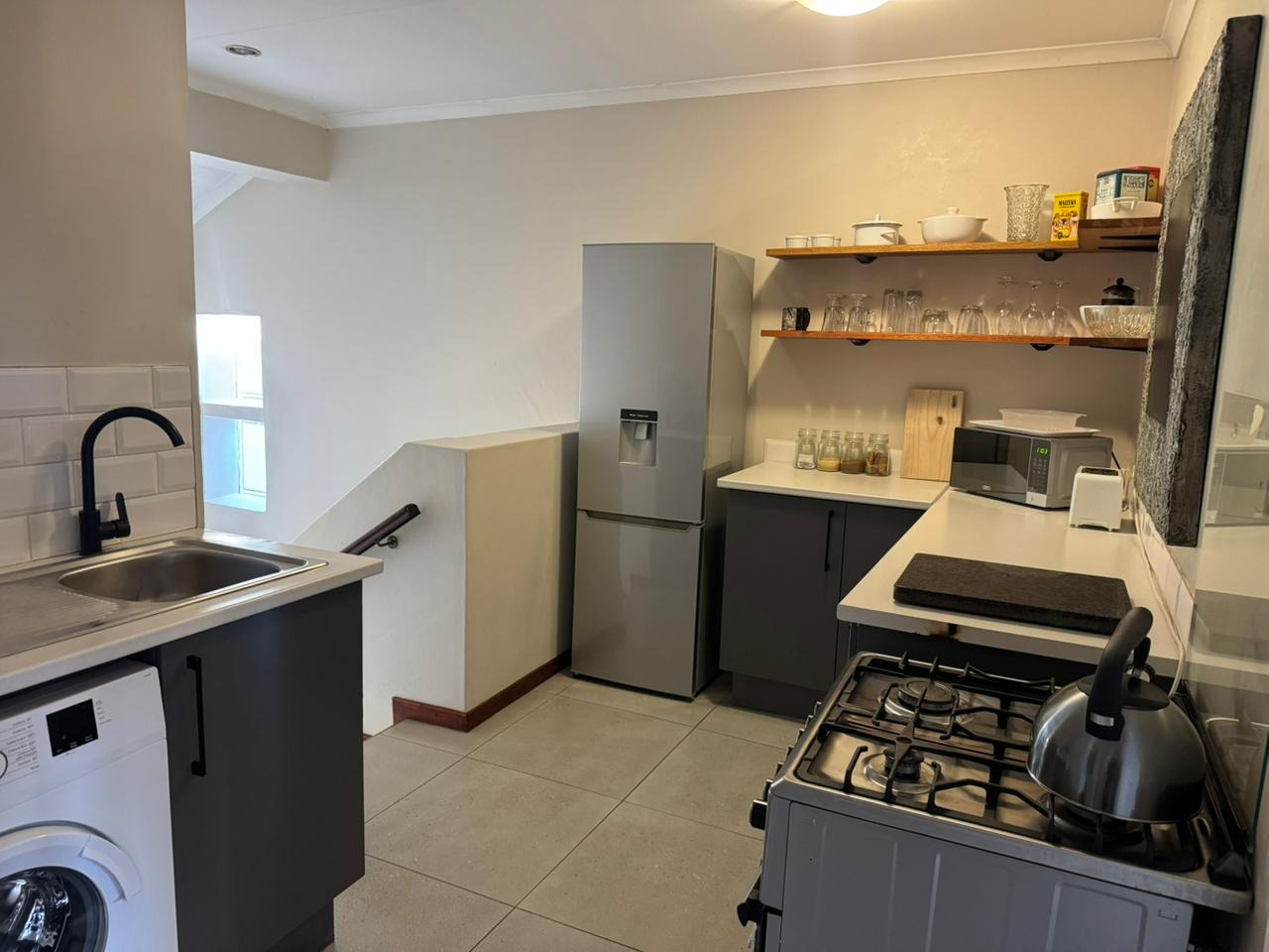 The home features a modern kitchen fitted with a gas stove, fridge, washing machine, and basin—perfect for easy everyday living. The open-plan TV room includes built-in cupboards and flows effortlessly onto a covered patio, creating a seamless indoor-outdoor lifestyle.