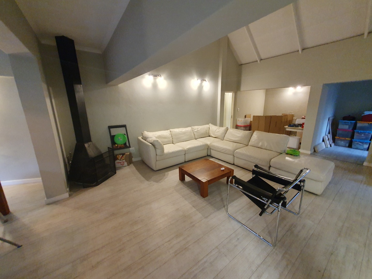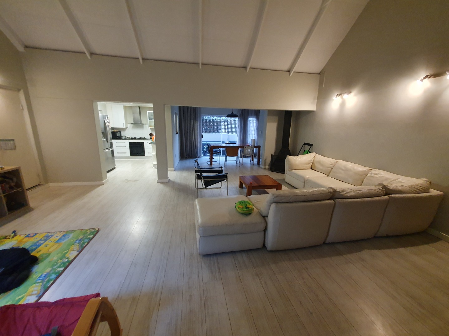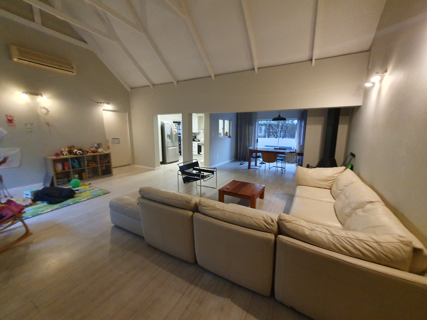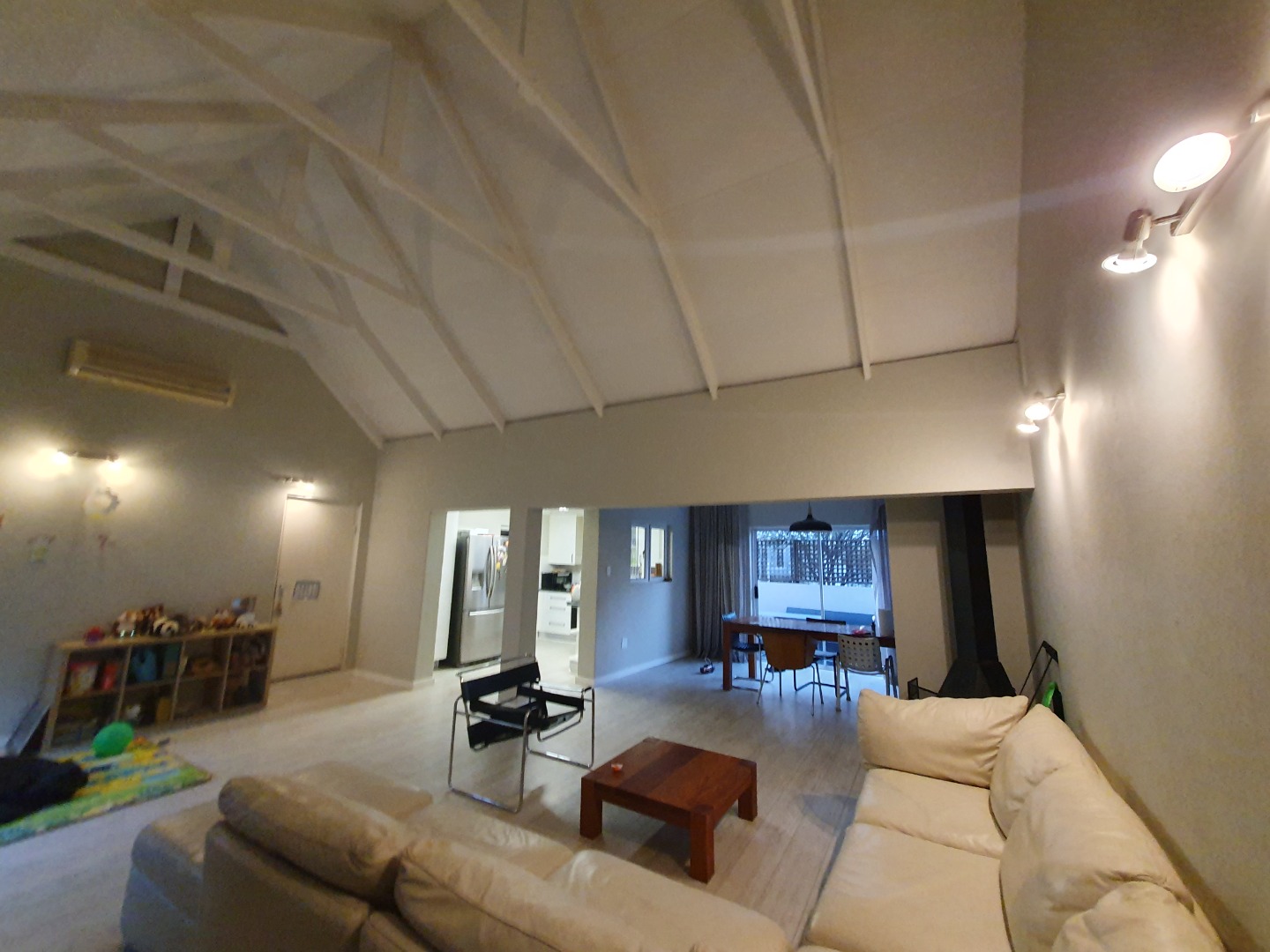 Step into a spacious, open-plan living and dining area with double-volume ceilings that enhance the feeling of space and light. A fireplace adds a cozy touch for winter evenings, while the layout flows seamlessly into a well-appointed kitchen complete with a separate scullery for added convenience.