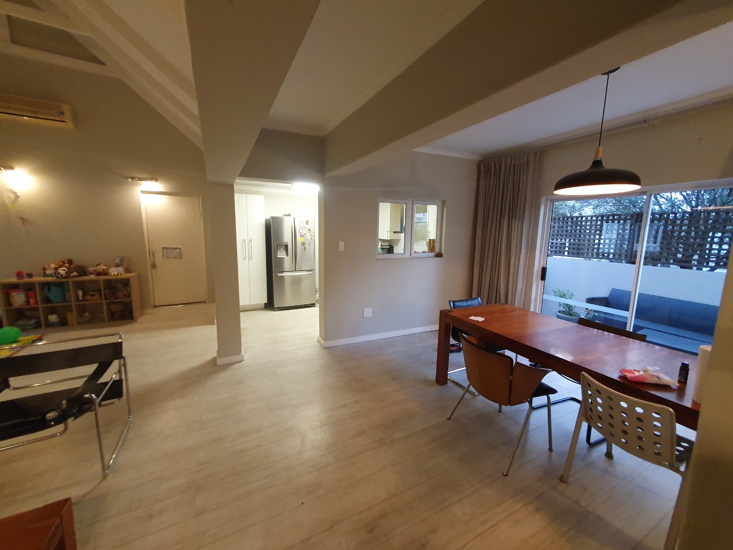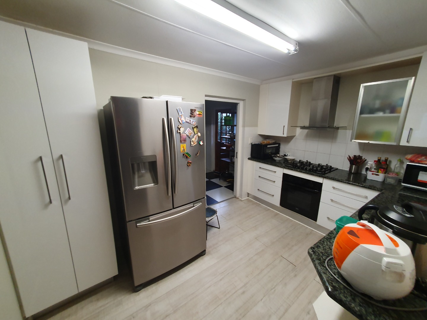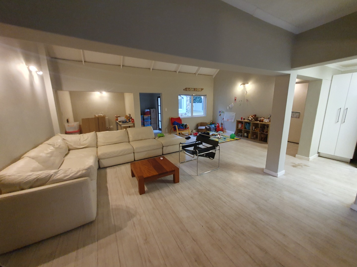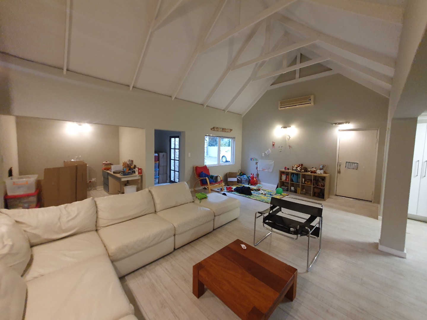 Step into a spacious, open-plan living and dining area with double-volume ceilings that enhance the feeling of space and light. A fireplace adds a cozy touch for winter evenings, while the layout flows seamlessly into a well-appointed kitchen complete with a separate scullery for added convenience.