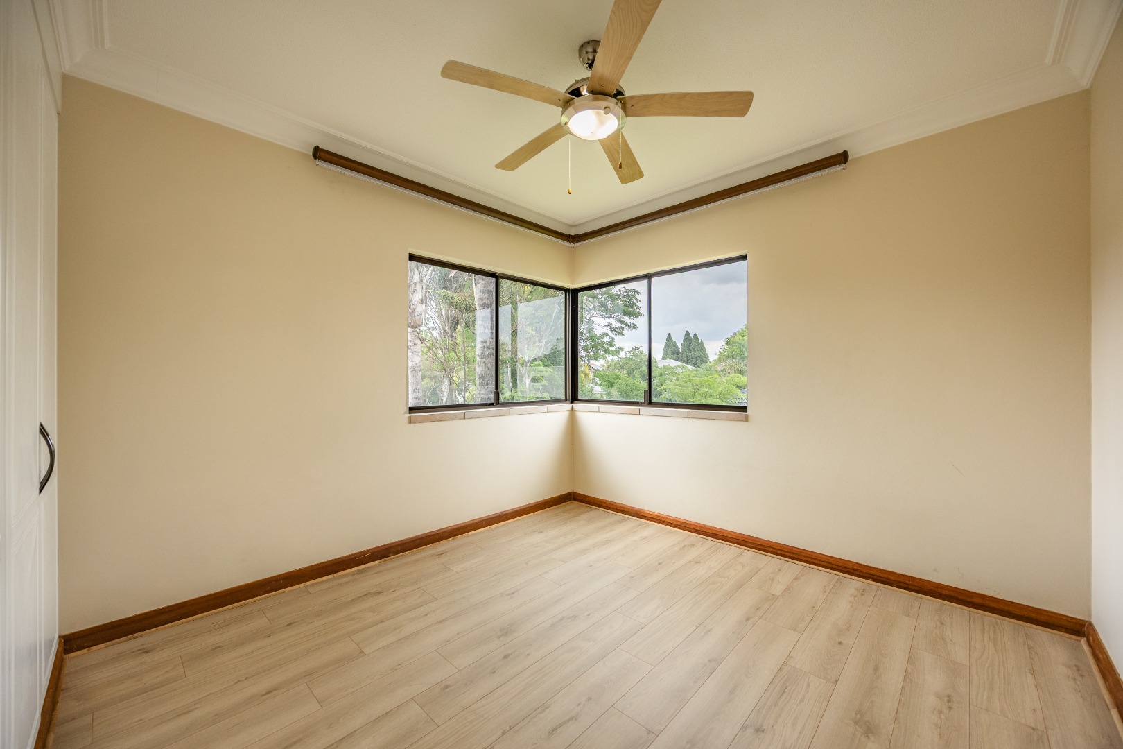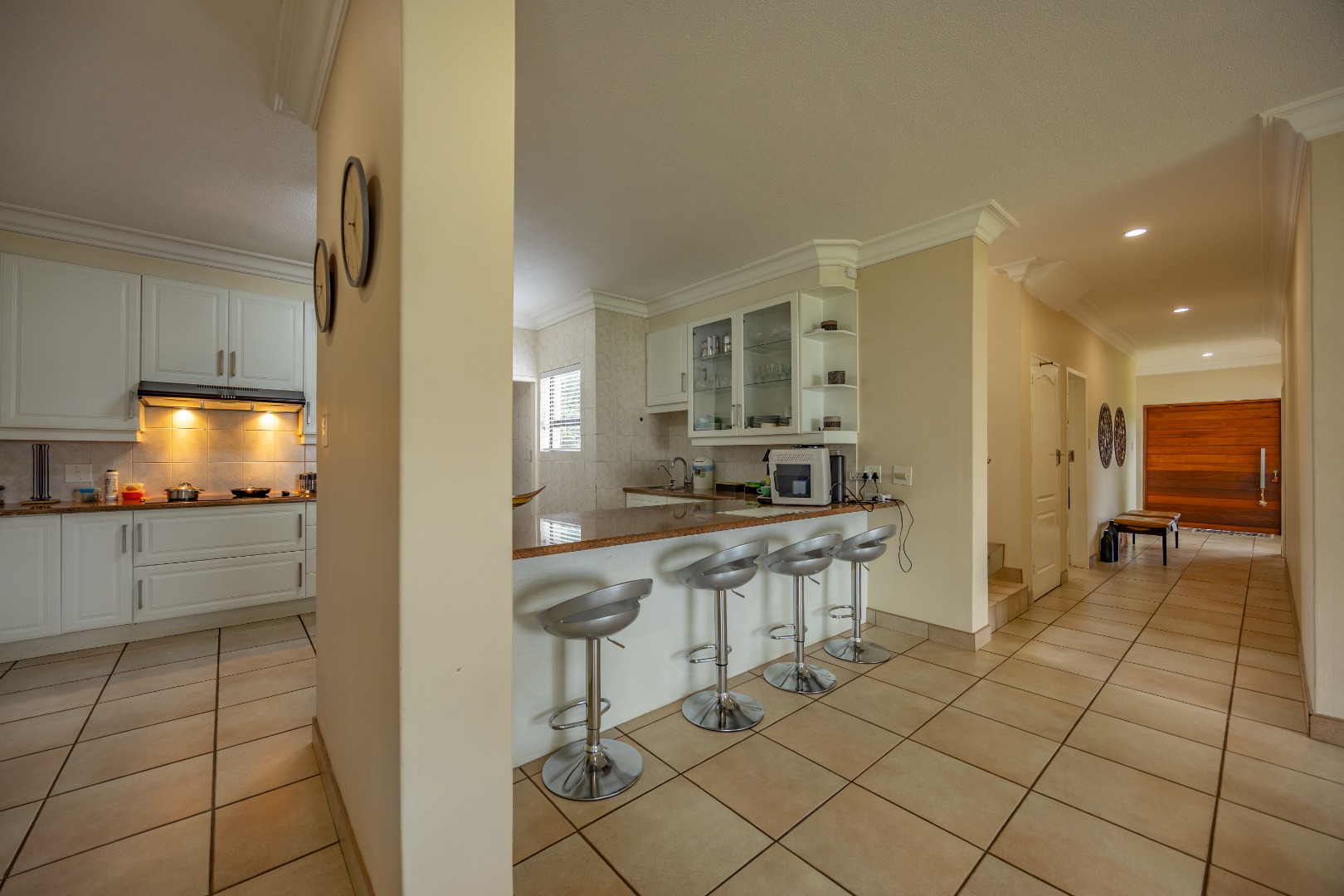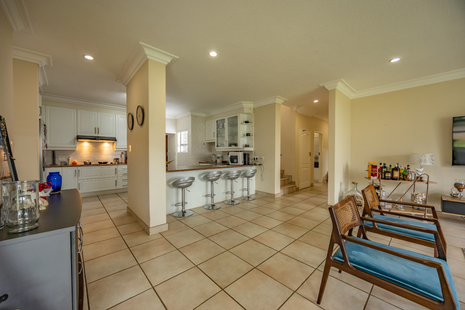 The ground floor features two well-sized bedrooms, including a main bedroom with a private en-suite bathroom and built-in cupboards. A guest bathroom, open-plan lounge and kitchen, separate scullery, and a cosy dining area create a warm and inviting flow. Stack doors open onto the covered patio overlooking the swimming pool—perfect for entertaining throughout the year.