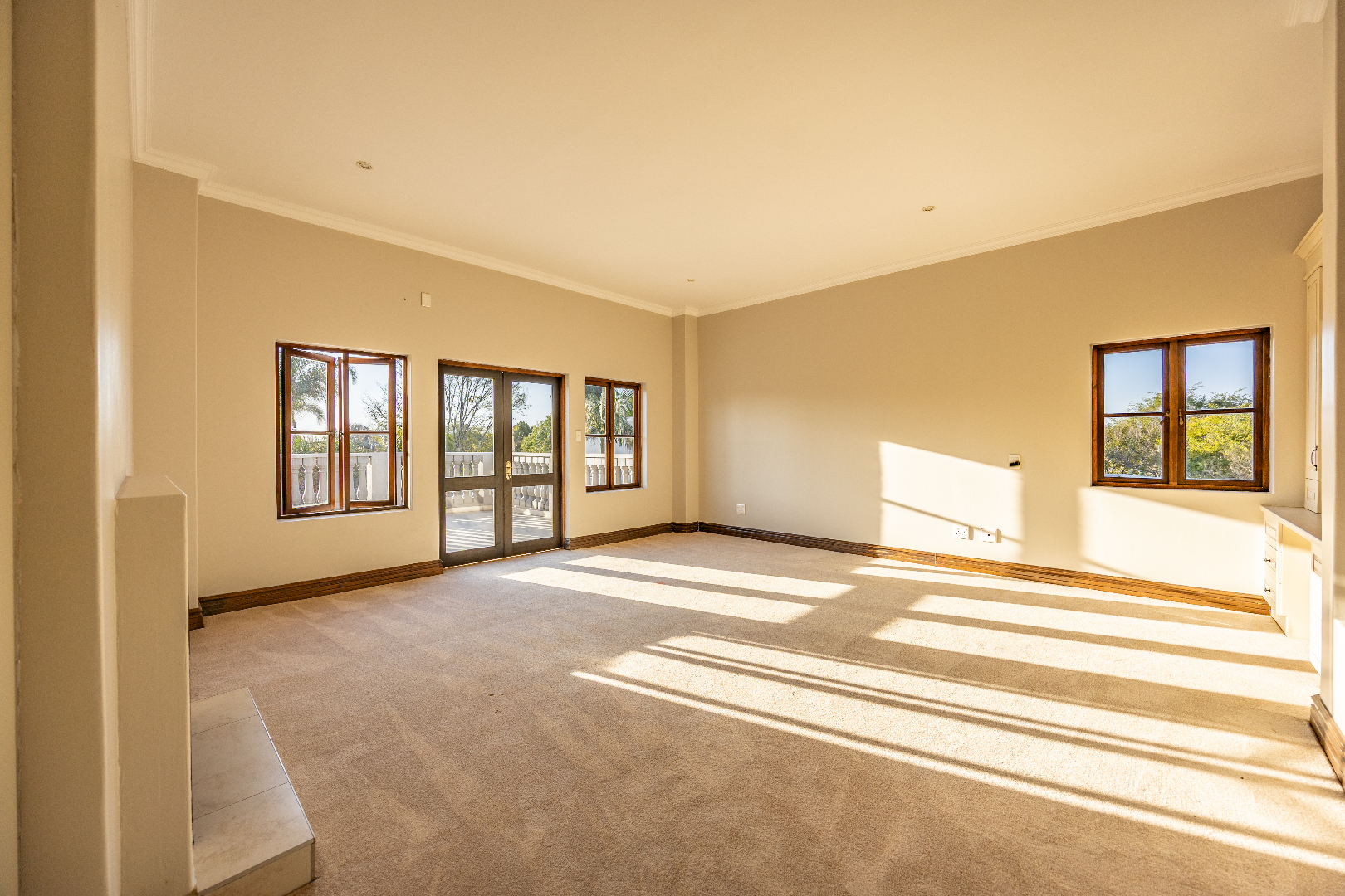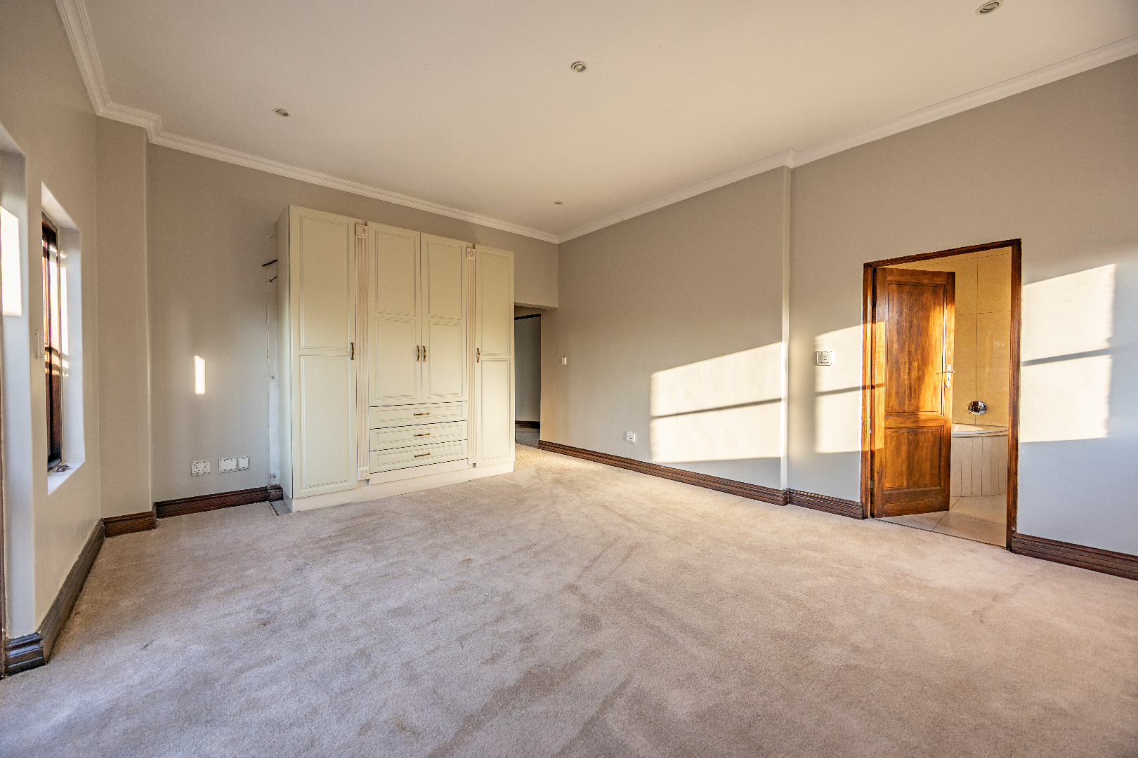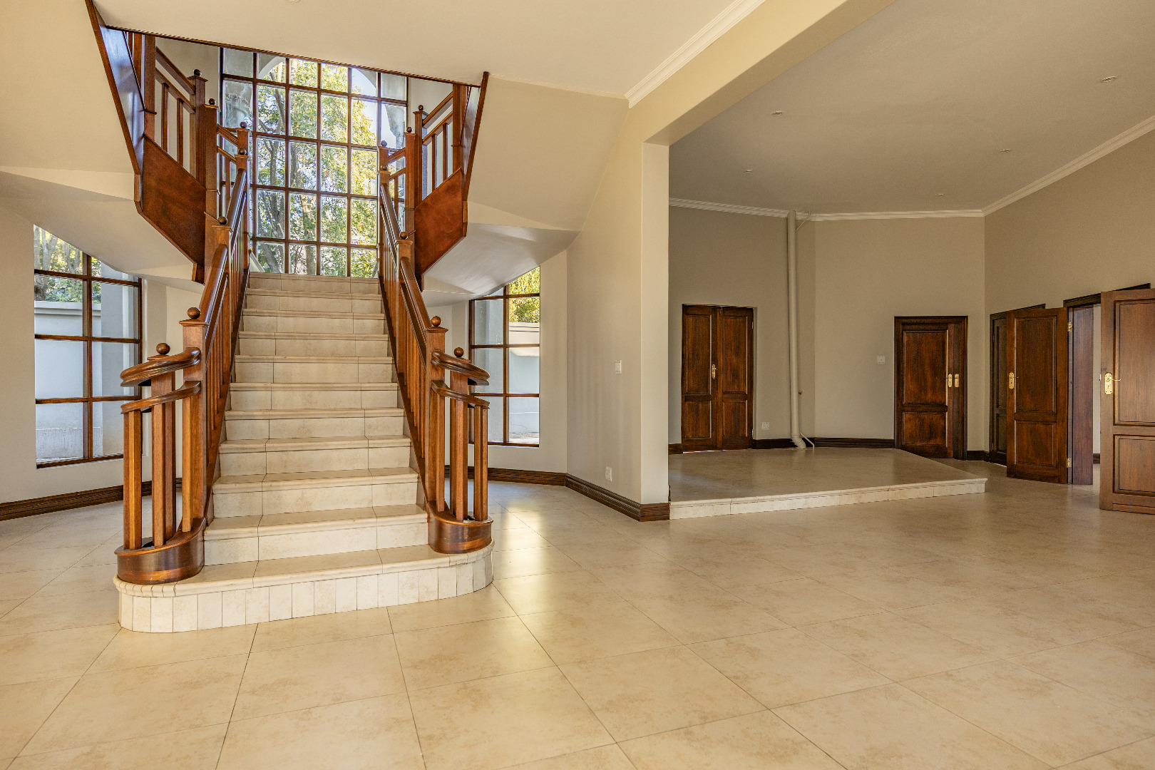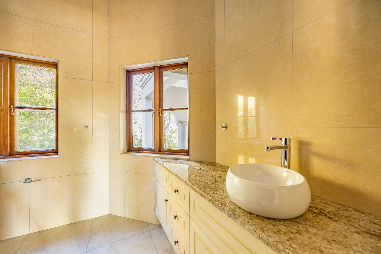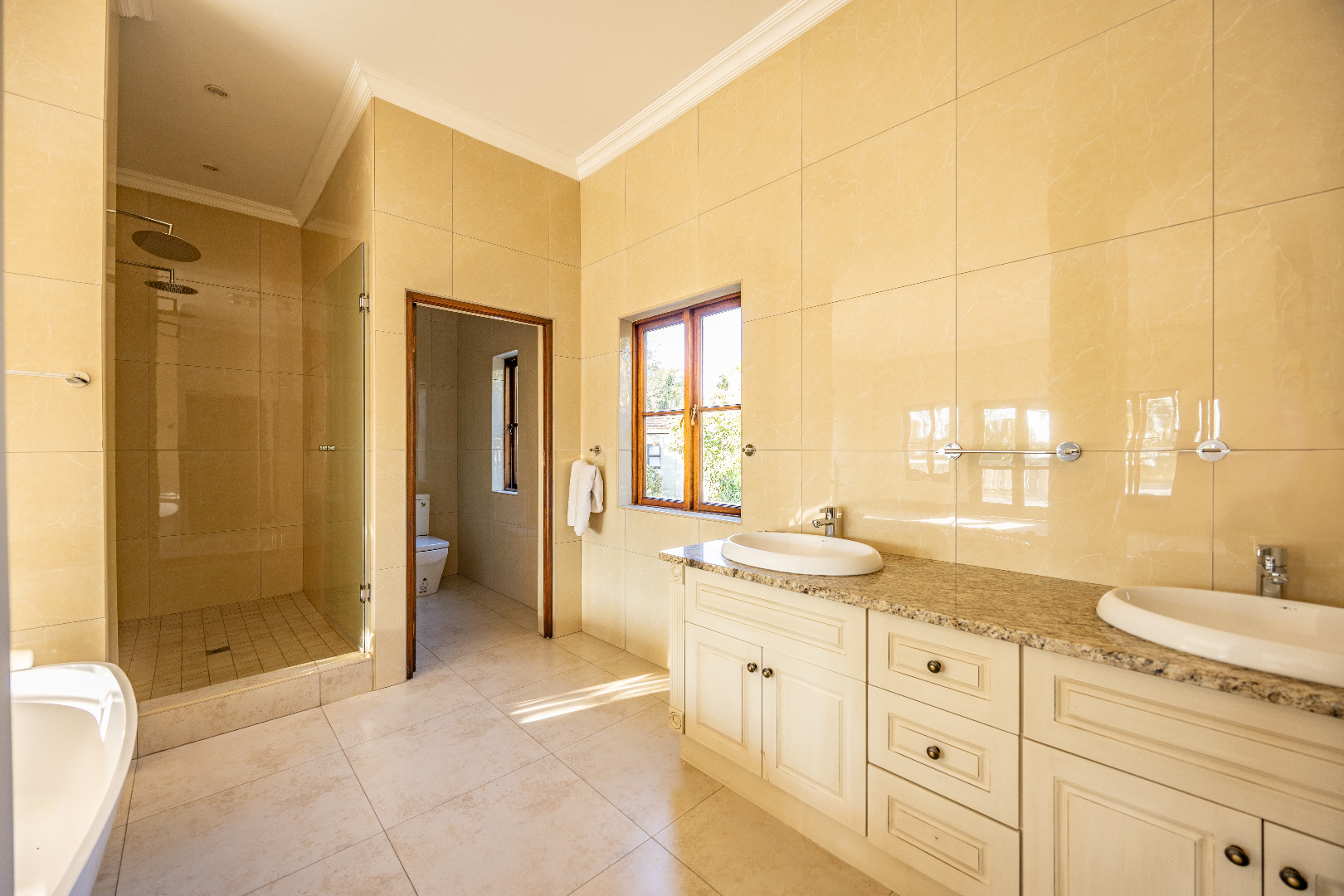 This expansive and elegant home in the prestigious Silver Lakes Golf Estate is available for immediate occupation and offers an exceptional lifestyle for the discerning tenant. The entrance hall leads into a versatile space ideal as a study or guest bedroom, flowing into a spacious dining area perfect for family meals. The ground floor also features a guest bathroom with a shower, a wine cellar, and a generous living room with two fireplaces for year-round comfort. A large, well-equipped kitchen with a separate scullery caters effortlessly to all your culinary needs, complemented by an additional downstairs bedroom.