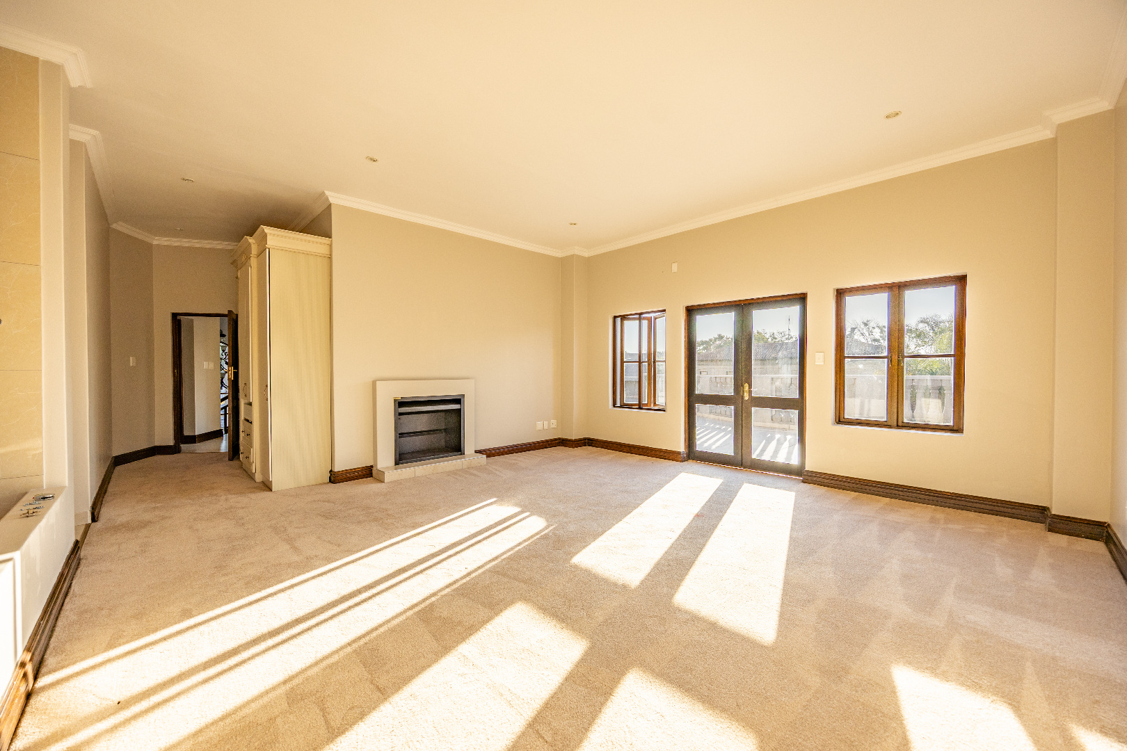 Upstairs, a second lounge with fireplace and kitchenette provides a relaxed living space, leading to four spacious bedrooms. The luxurious main suite includes a walk-in closet, full en-suite bathroom with bath and shower, and its own fireplace. Two more bedrooms have private en-suite bathrooms (one with a shower, one with a bath), while a fourth bedroom features built-in cupboards and a dedicated bathroom with shower. All bedrooms open onto a large balcony with a built-in braai and scenic views—perfect for outdoor entertaining.