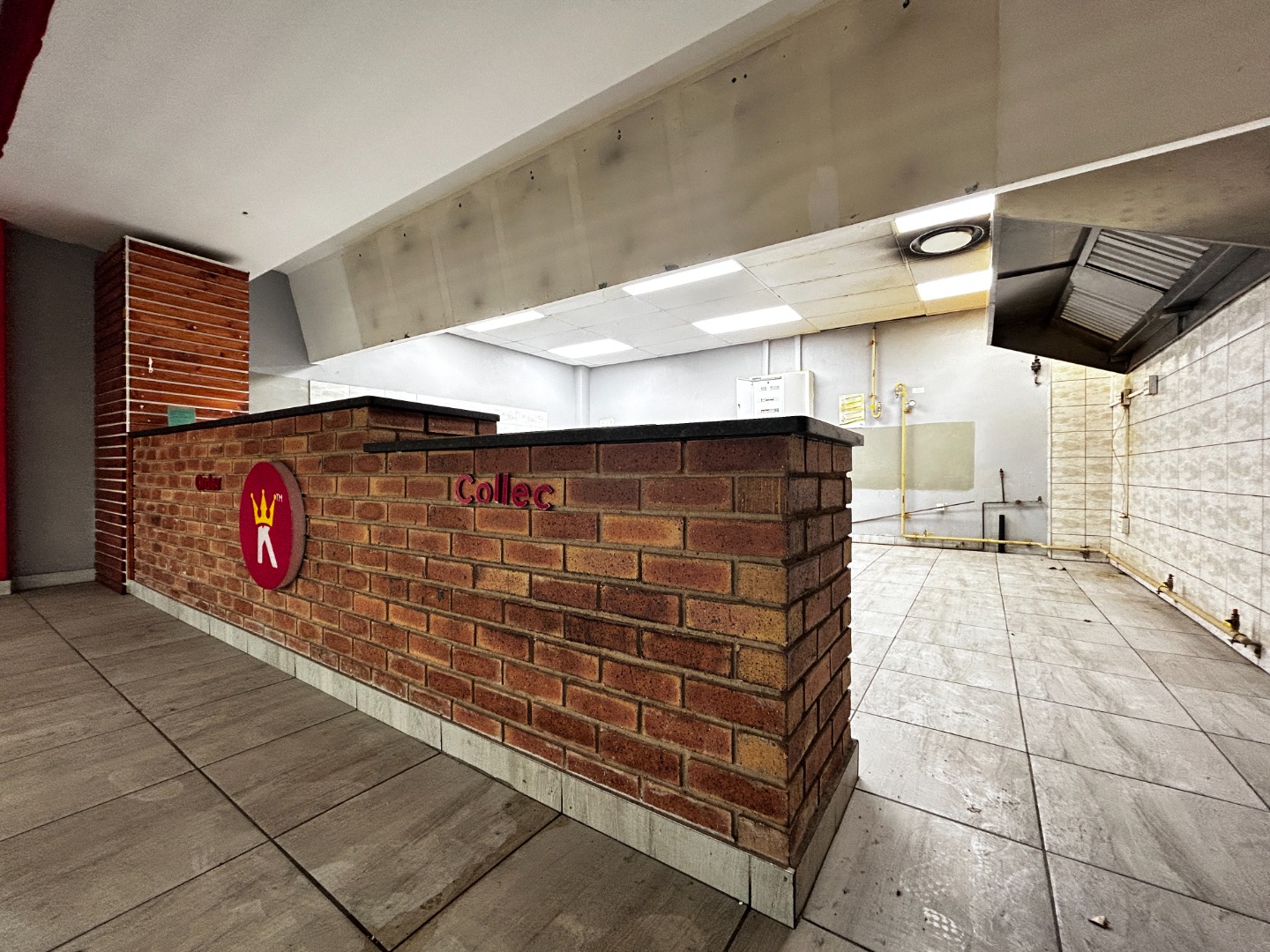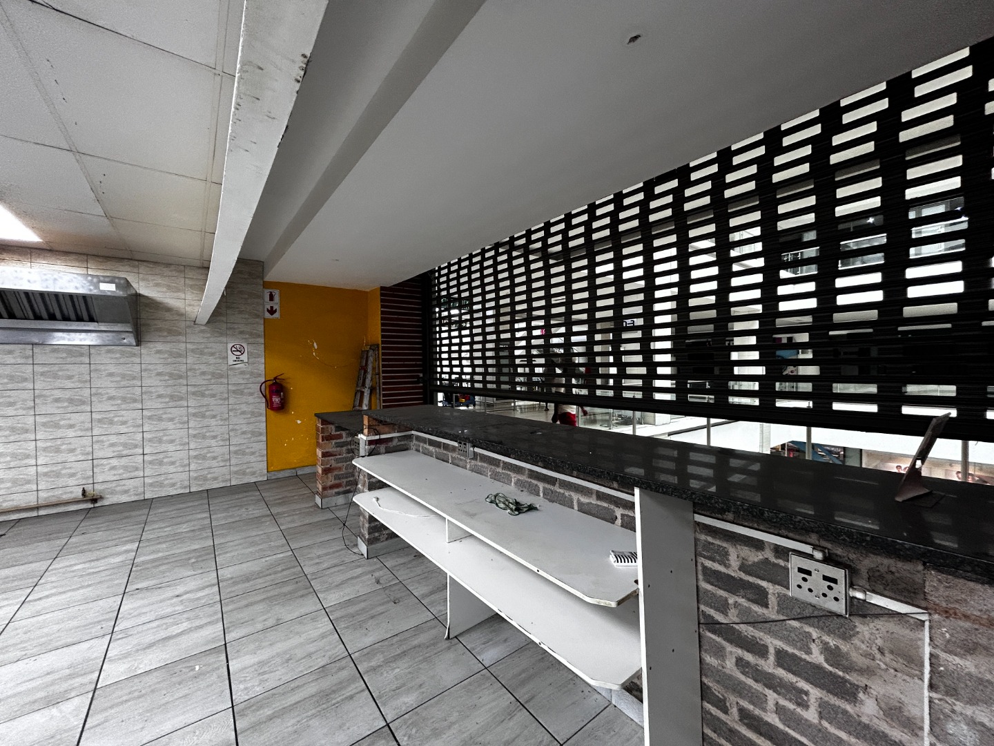 The property features a dedicated commercial kitchen area, complete with a robust range hood, tiled walls, and essential plumbing connections, making it an ideal choice for a takeaway, small restaurant, or catering operation. A sturdy brick service counter and durable tiled flooring extend throughout the space, designed to withstand high foot traffic. The inclusion of a large security roller shutter provides peace of mind and protection for your business assets, while also offering a prominent storefront presence.