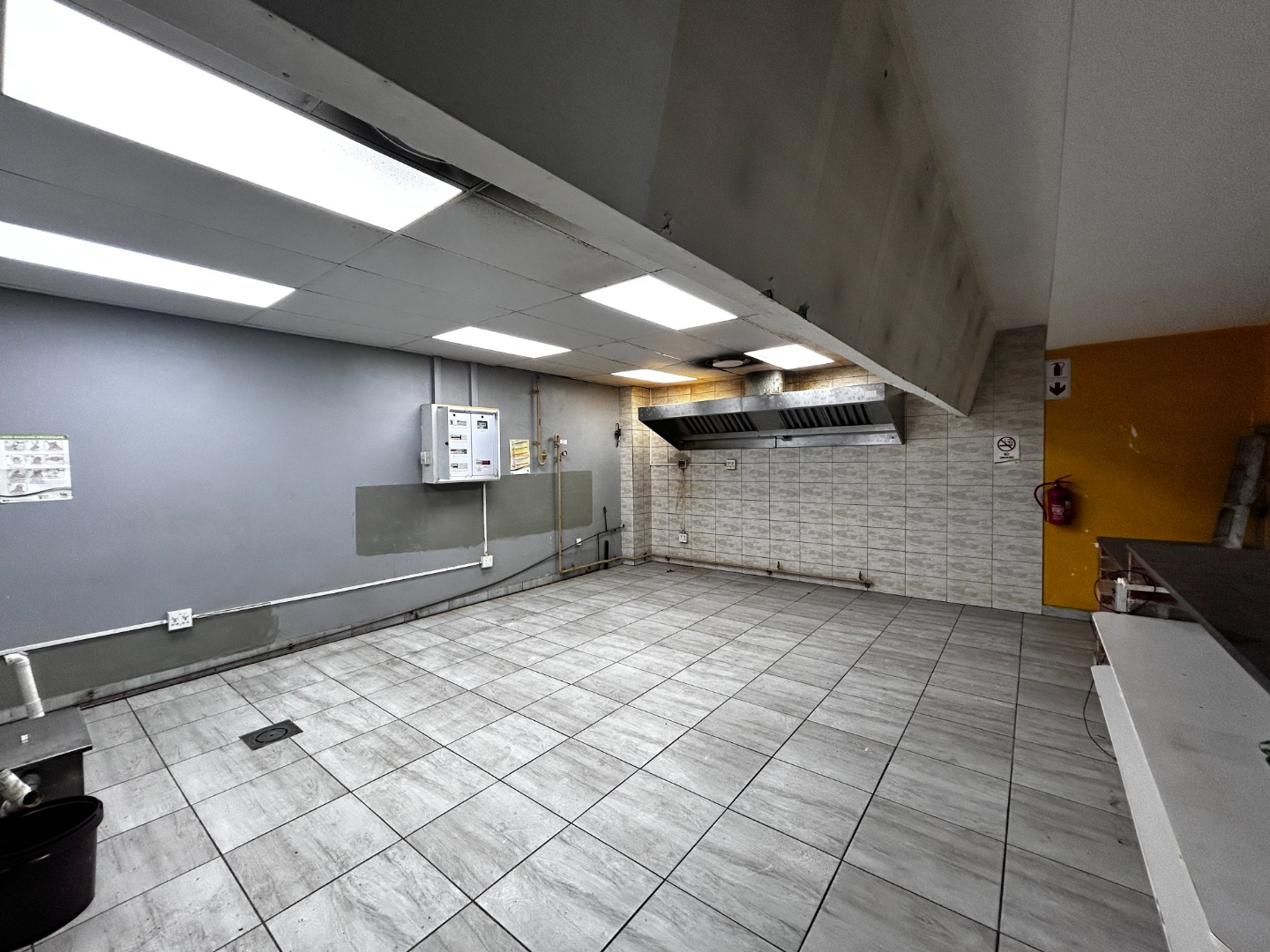 While the unit currently shows signs of wear and tear, including peeling paint and stained ceiling tiles, it offers a blank canvas for customization. A strategic renovation will transform this space into a modern and efficient business environment, tailored to your specific operational needs. The accessible electrical panel and fire extinguisher are practical additions, ensuring basic operational readiness.