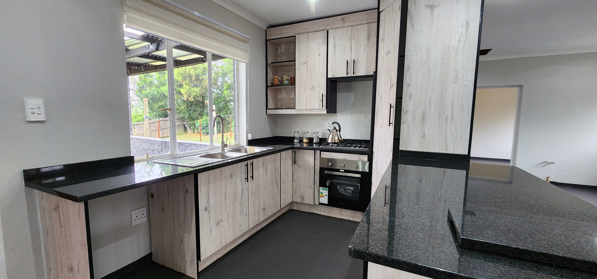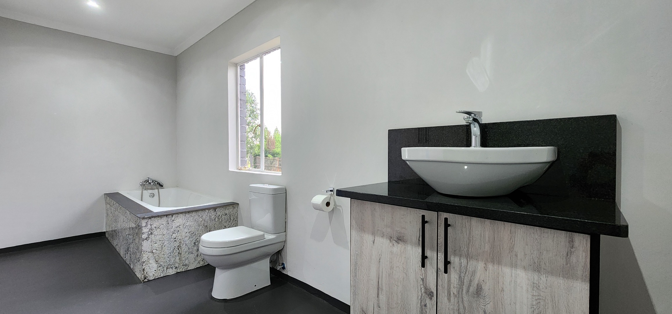 Inside, the open-plan design enhances light and flow throughout. The kitchen is equipped with granite countertops, an electric oven, gas hob, and space for a dishwasher, seamlessly connecting to the bright TV lounge area. The main bedroom offers built-in cupboards and a private en-suite bathroom with a bathtub, basin, and toilet. A linen cupboard doubles as a guest toilet for added convenience. The two additional bedrooms are equal in size, both fitted with cupboards and sharing a modern full bathroom with a bath, shower, basin, and toilet — ideal for family or guests alike.