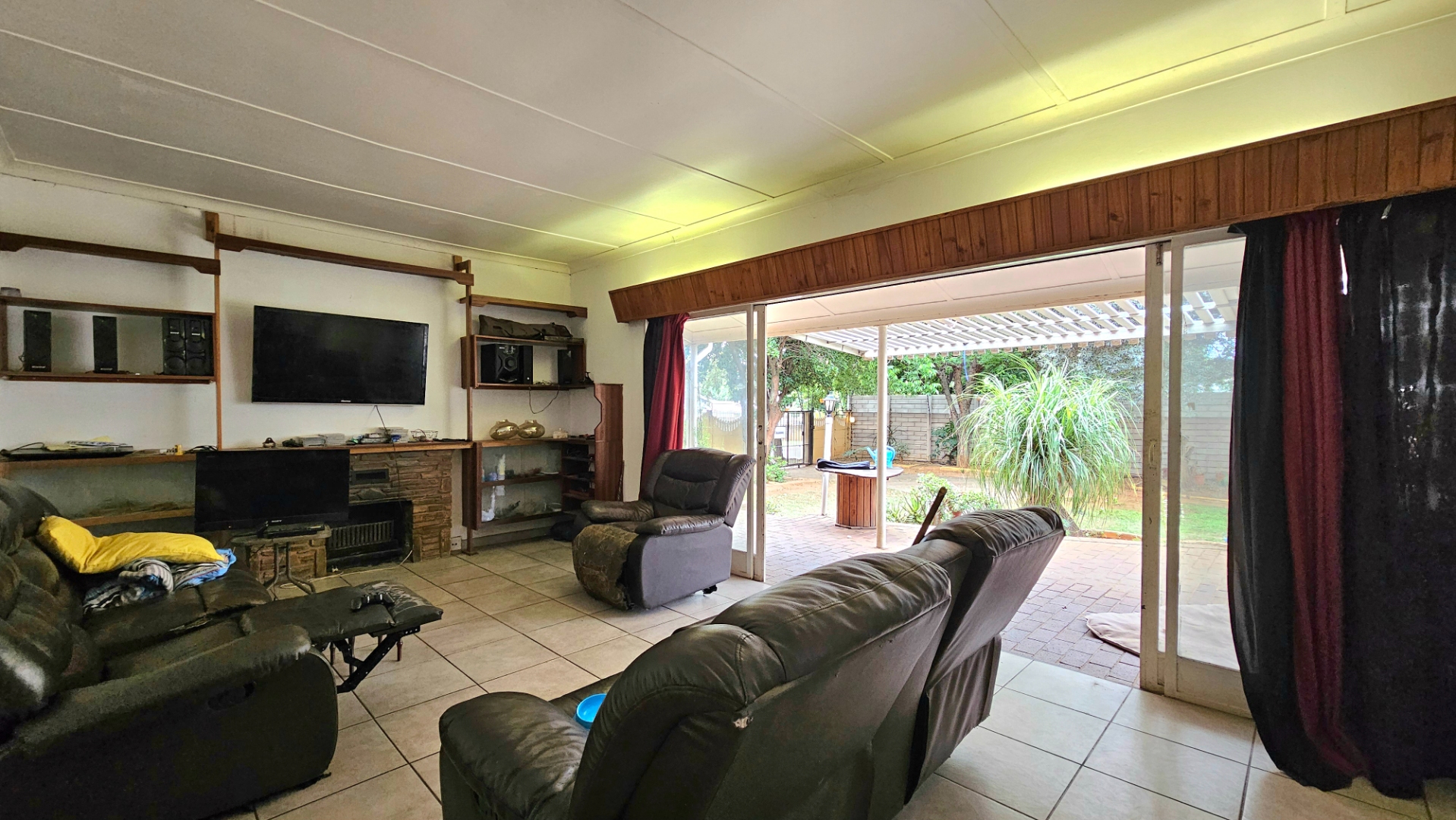 This lovely family home welcomes you with three spacious bedrooms, all fitted with built-in cupboards. The main bedroom is generously sized, easily accommodating a king-size bed with additional furniture. A well-appointed kitchen offers plenty of cupboard space, making meal prep and storage effortless. The open-plan living and dining area feels bright and inviting, thanks to large sliding doors that allow natural light to fill the space. A built-in fireplace adds comfort and warmth during the colder months.
