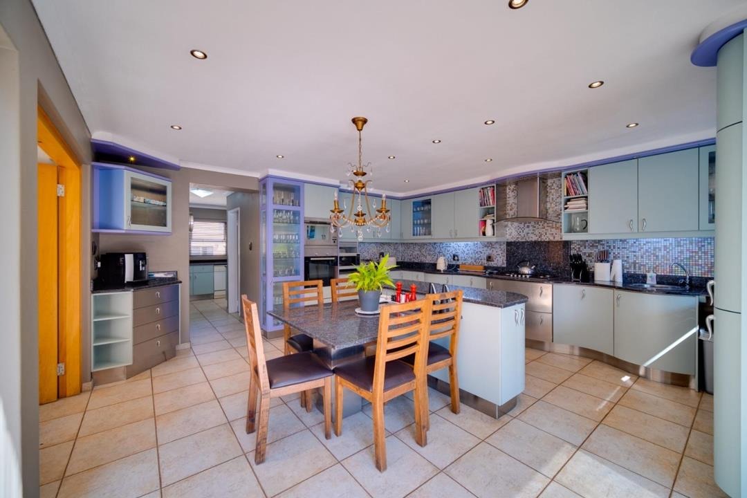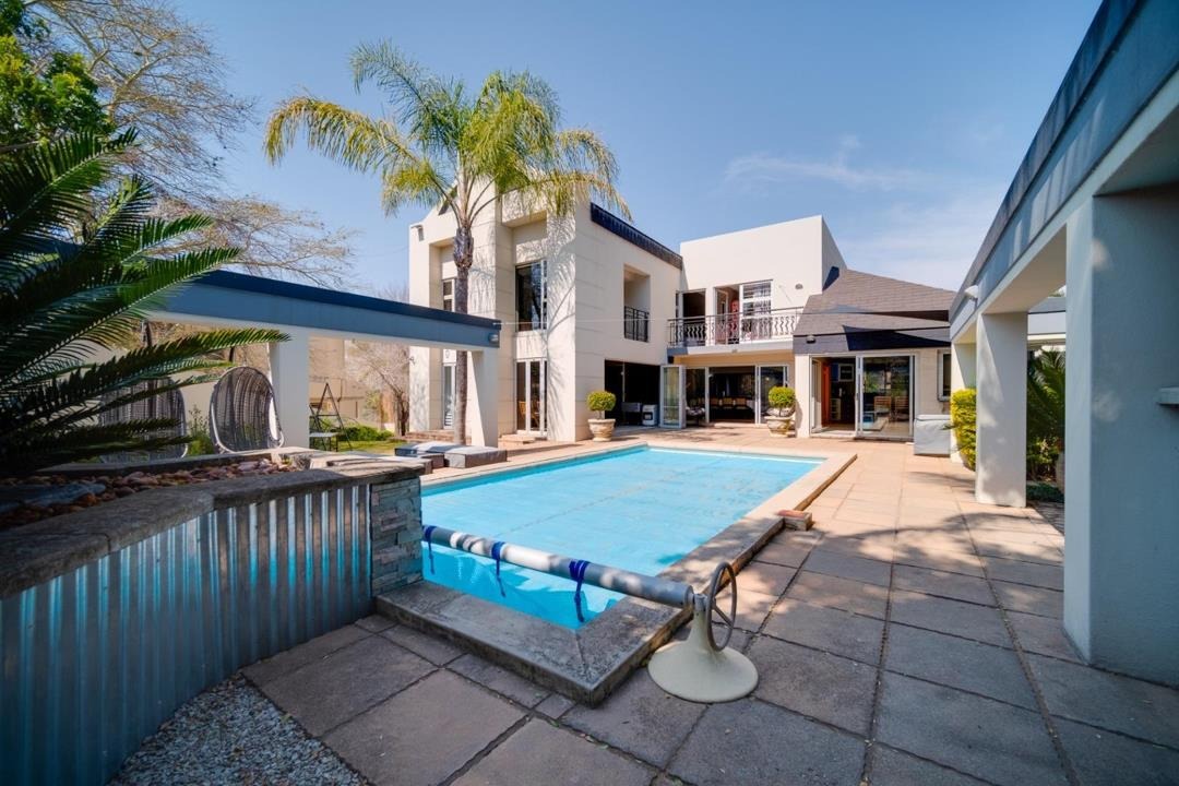 The home features multiple spacious living areas flowing onto a large covered patio with stacking doors, a built-in braai, and pizza oven, all overlooking the heated swimming pool and beautifully landscaped garden. The gourmet open-plan kitchen comes fully fitted with a gas hob, eye-level oven, granite countertops, walk-in pantry, scullery, and laundry.