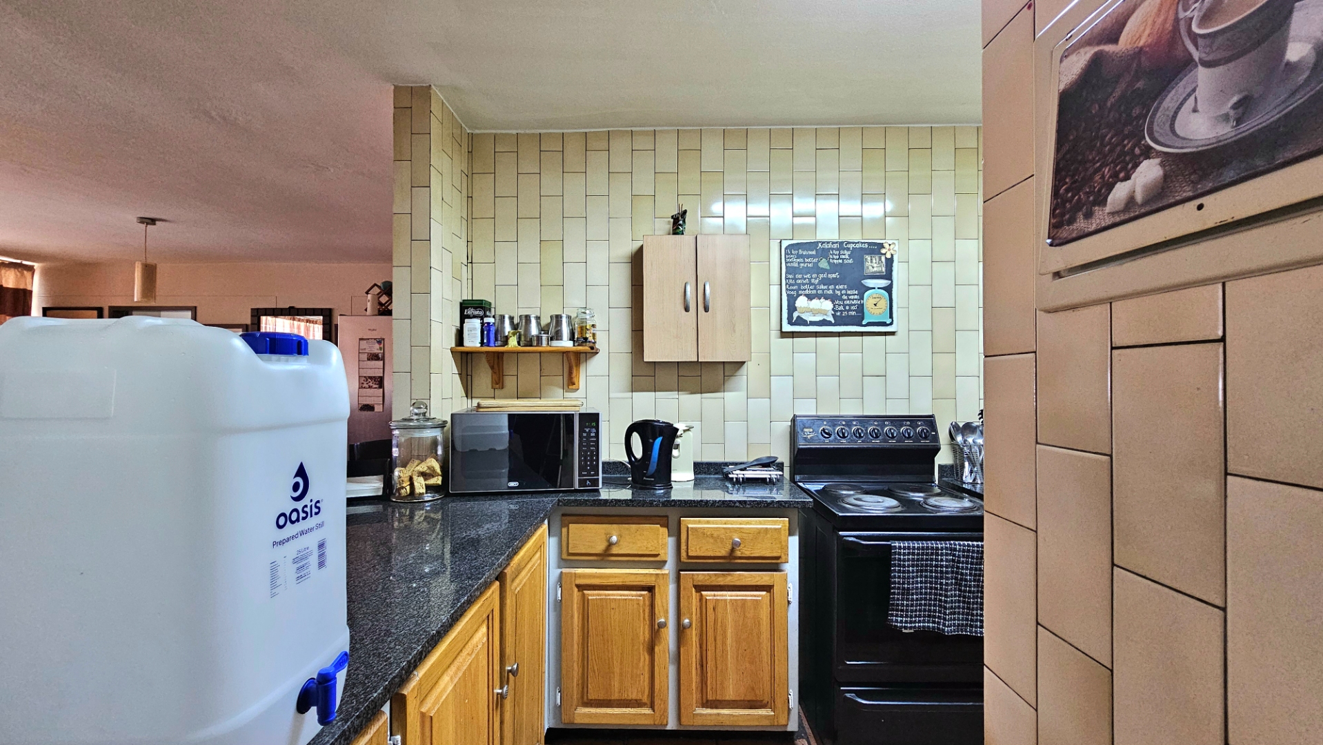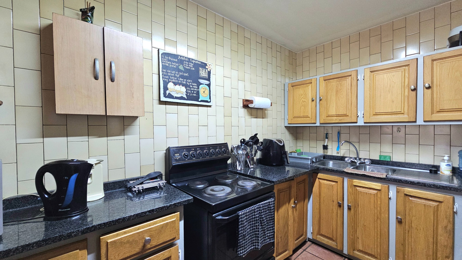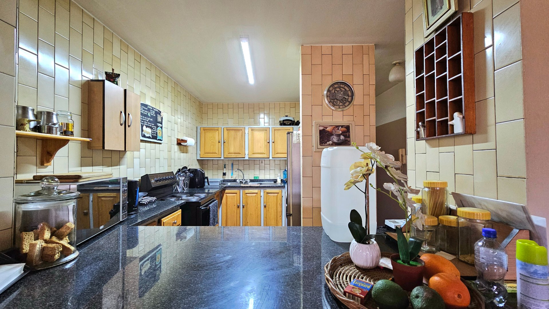 The open-plan living and dining area flows seamlessly into a well-appointed kitchen, allowing you to stay part of the conversation while preparing meals. The kitchen includes plenty of built-in cupboards and space for a washing machine, combining functionality with style.