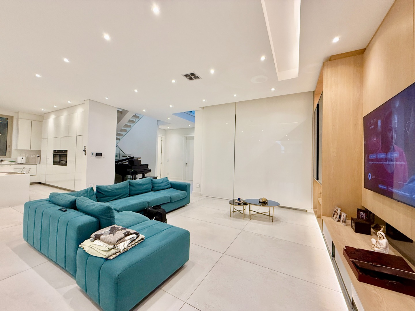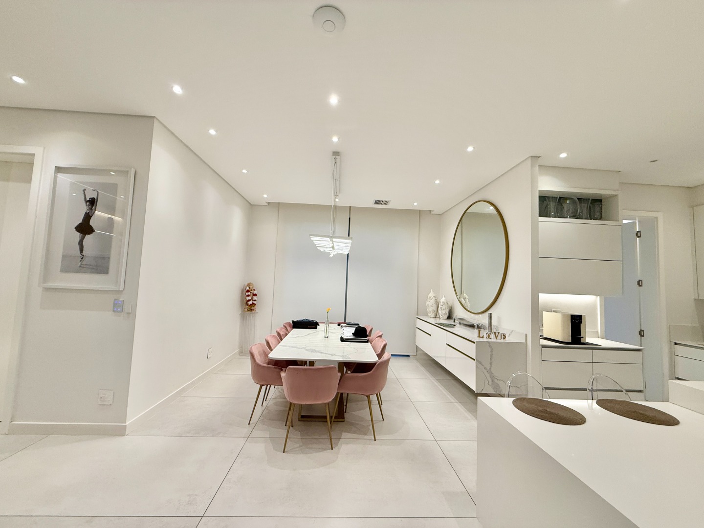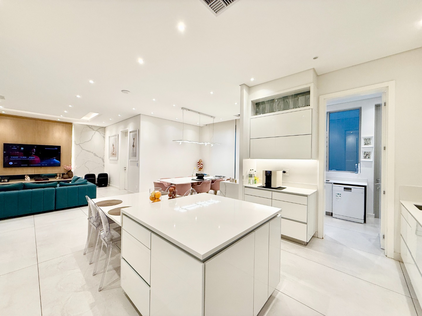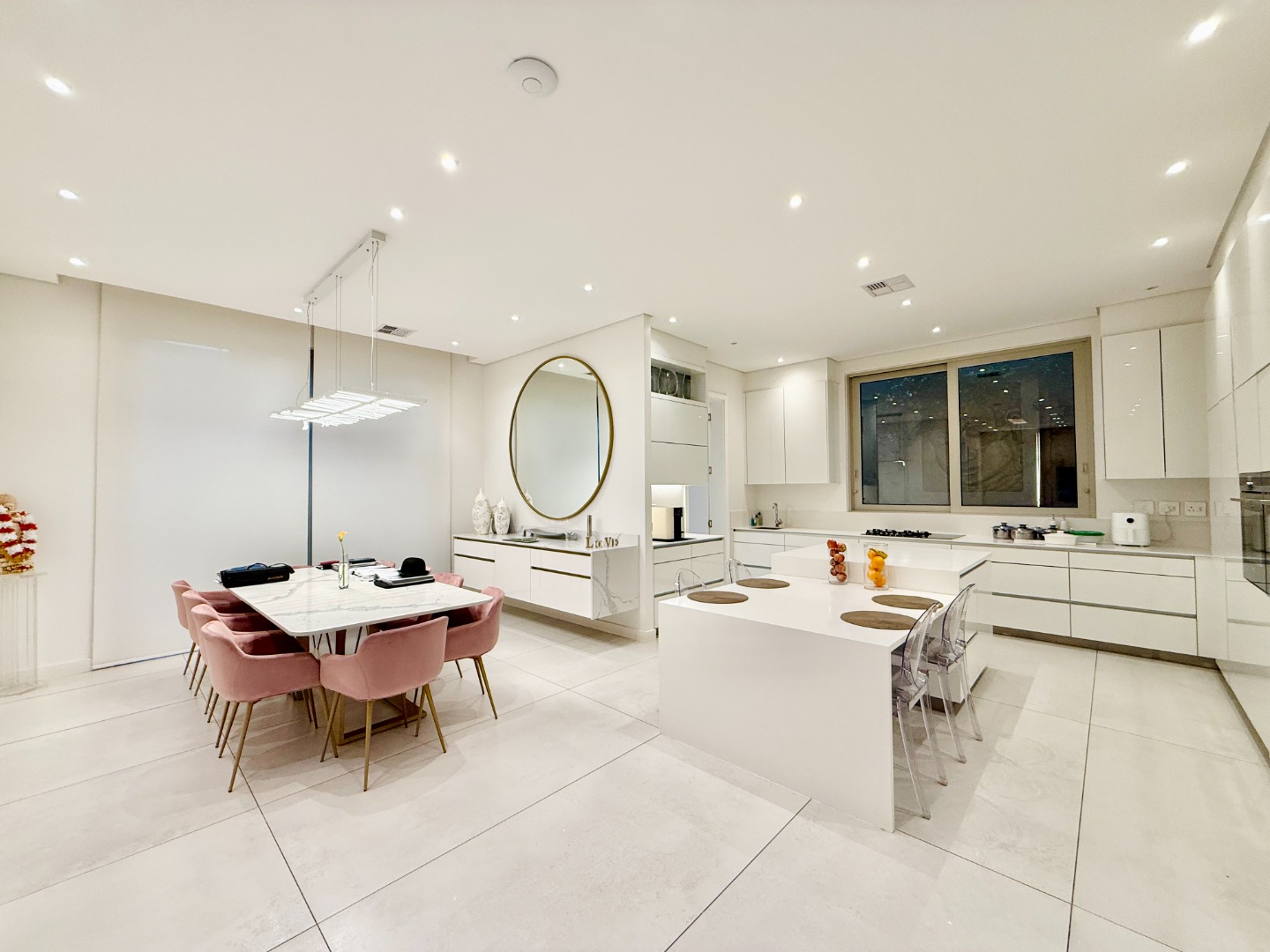At the centre of the home lies a designer chef’s kitchen, a true showpiece finished in sleek white cabinetry with a large central island and premium fittings throughout. The space combines form and function effortlessly, enhanced by a separate scullery that ensures discretion and convenience.