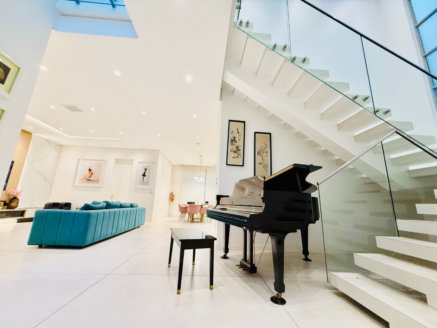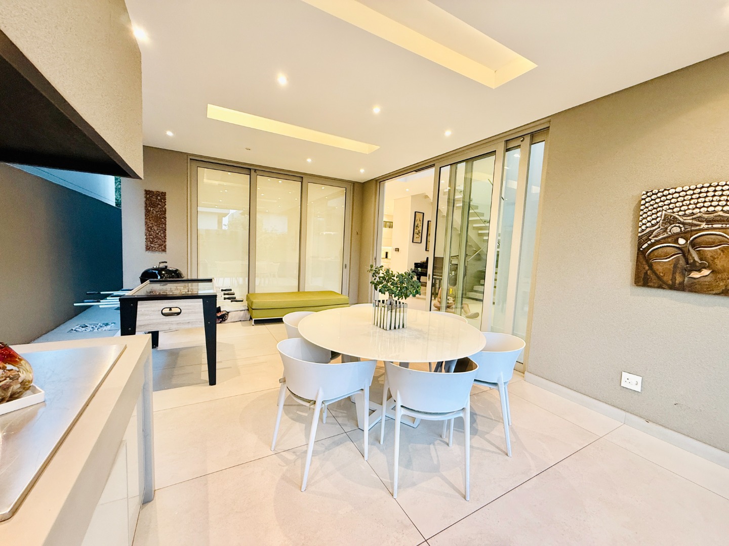 From the moment you step through the grand double-volume entrance hall, you are welcomed by natural light cascading through architecturally placed skylights, highlighting the home’s clean lines and striking floating staircase. The expansive open-plan living and dining areas exude both warmth and grandeur, beautifully furnished with contemporary pieces that balance style and comfort. Expansive glass sliding doors open onto a covered entertainer’s patio with a built-in braai, overlooking a lush private garden, perfect for hosting elegant gatherings or enjoying serene afternoons at home.